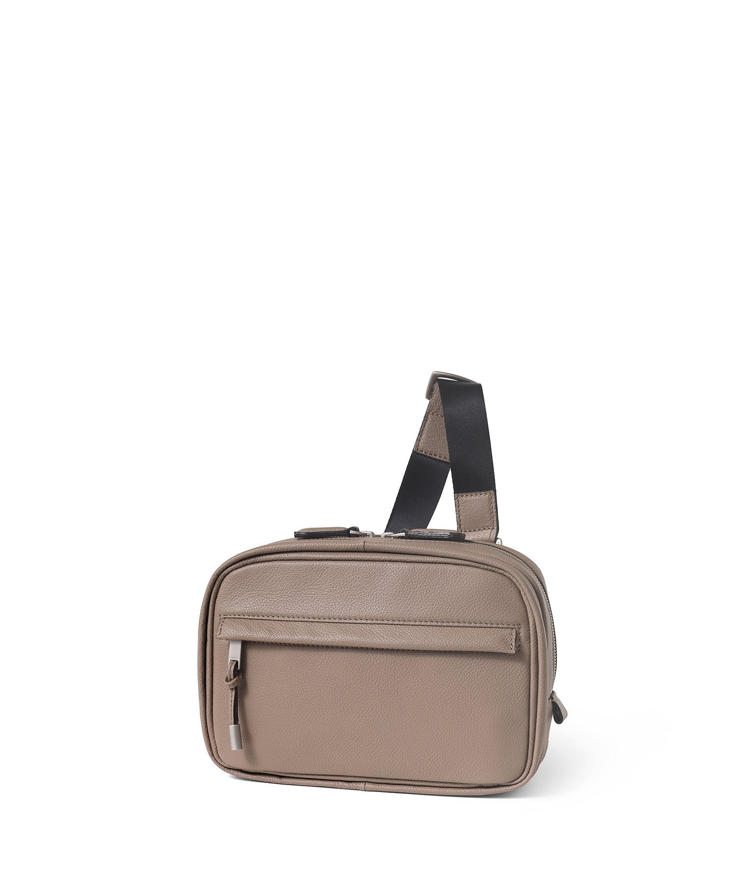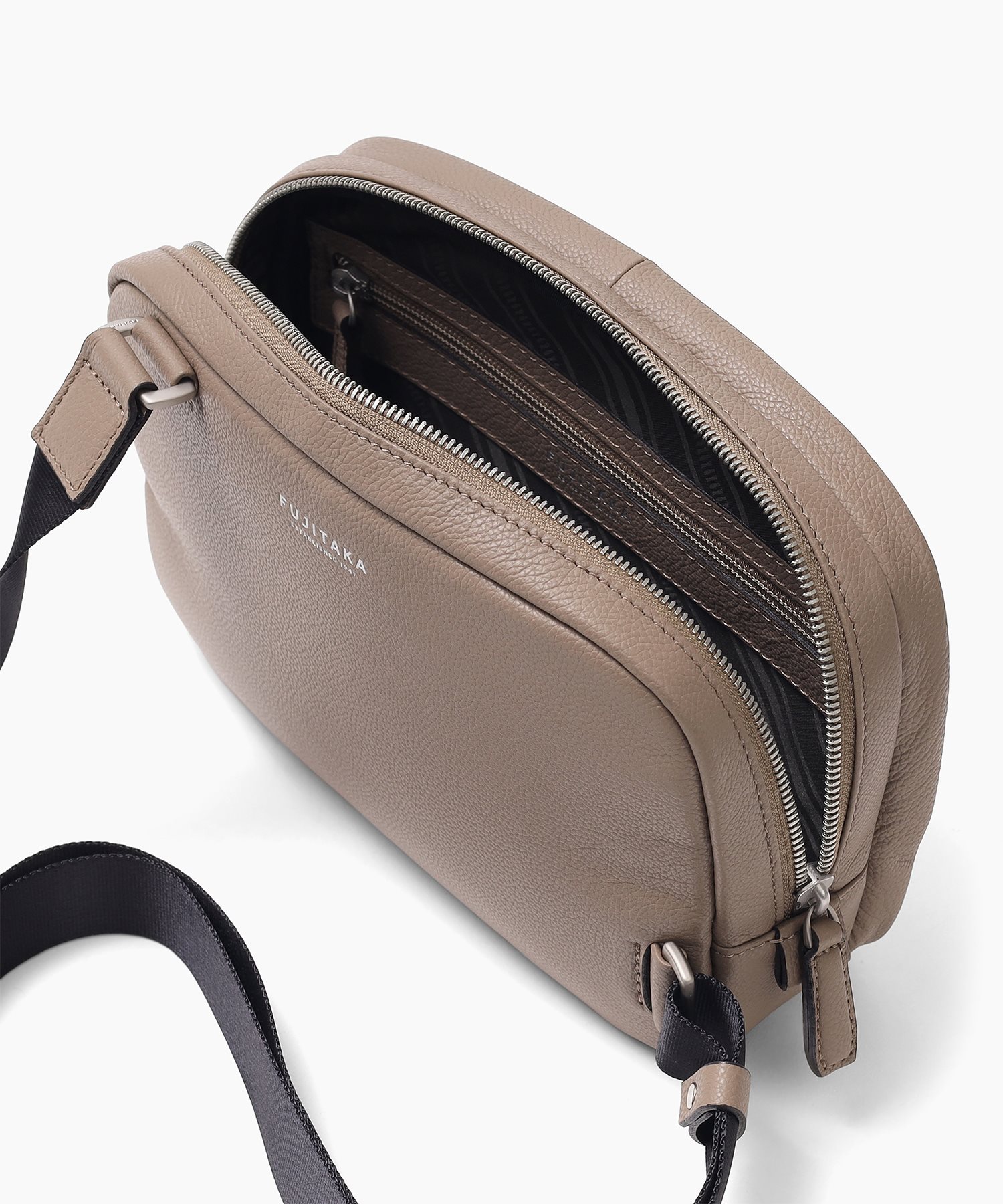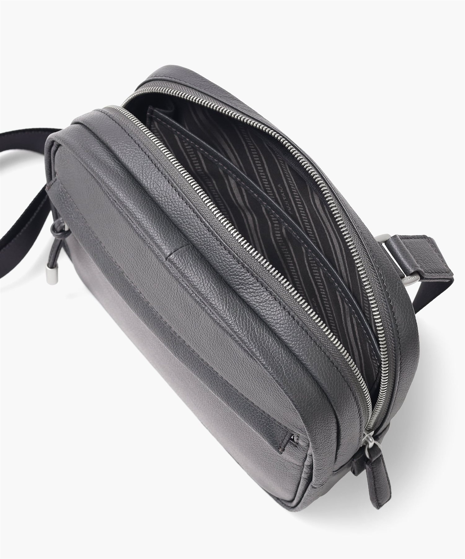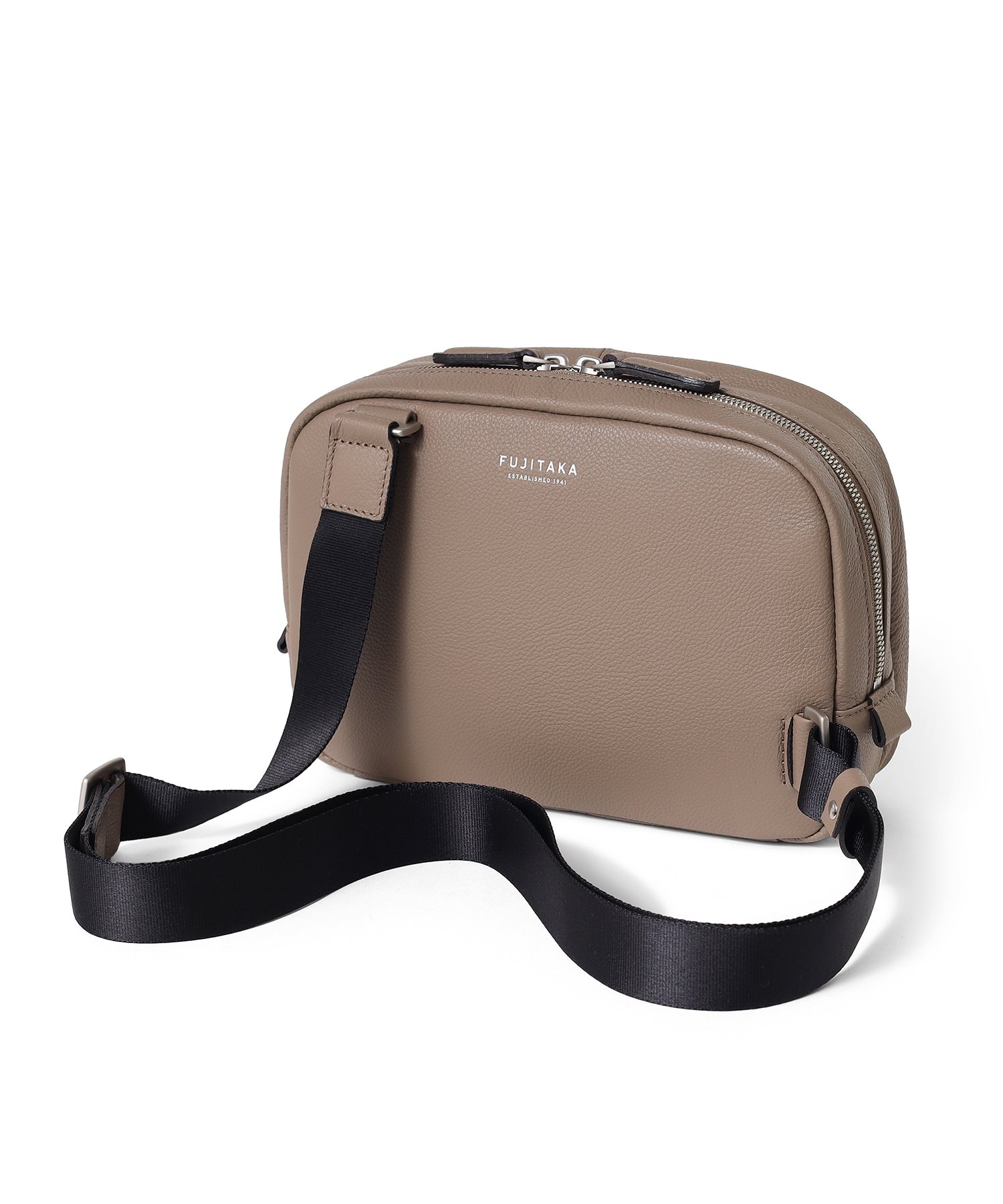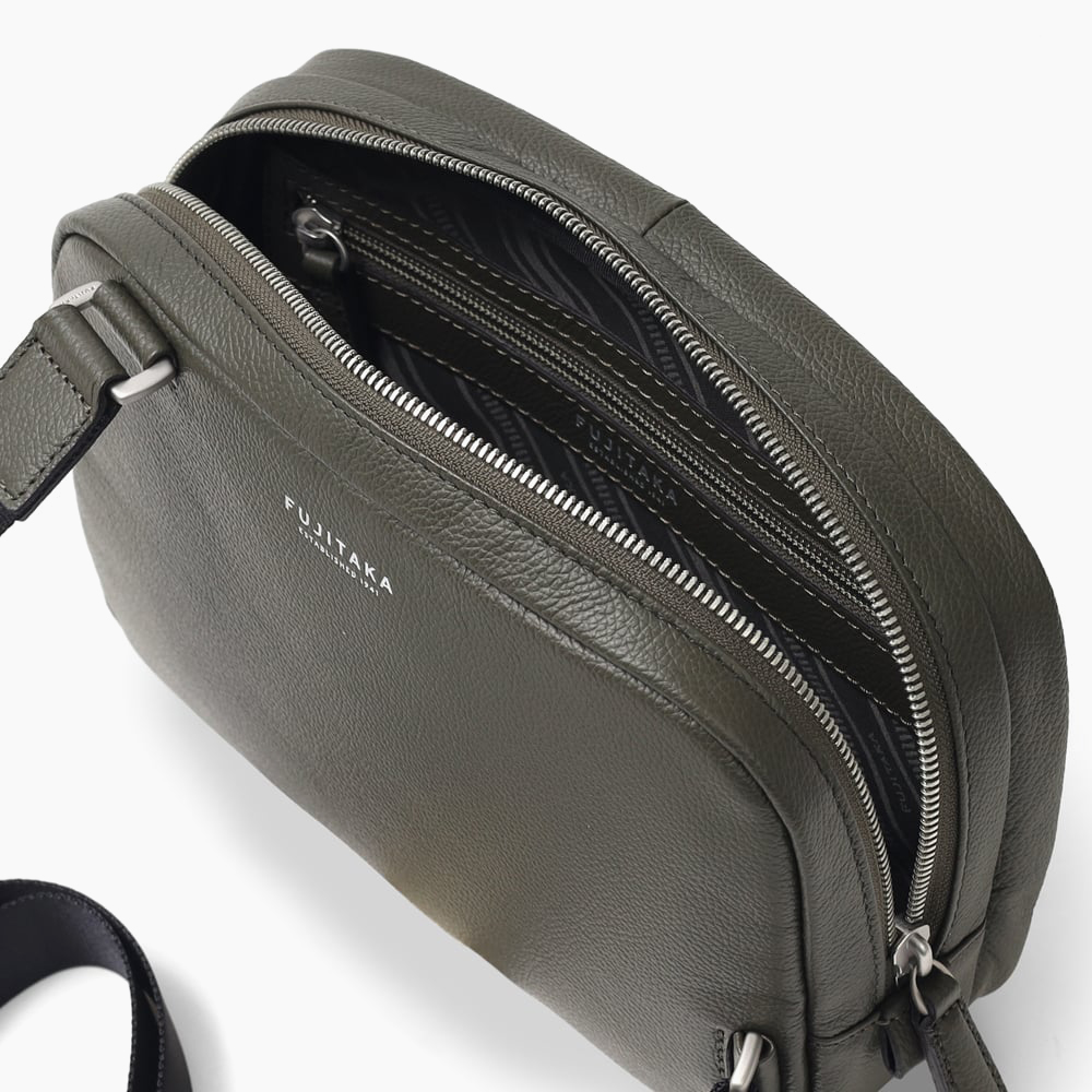 デバイスの収納に適したフジタカのコンパクトサイズのレザースリングバッグ。メインルームにはミニタブレット用のポケットを備えており、コンパクトながらも500mlのペットボトルも収納可能です。マットな仕上げの柔らかい手触りが印象的で、高スペックながらやさしいクラス感のある雰囲気を醸し出しています。