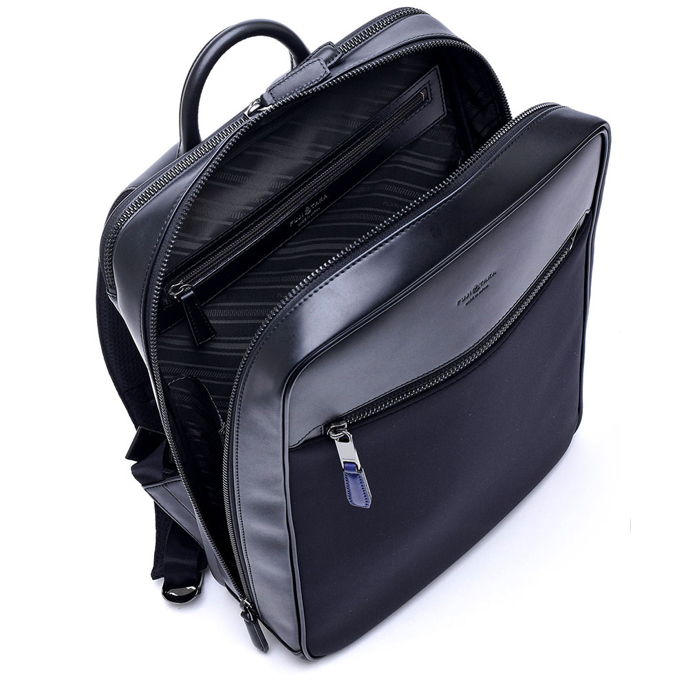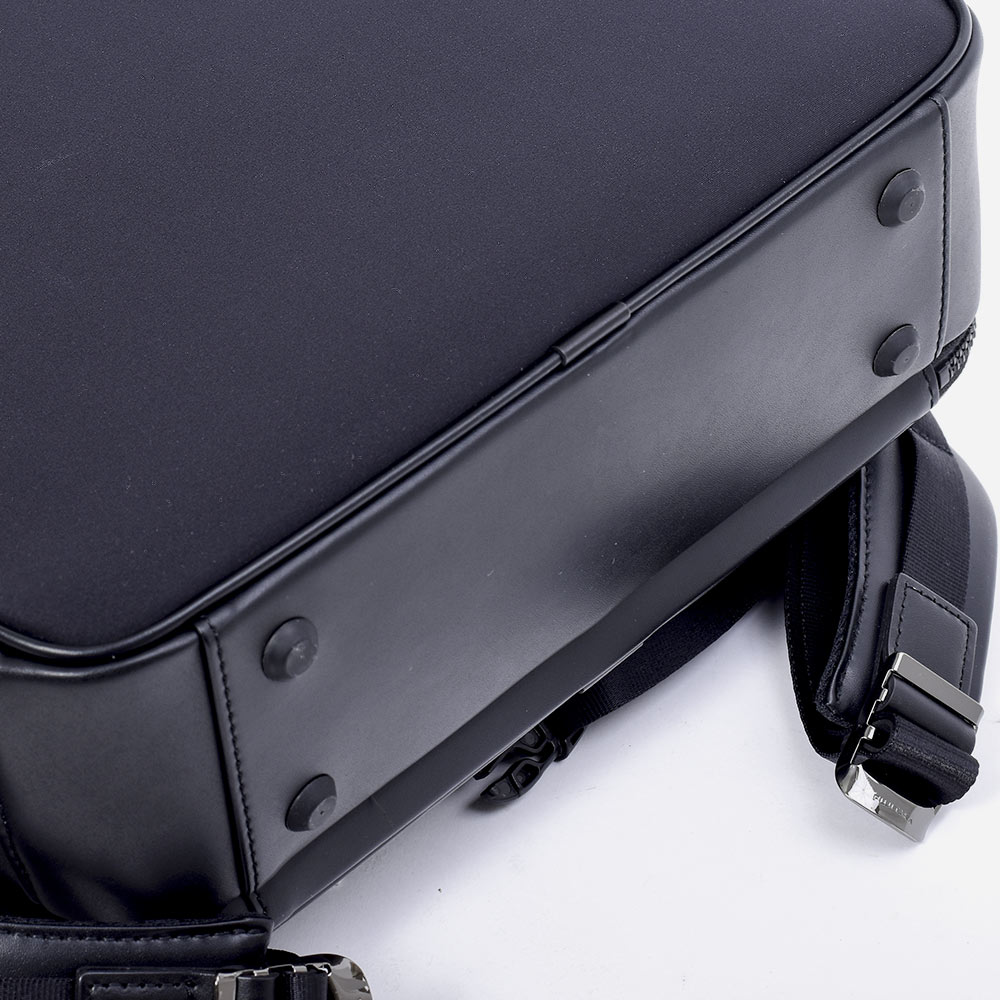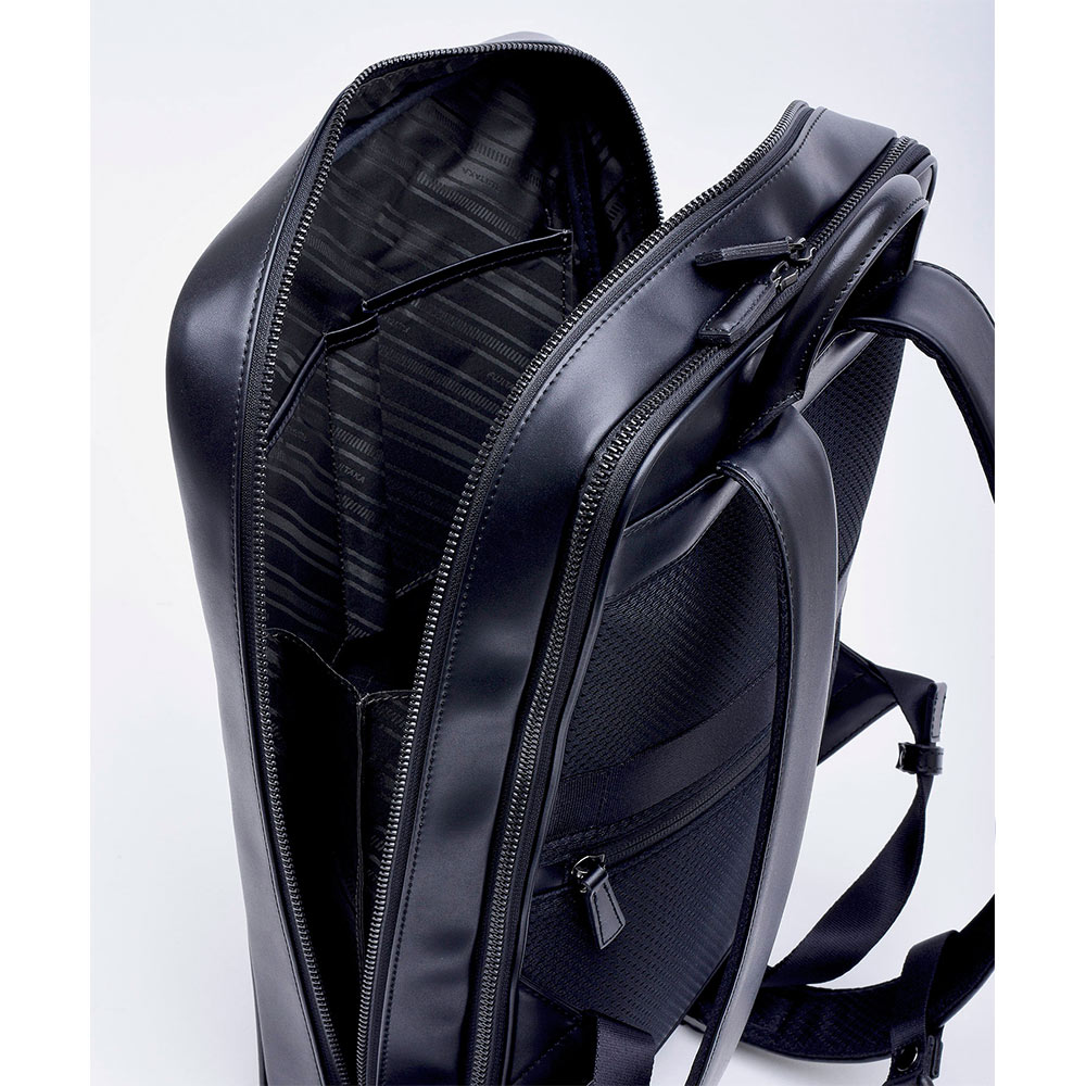 主素材に環境配慮型素材を使用したフジタカ ルフトシリーズのA4サイズの2気室仕様のビジネスリュック。パソコンの収納に最適なPCポケットも設けられています。付属革にはスコッチガード撥水加工が施された牛革を採用。主素材の防水性も含め雨の日でも安心してお使いいただけるリュックです。