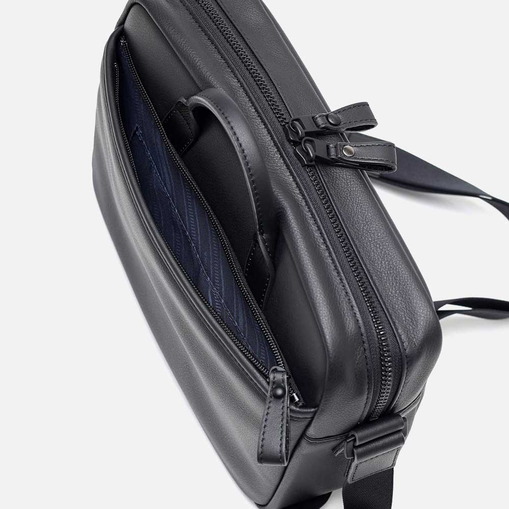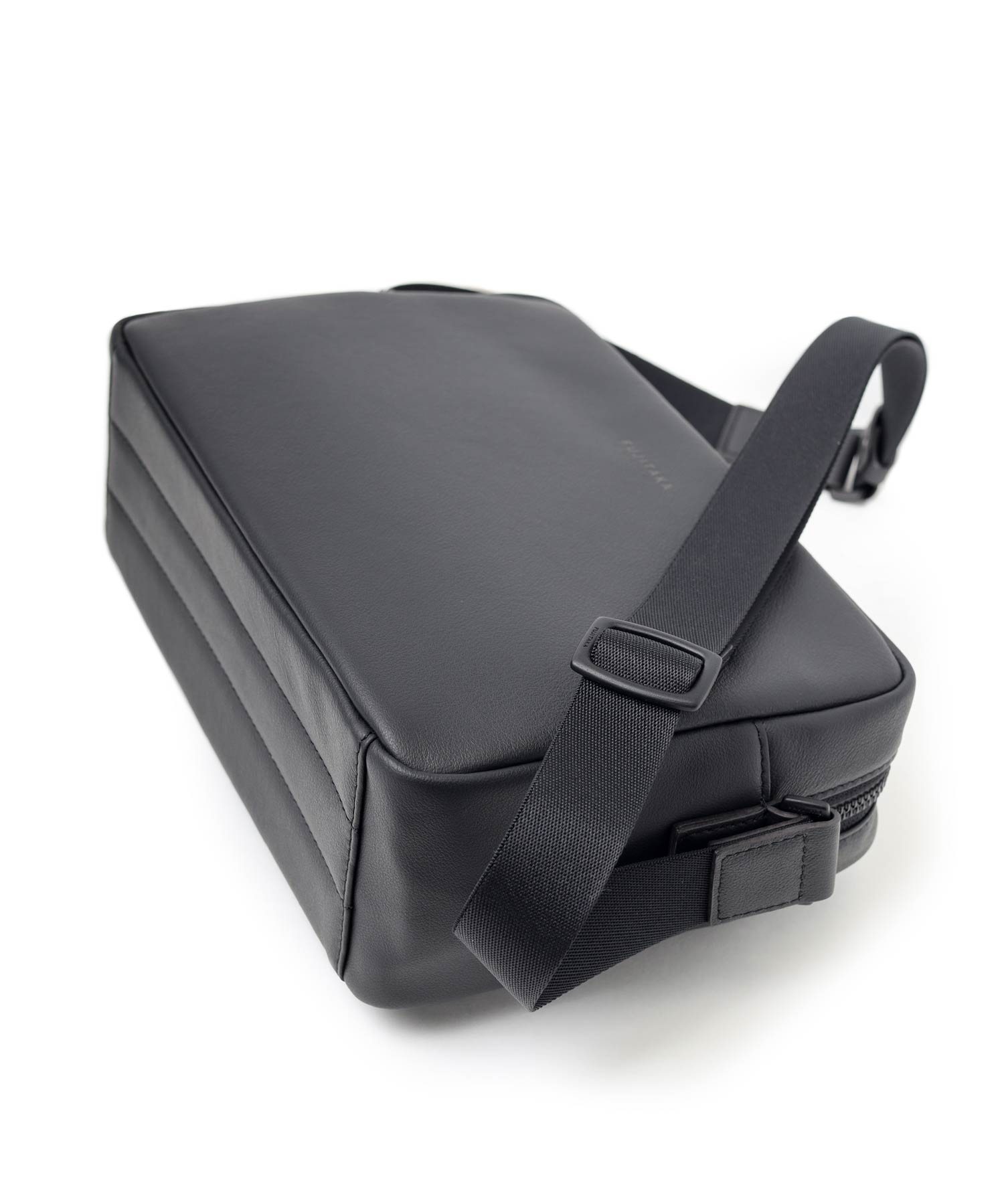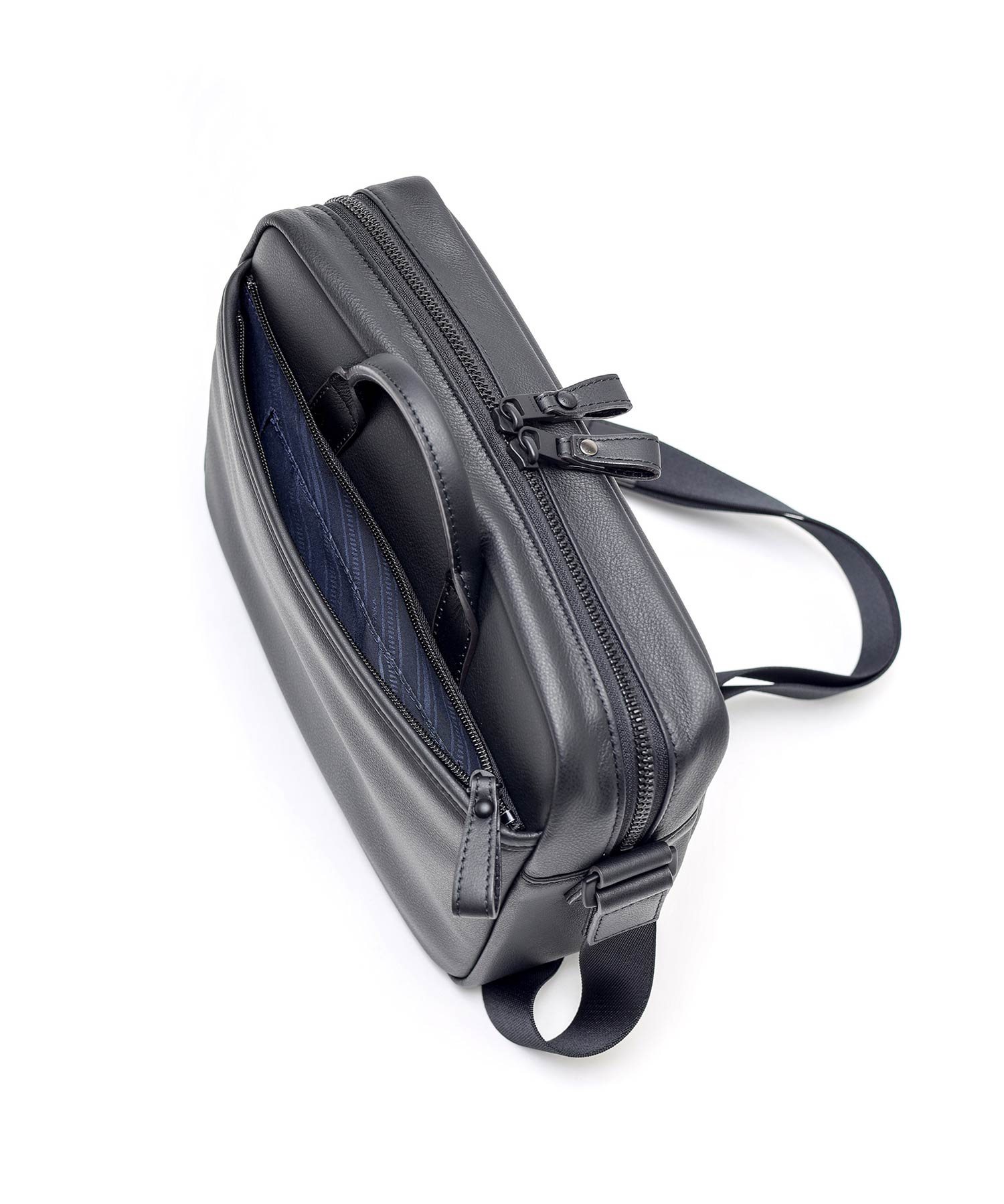 厳選されたヨーロッパ原皮に上品な肌目が美しいLWG ゴールドランク認定のイタリア高級スムースレザーを贅沢に使用したFUJITAKA LOCUSシリーズのハンドル付きのB5サイズのショルダーバッグ。家具やプライベートジェットの内装に使用される素材は、一般ファッション製品の革検査基準よりも厳しい検査基準をクリアした物性の高い本革です。マット仕上げの柔らかい上品な手触りが印象的で、スムースでありながら傷に強く、高スペックな本革です。