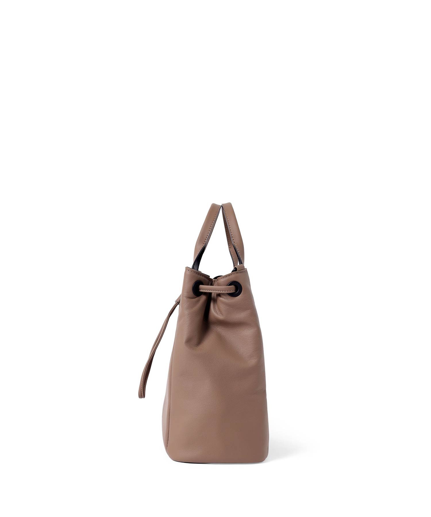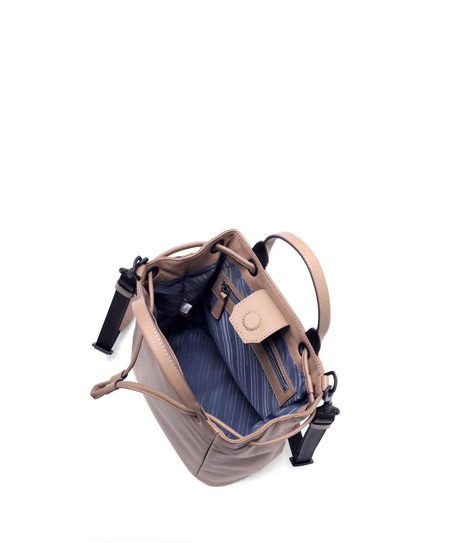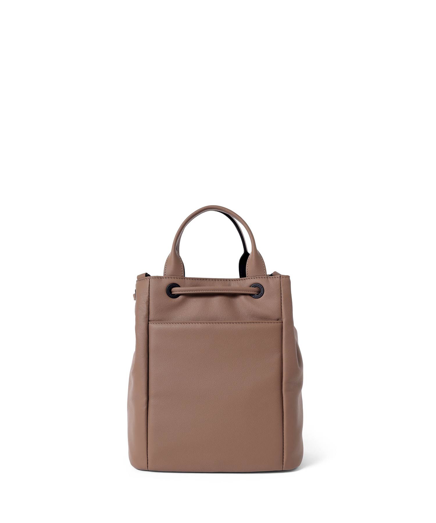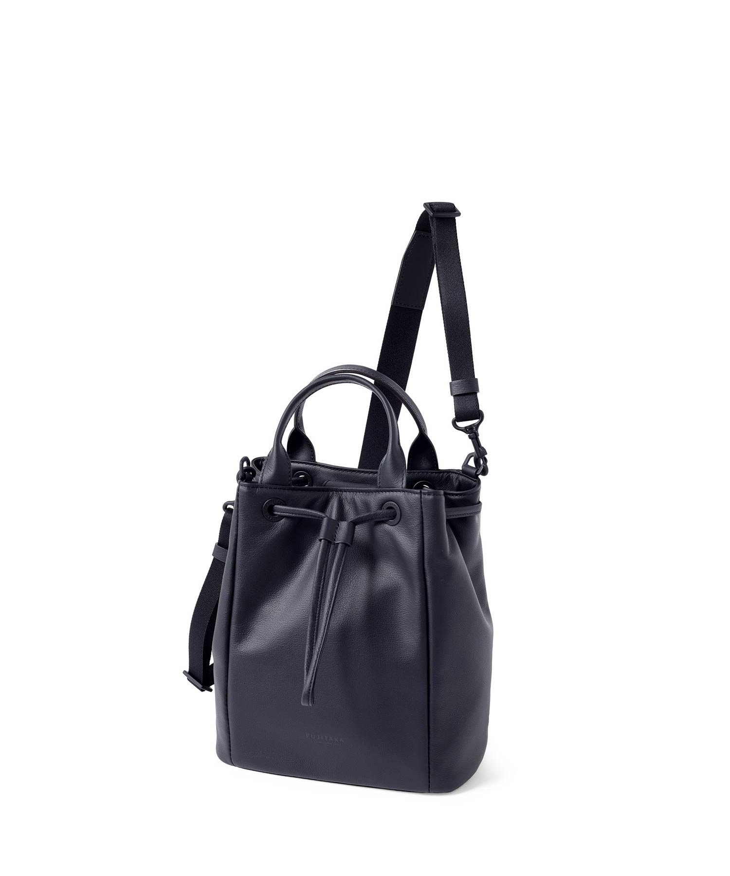 厳選されたヨーロッパ原皮に上品な肌目が美しいLWG ゴールドランク認定のイタリア高級スムースレザーを贅沢に使用したFUJITAKA LOCUS(ロカス)シリーズの巾着型ショルダーバッグ。家具やプライベートジェットの内装に使用される素材は、一般ファッション製品の革検査基準よりも厳しい検査基準をクリアした物性の高い本革です。マット仕上げの柔らかい上品な手触りが印象的で、スムースでありながら傷に強く、高スペックながら優しいクラス感のある雰囲気を醸し出しています。カバンの内側にはペンさし付きのミニポケットを備えています。カバンの背側にもマグネットタイプのポケットがあり、すぐに取り出したい小物類の収納に便利です。