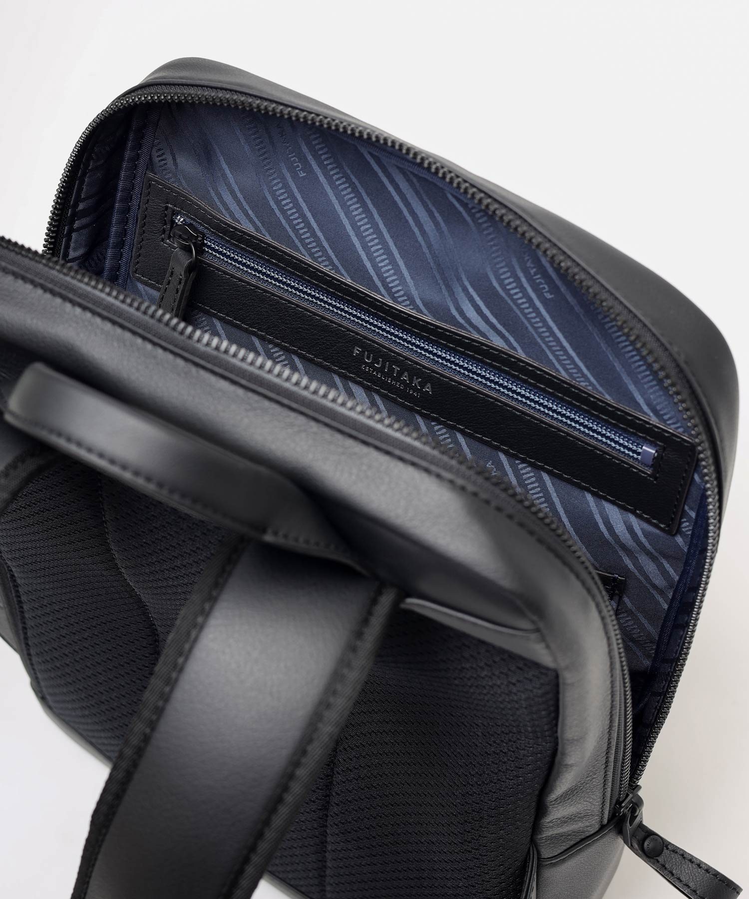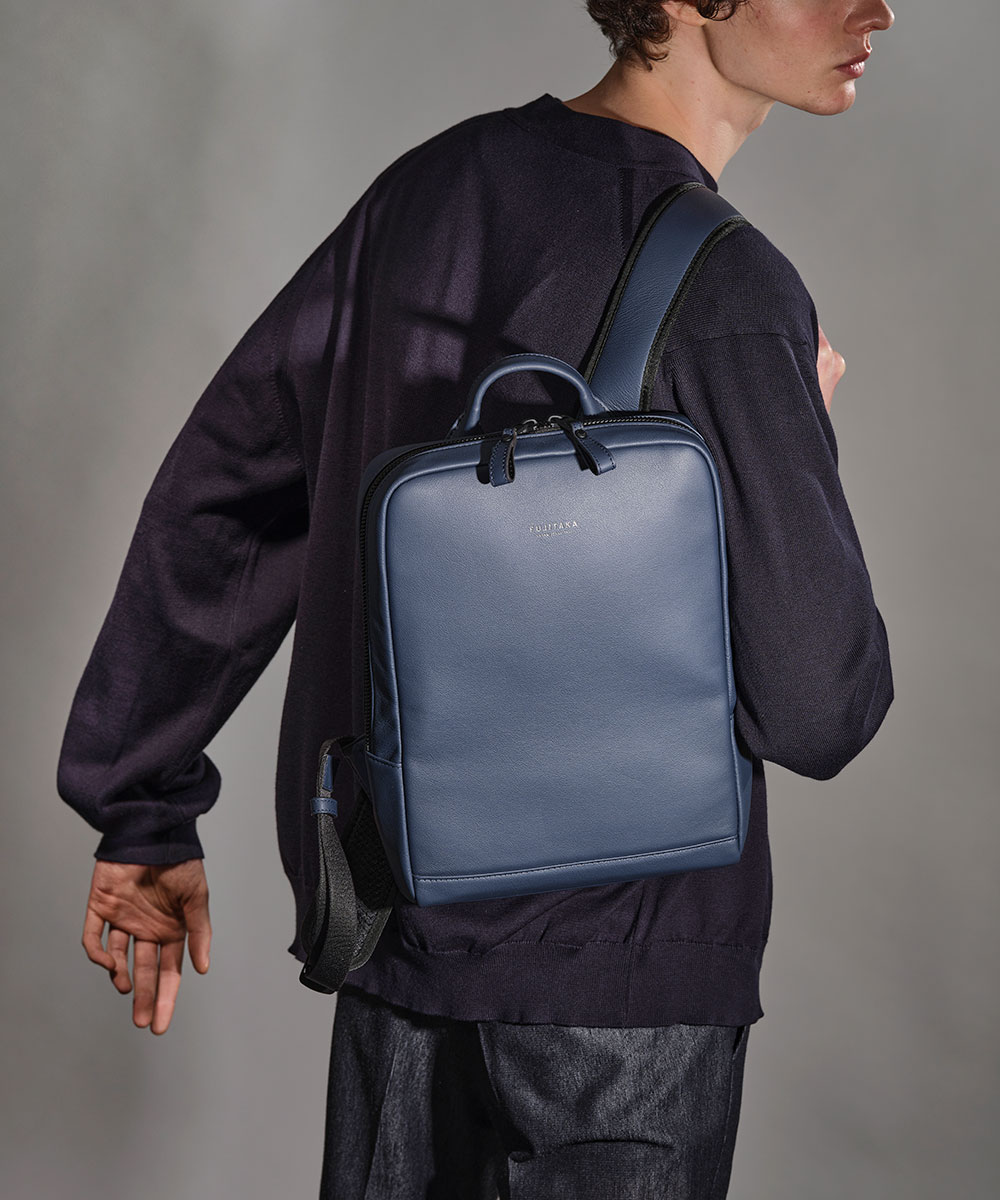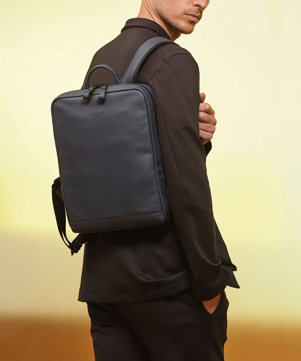 厳選されたヨーロッパ原皮に上品な肌目が美しいLWG ゴールドランク認定のイタリア高級スムースレザーを贅沢に使用したFUJITAKA LOCUSシリーズのA4レザーリュック。背面は色落ちや使用感を考慮したポリエステル素材を採用しています。