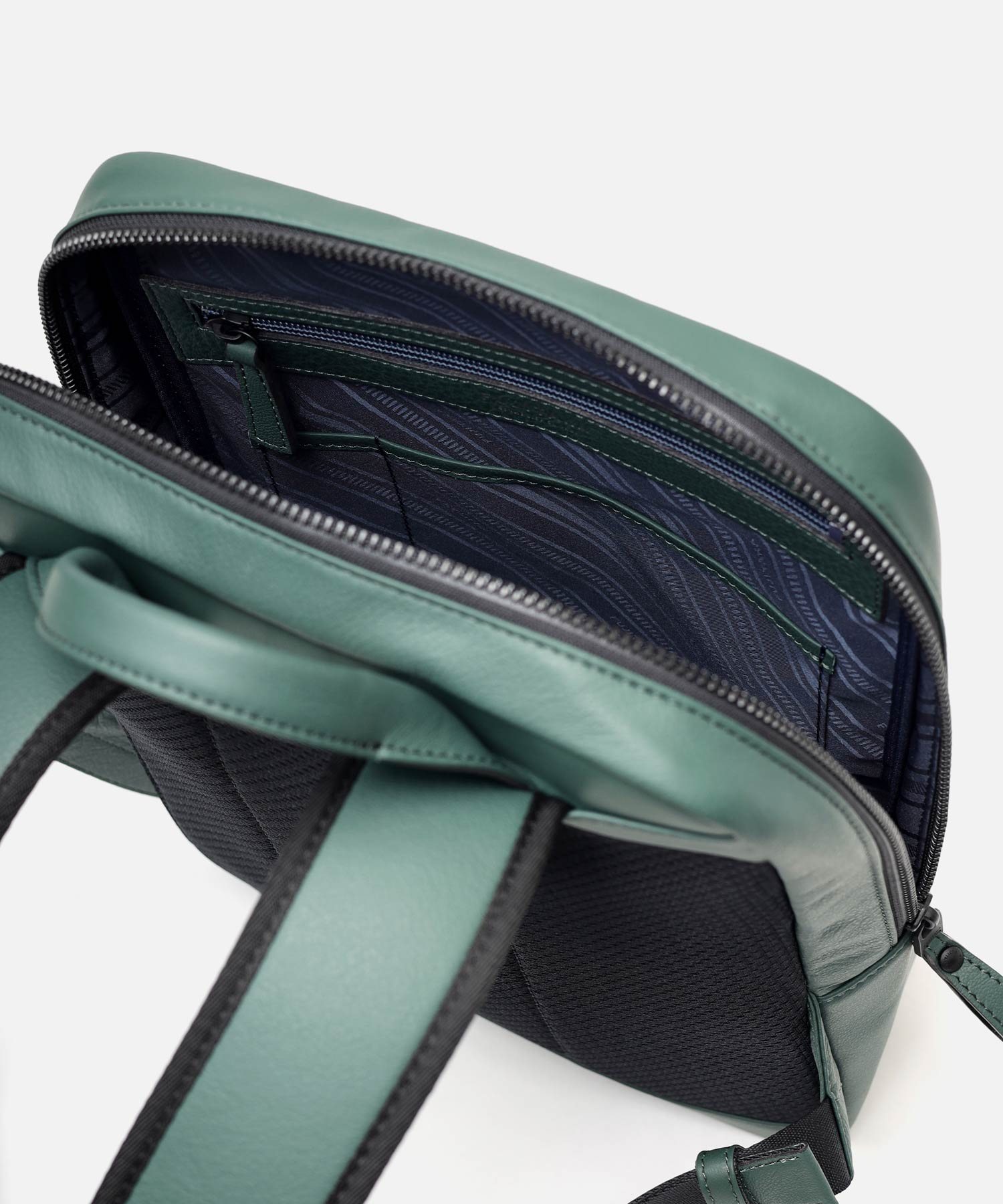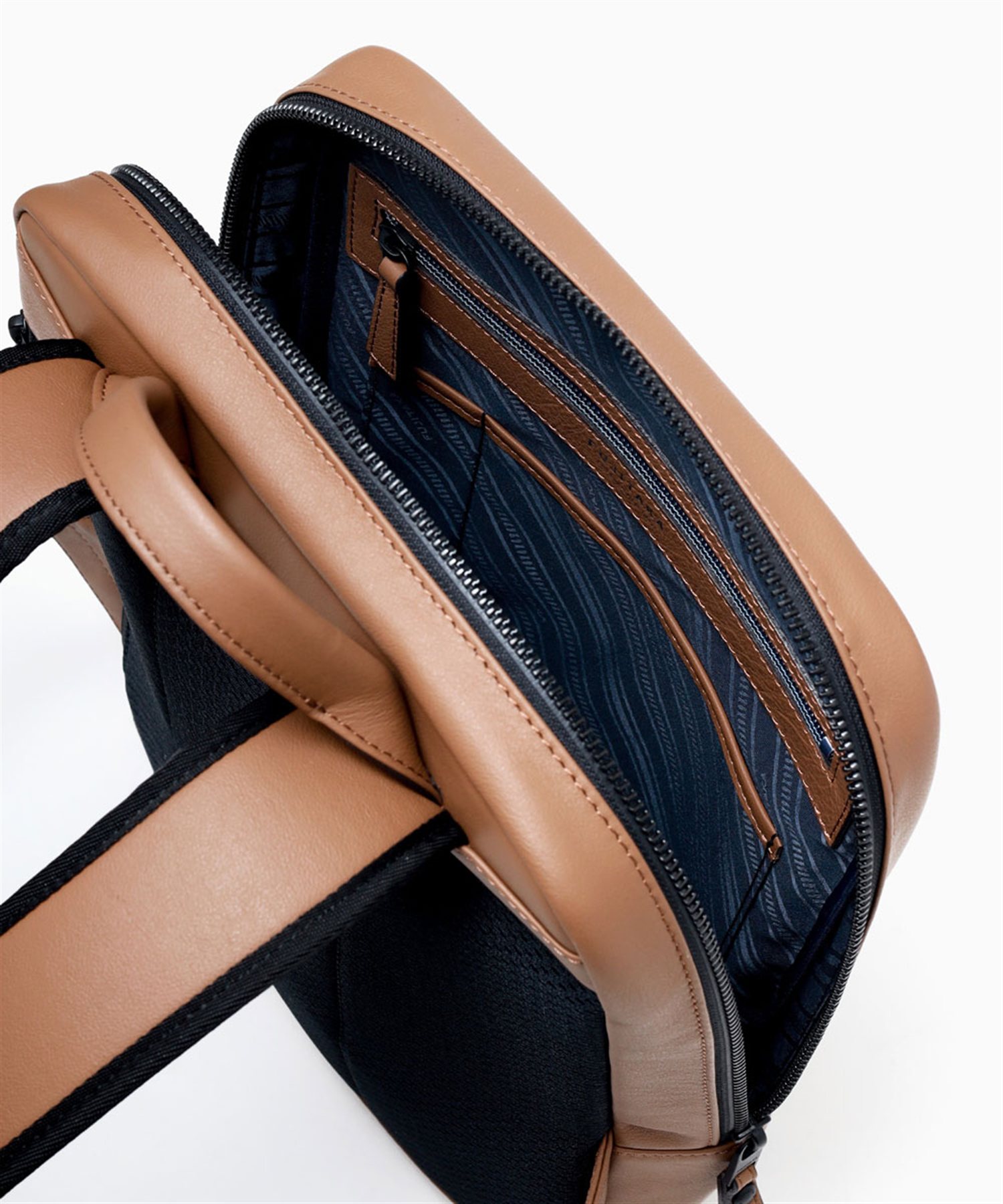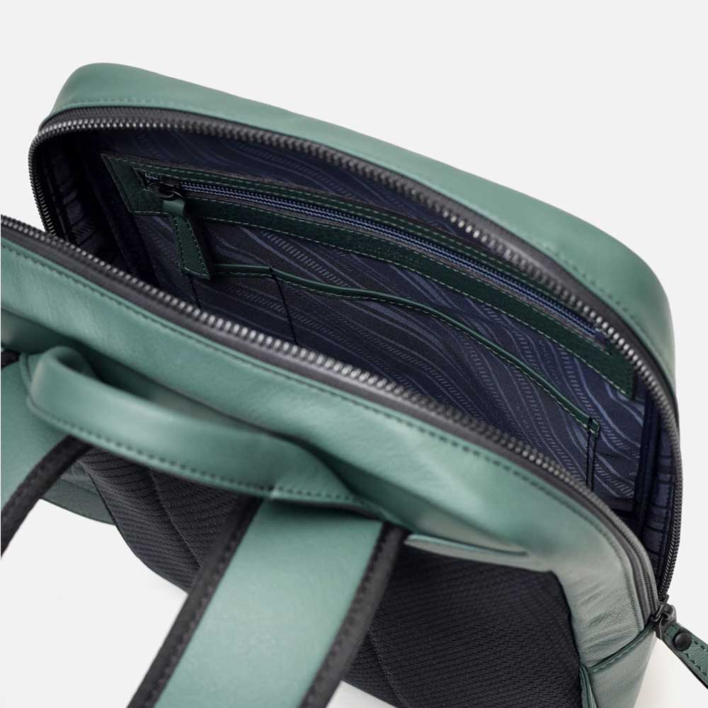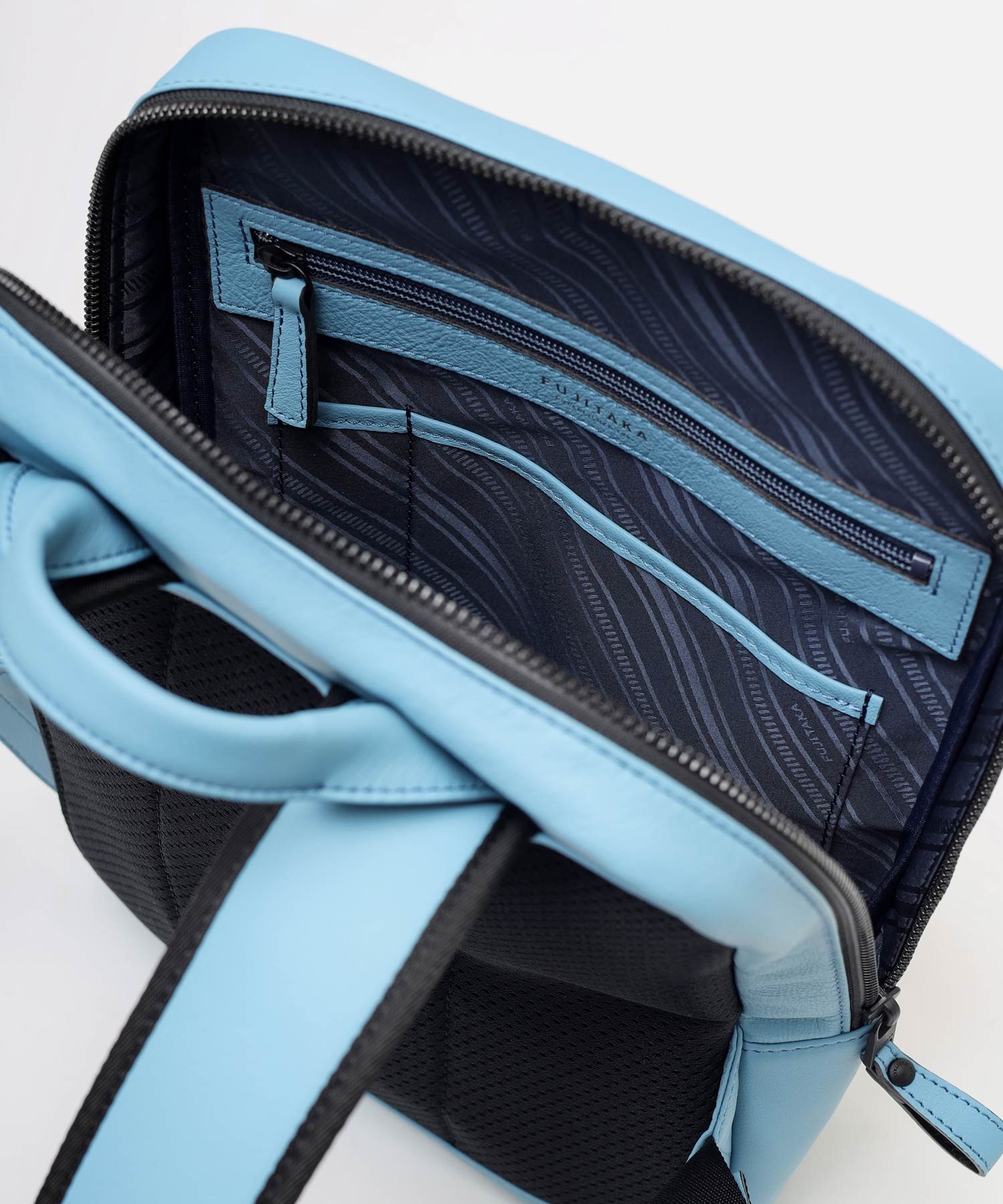 厳選されたヨーロッパ原皮に上品な肌目が美しいLWG ゴールドランク認定のイタリア高級スムースレザーを贅沢に使用したFUJITAKA LOCUSシリーズのA4レザーリュック。背面は色落ちや使用感を考慮したポリエステル素材を採用しています。