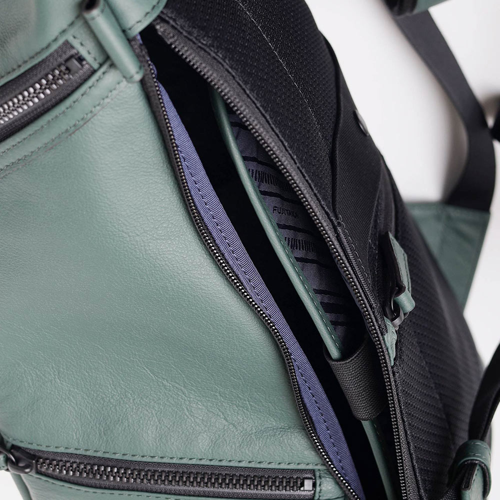 A4サイズ収納対応のレザーリュックです。カバンの内側には13.3インチ対応のクッションPCポケット(幅22x高29cm)があります。内装にはファスナーポケット、ポケット、ペンさしが装備されています。背面は色落ちや使用感を考慮したポリエステル素材を採用、外側には貴重品収納にも便利なファスナーポケットがあります。 背側のサイドにあるファスナーからはメインルーム内にアクセスが可能で、ここからノートパソコン等を直接収納することができます。