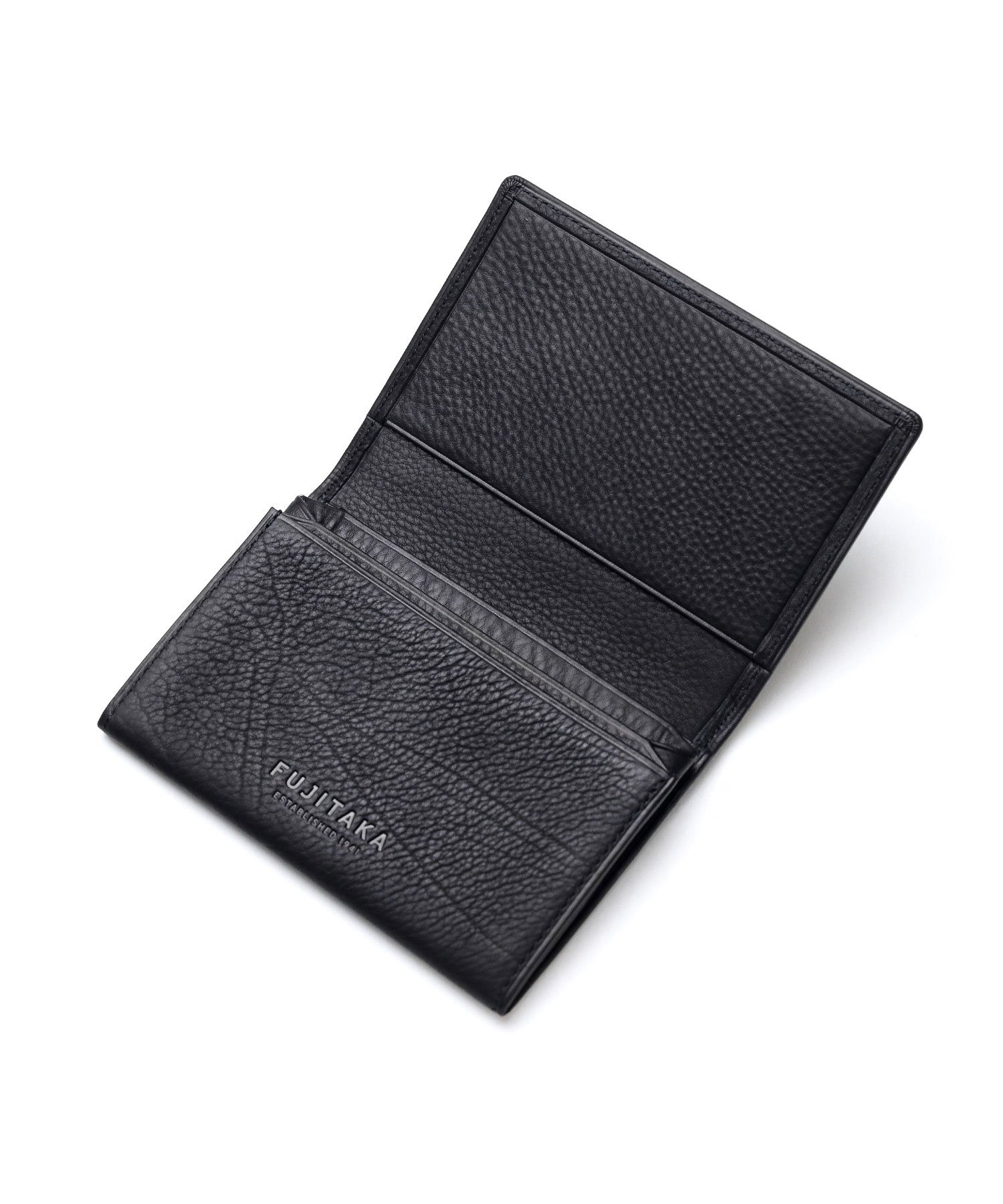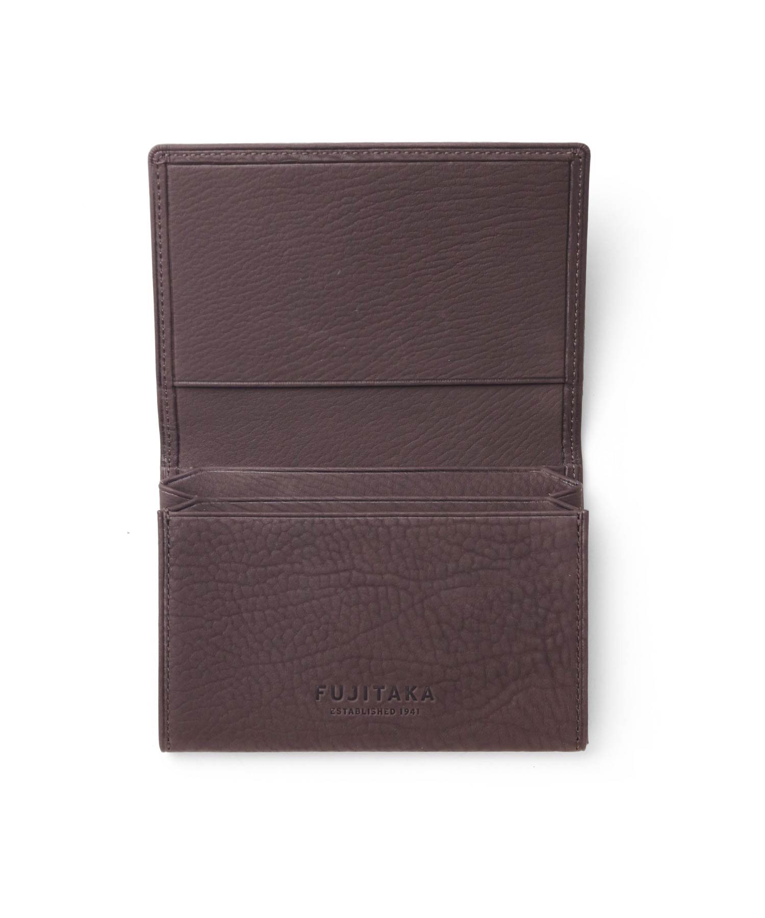 タッチ感の良いカーフレザーを使用した、FUJITAKAのベーシックな名刺入れ。ブランドアイコンのブローチがアクセントとなっており、全体的にすっきりとシンプルなデザインながらも、さり気ないブランド表現で大人の遊び心を演出しています。