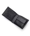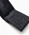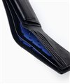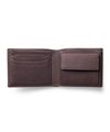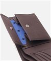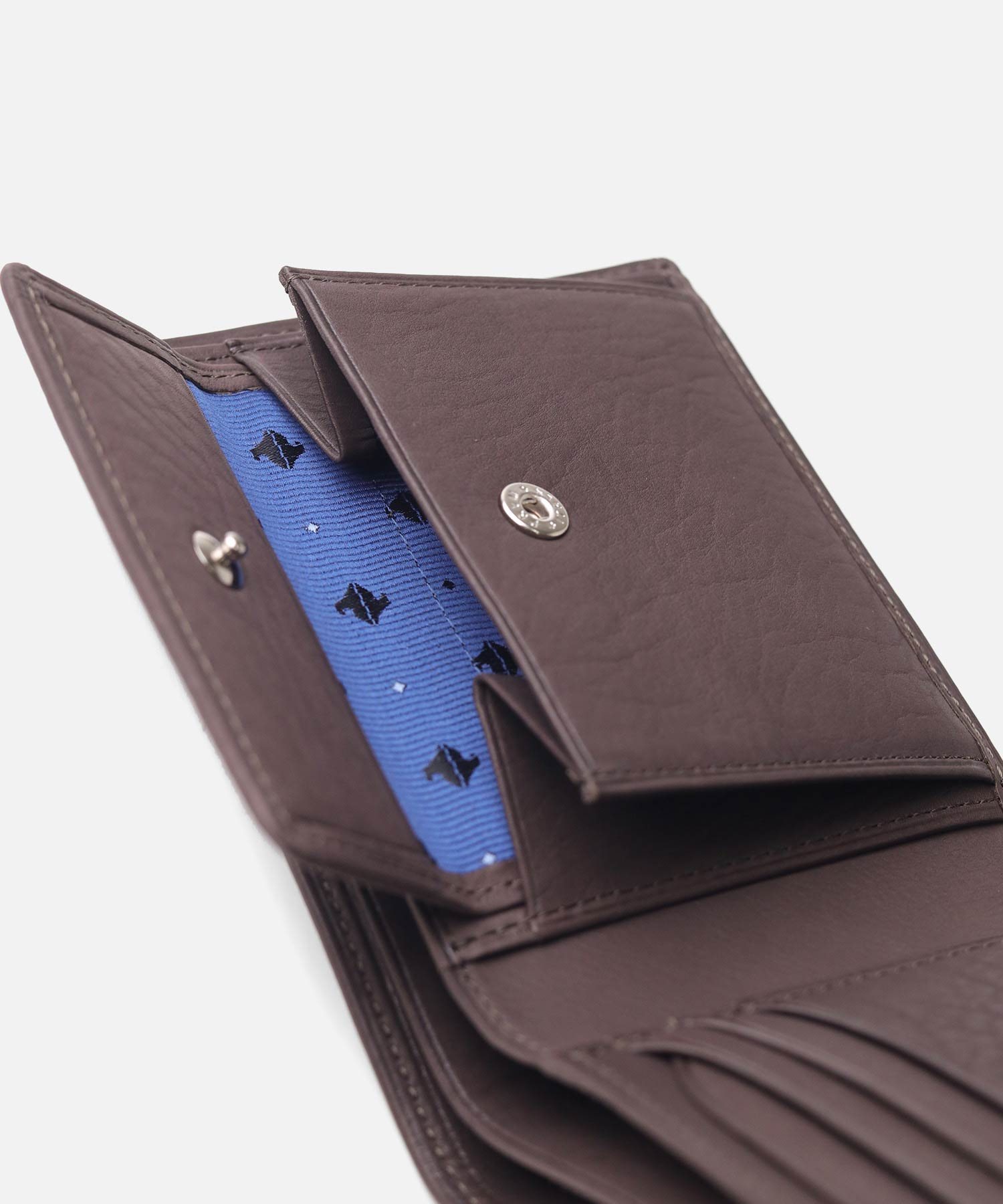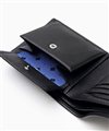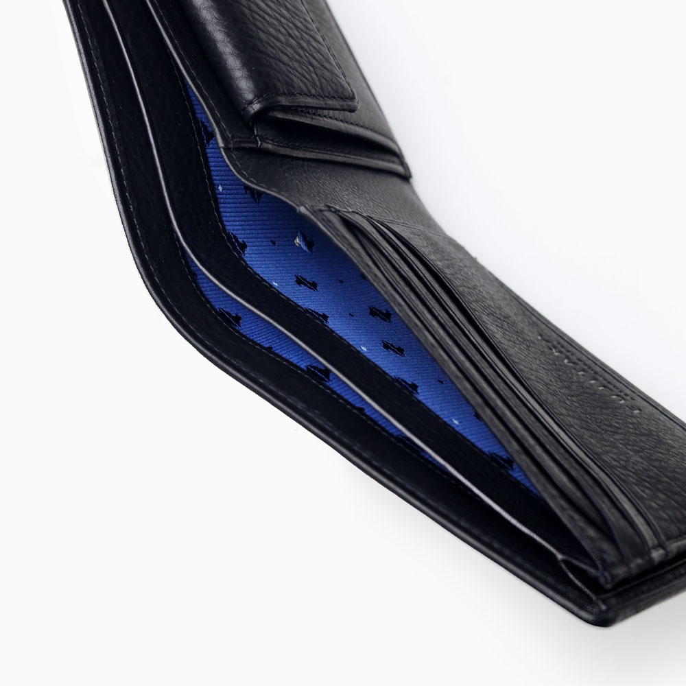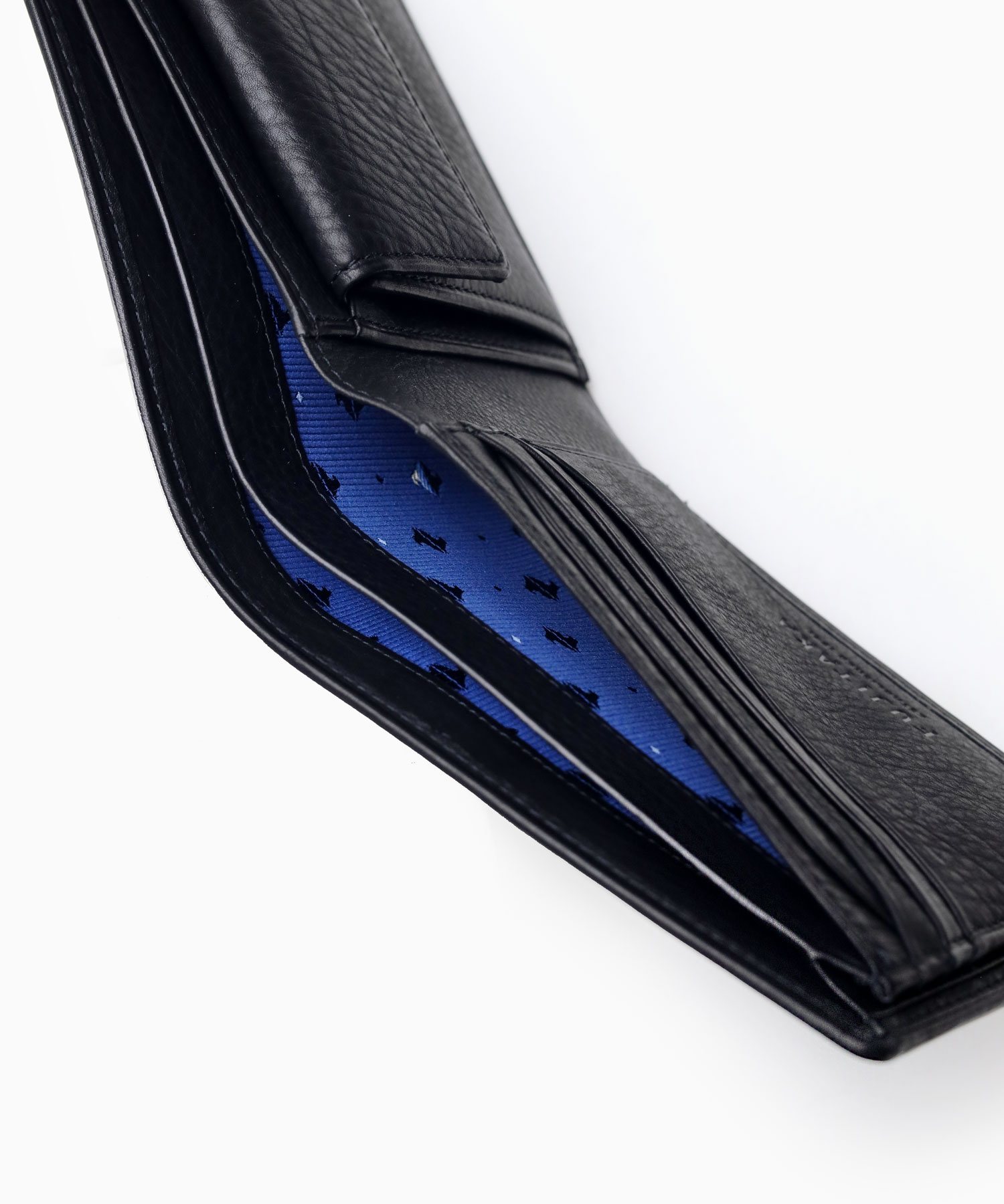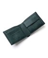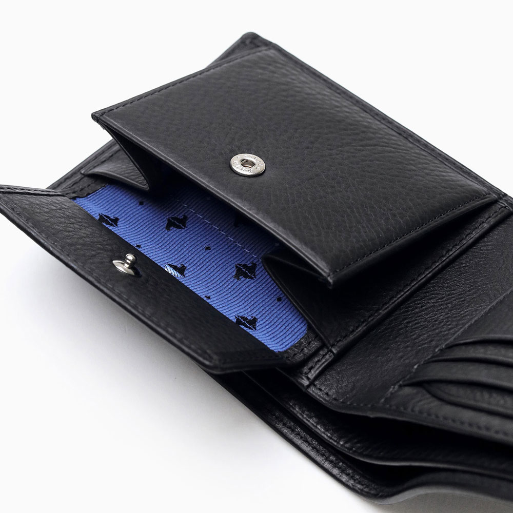 二つ折り財布を開くと、2層タイプの札入れと小銭入れ、ポケットが3つ、カード段が4あります。内装に使用されているオリジナルのジャガード生地がポイントとなっています。また、マチ部分は、アコーディオンの様にマチが外側に折られた風琴マチを採用。薄くすっきりとしたフォルムで、紙幣をマチに引っかかることなく取り出すことが可能です。