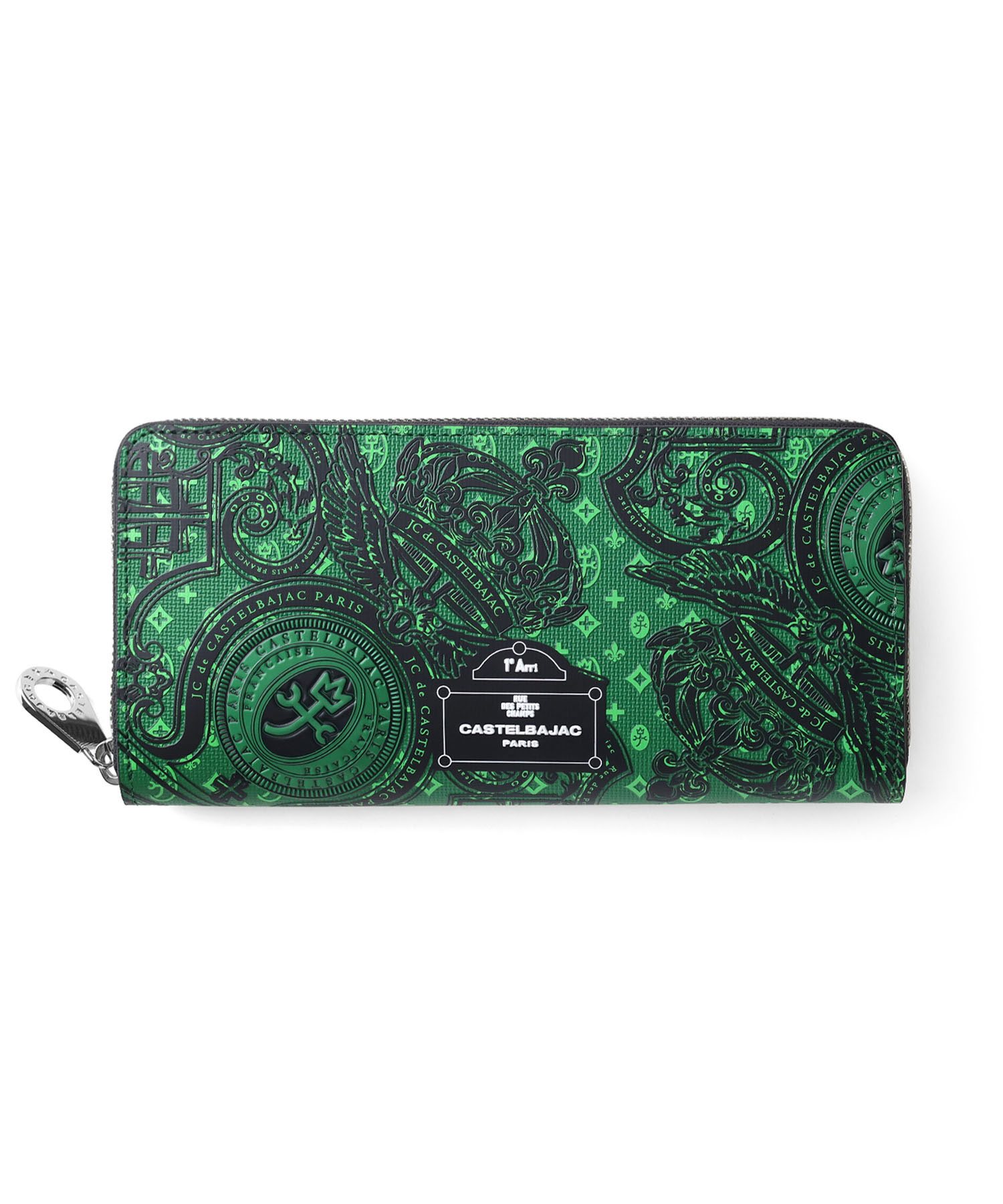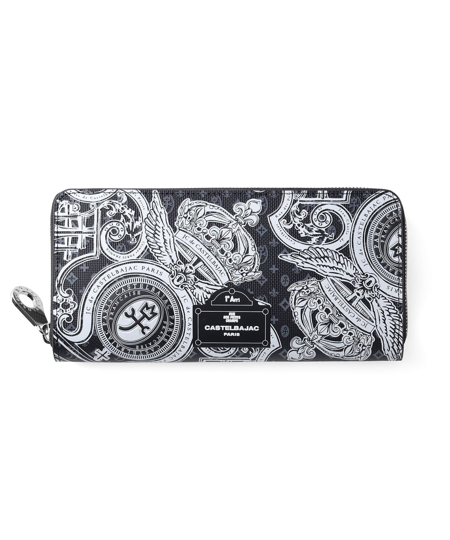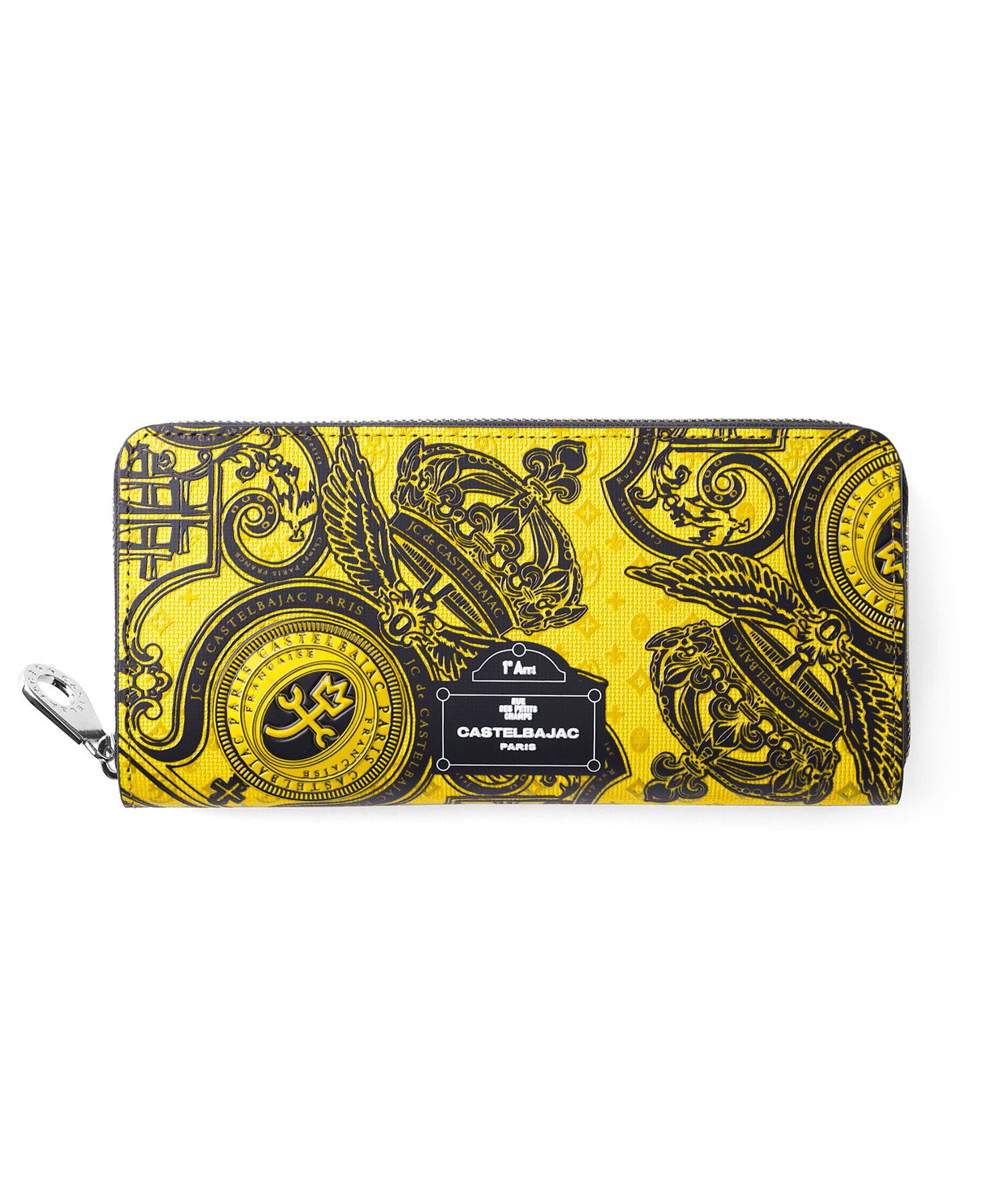 立体プリントが華やかなカステルバジャックのラウンドファスナー長財布。フランス・ヴェルサイユ宮殿の黄金に輝く「王の門」からインスピレーションされたアートを立体プリントで表現しました。よく見るとクロスやハトなど、カステルバジャックらしいモチーフが隠れています。
