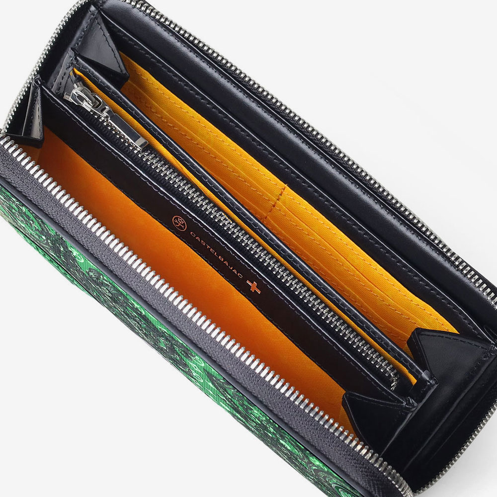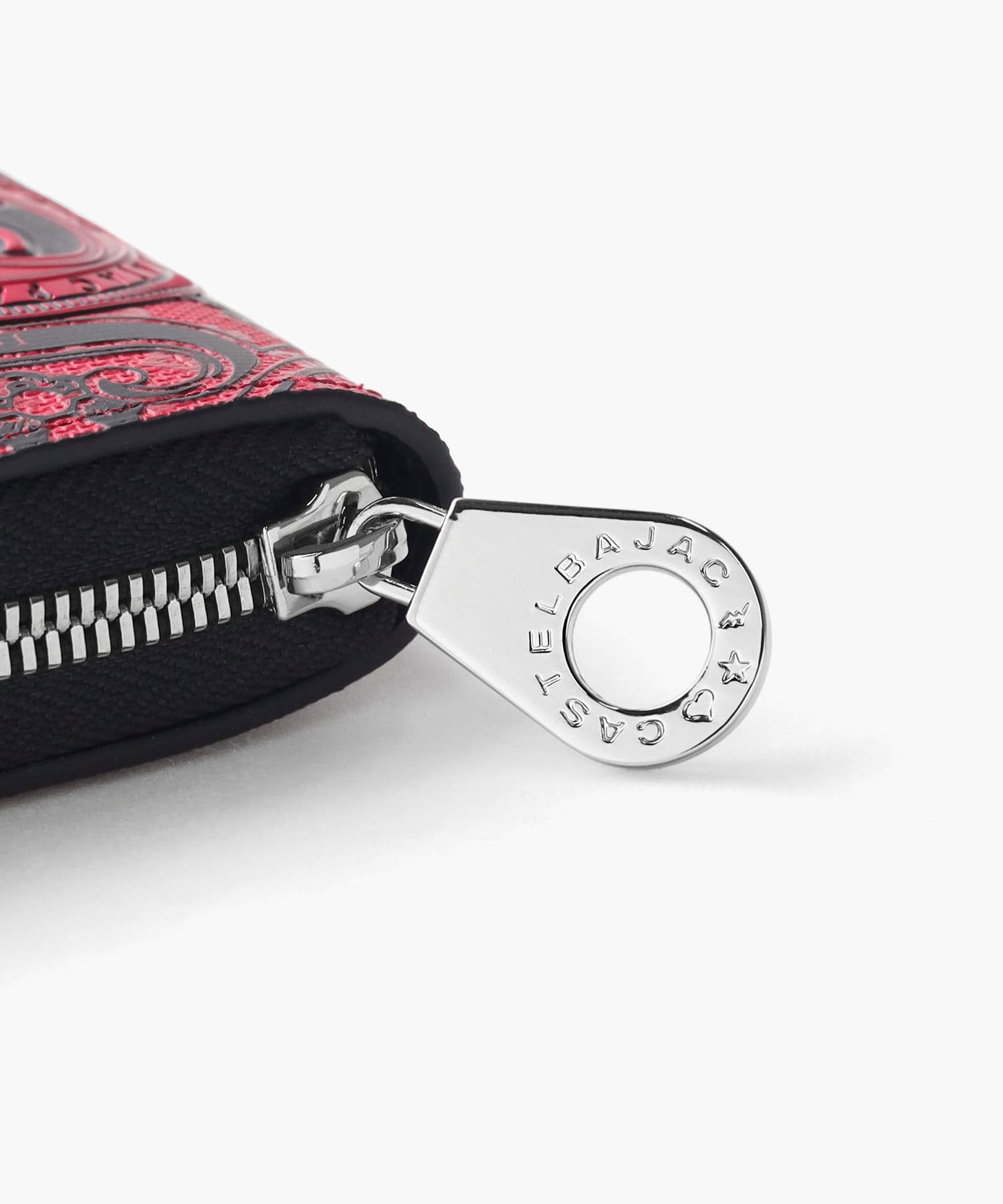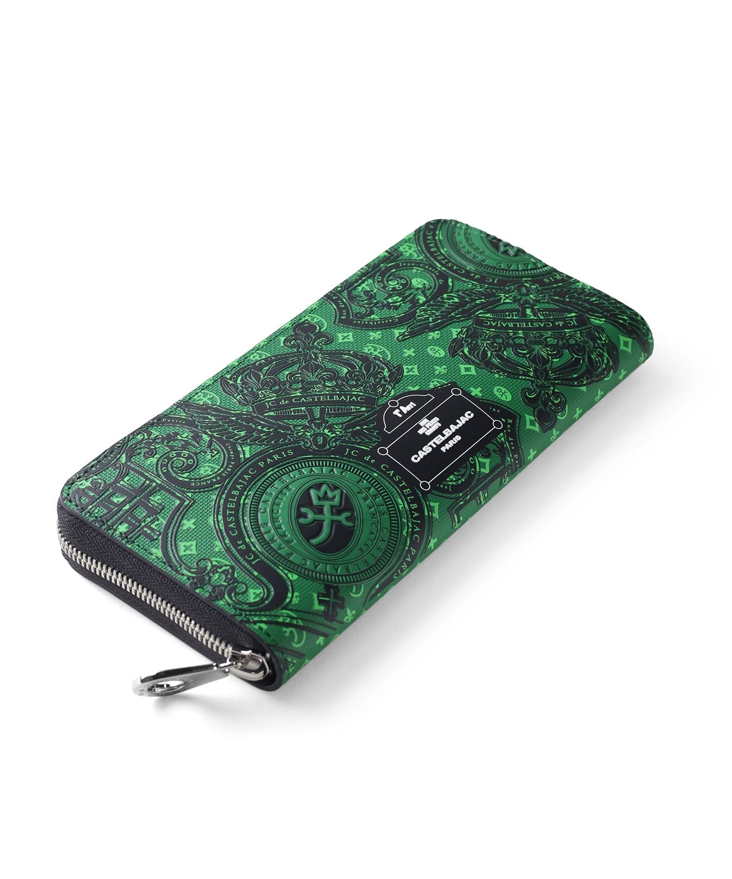 立体プリントが華やかなカステルバジャックのラウンドファスナー長財布。フランス・ヴェルサイユ宮殿の黄金に輝く「王の門」からインスピレーションされたアートを立体プリントで表現しました。よく見るとクロスやハトなど、カステルバジャックらしいモチーフが隠れています。