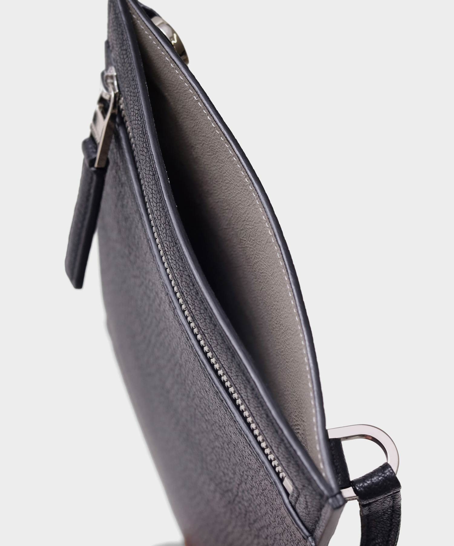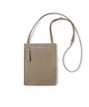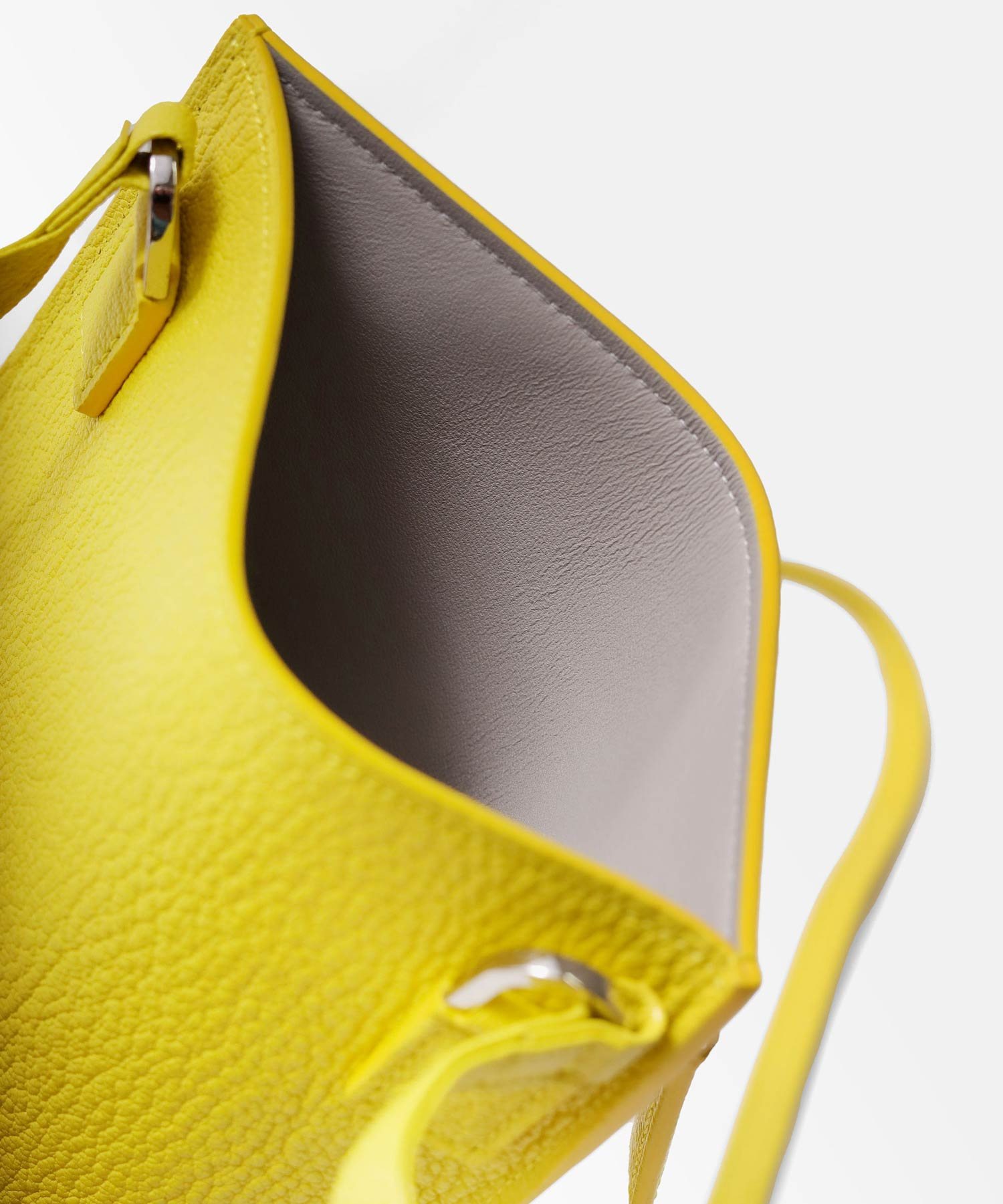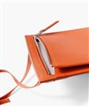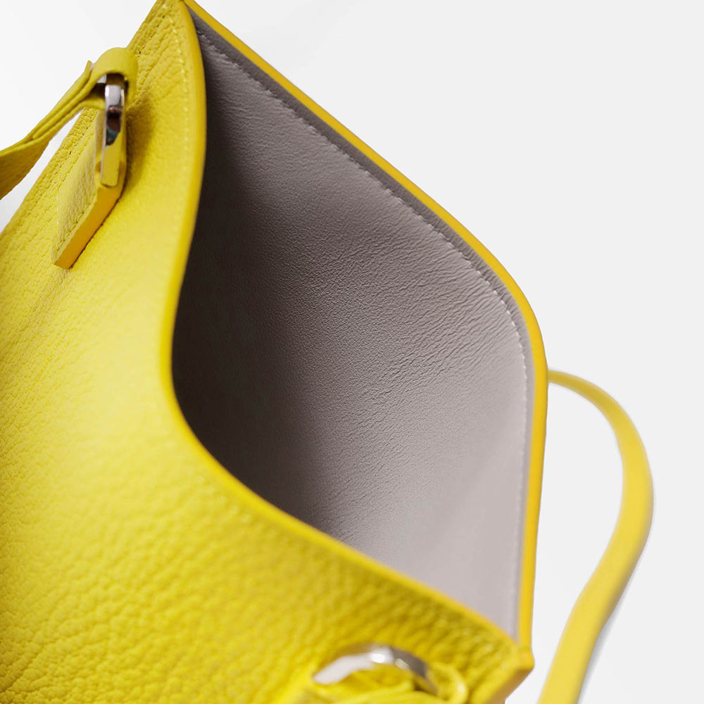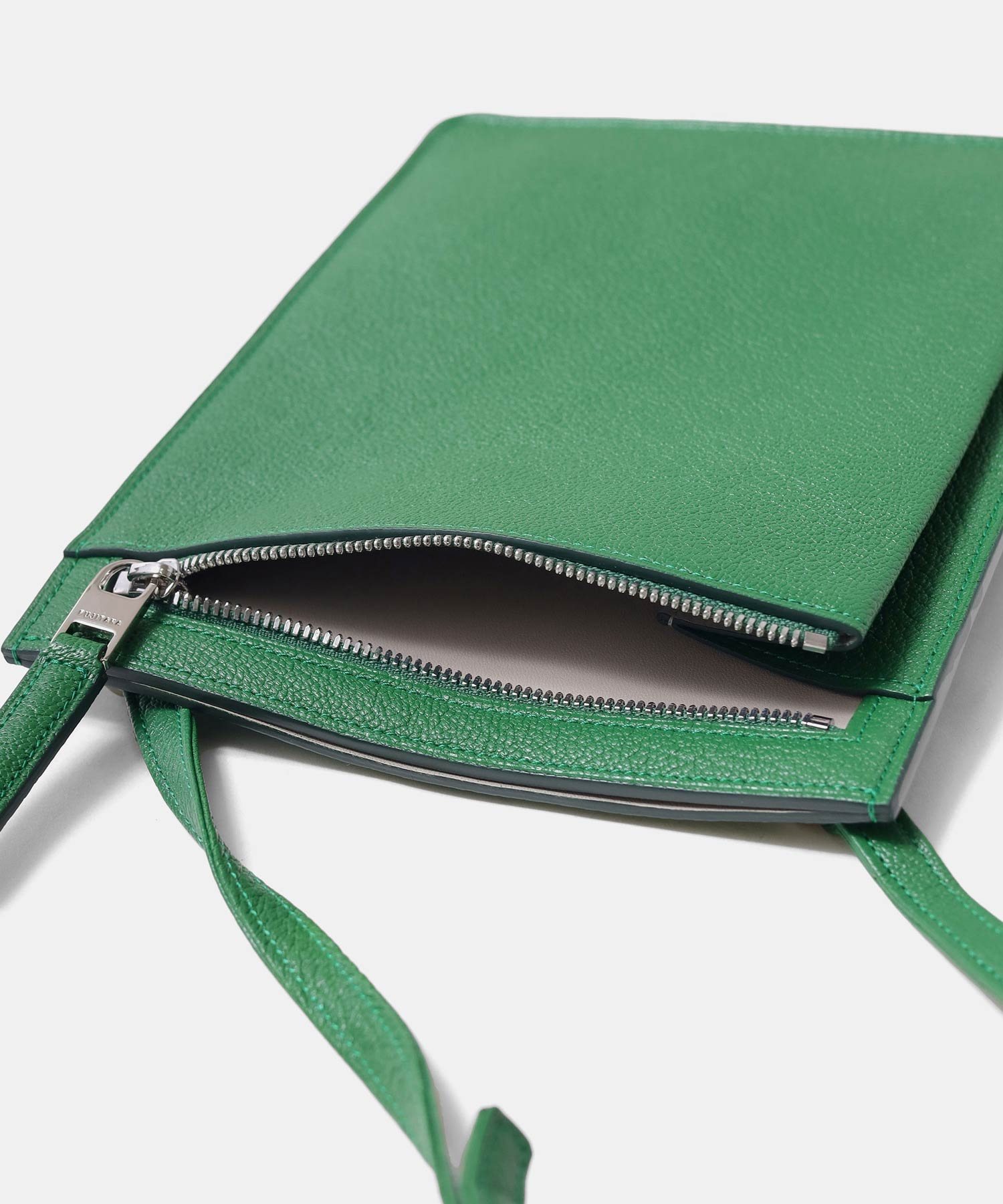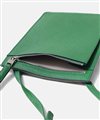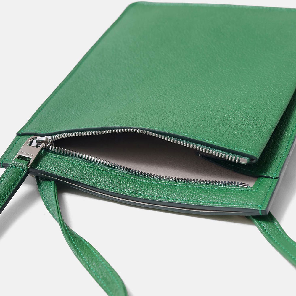 コンパクトなお財布とスマートフォンが丁度良く入るサイズ感のレザースマホショルダーバッグです。メインコンパートメントと、ファスナーポケットがあります。内装には贅沢にギリシャ産のラムレザーを張り合わせで使用した贅沢な仕立てとなっております。