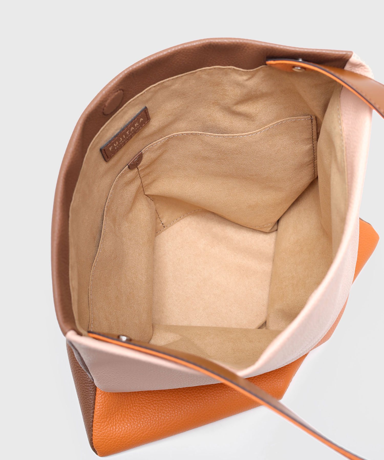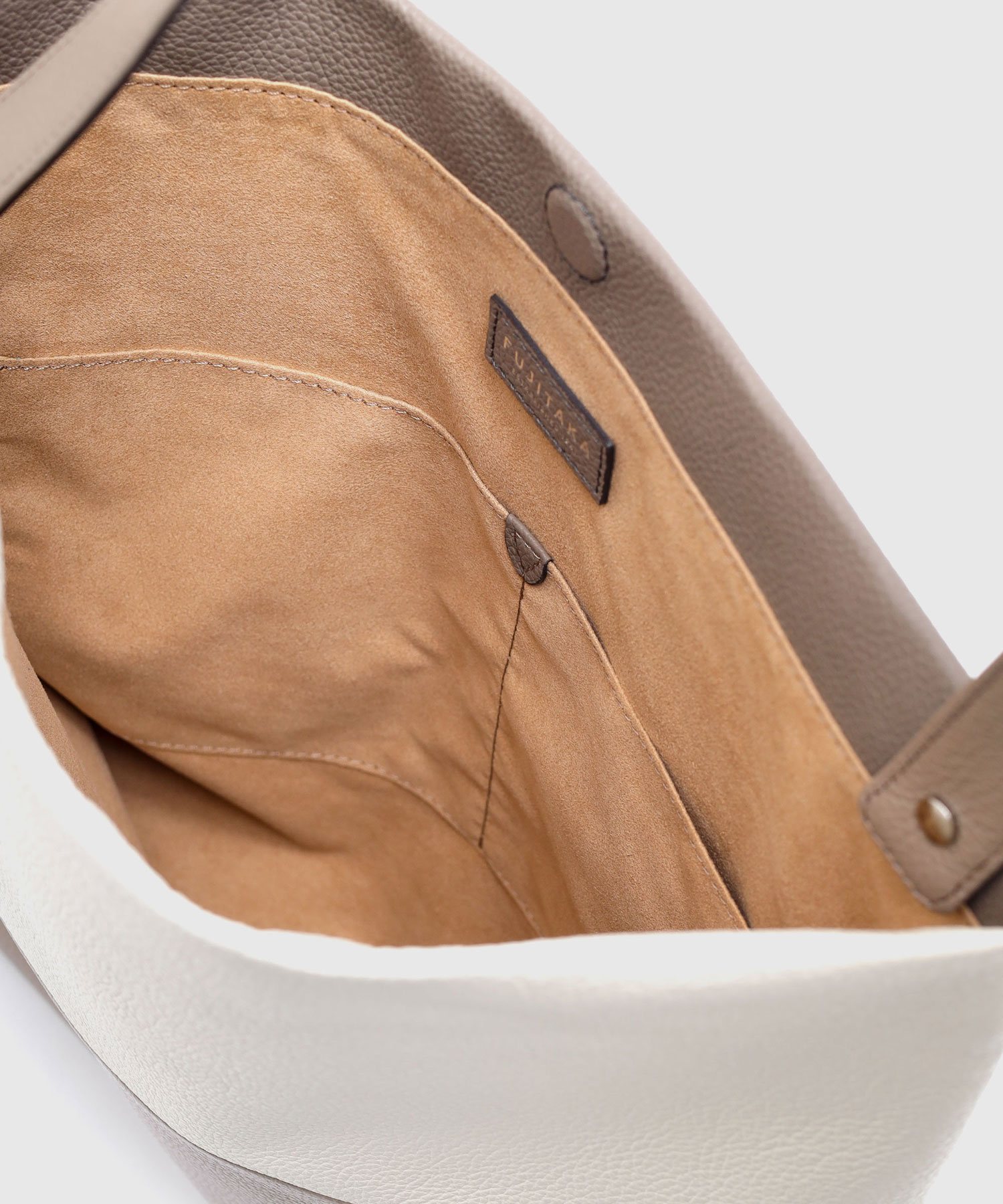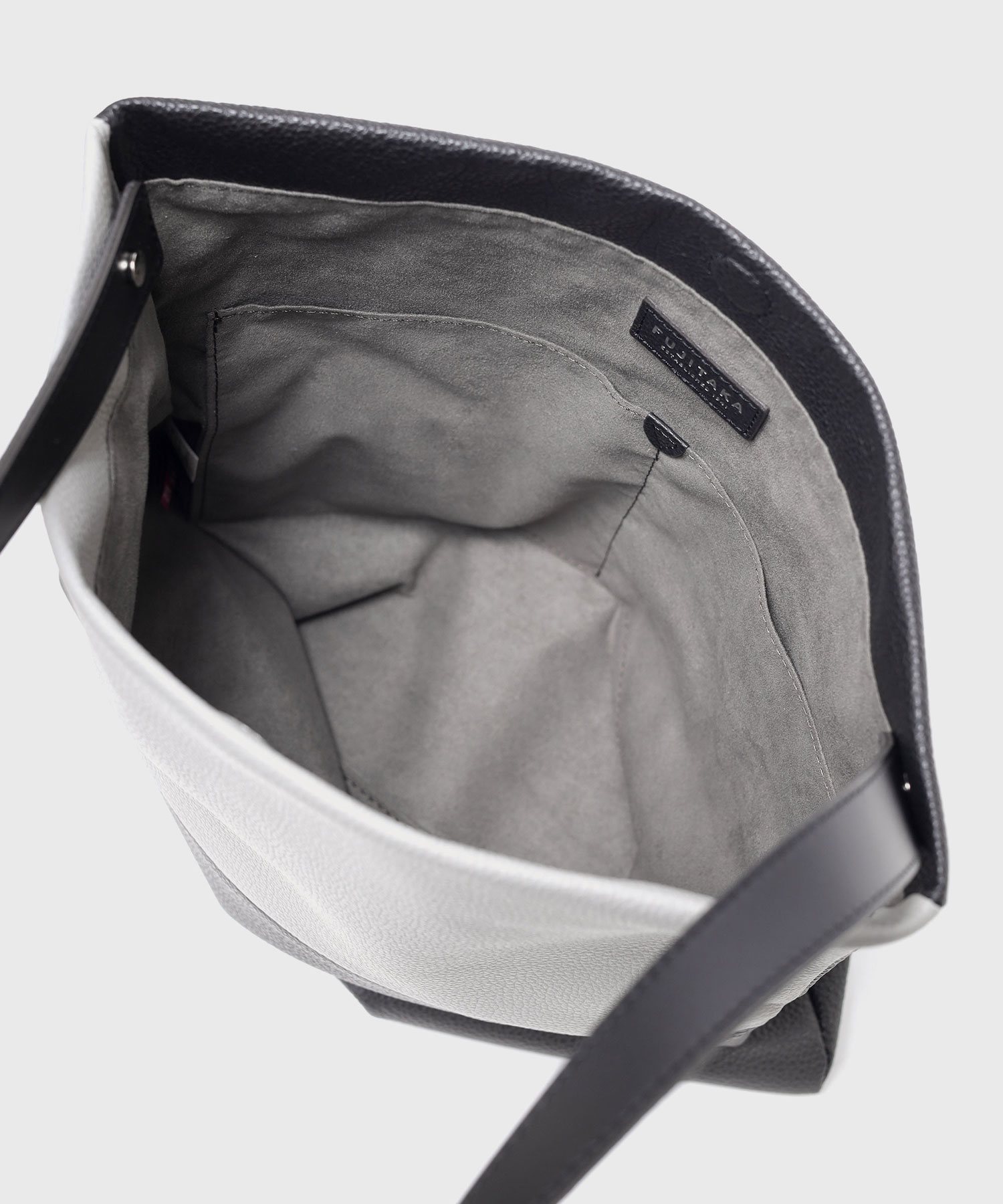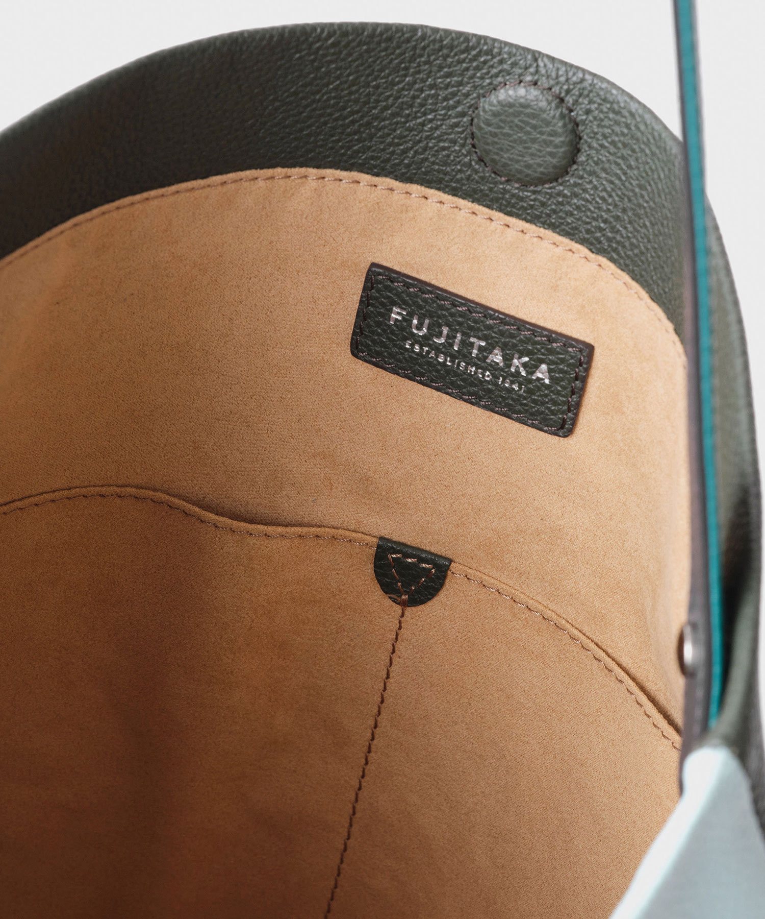 多用途に活躍するユーティリティーデザインが魅力のラグジュアリーなフジタカのA4サイズのレザーマルチバッグ。背面は単色のデザインで、こちらを正面としてもお使いいただける両A面デザインです。内側には小物が収納できるポケットが配置されています。