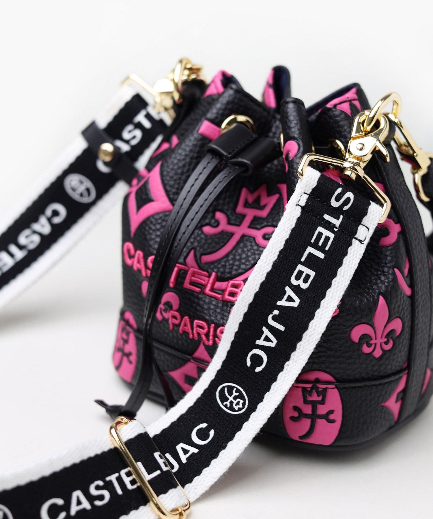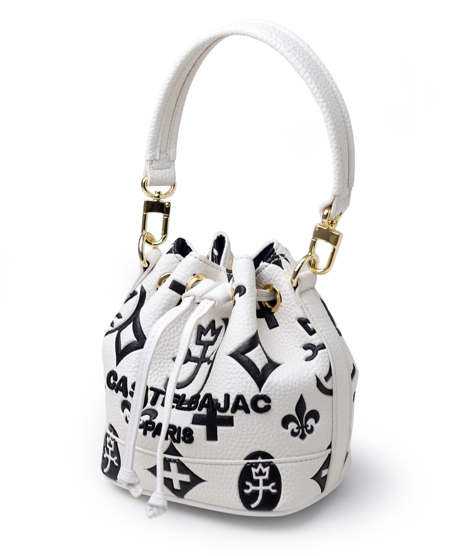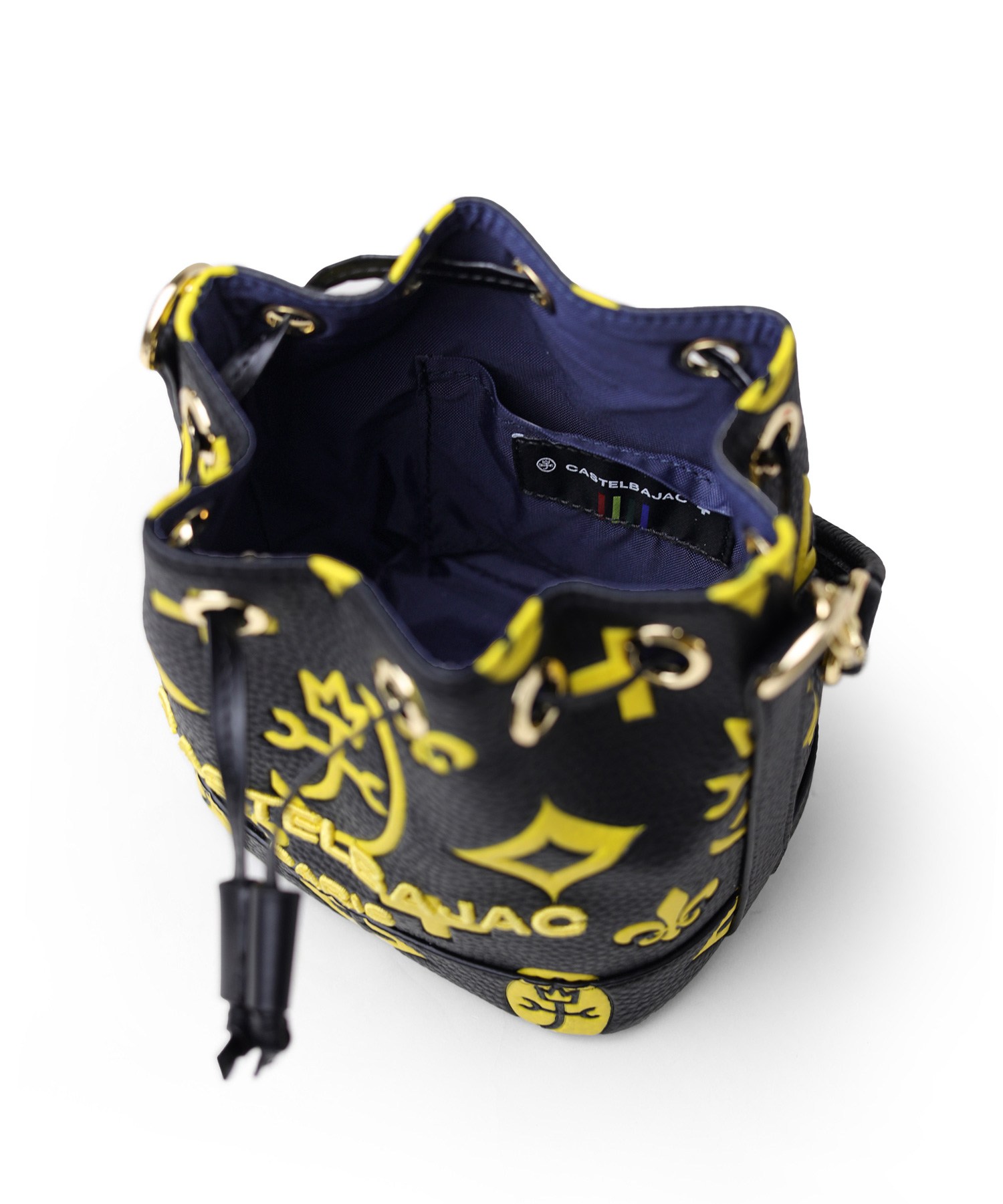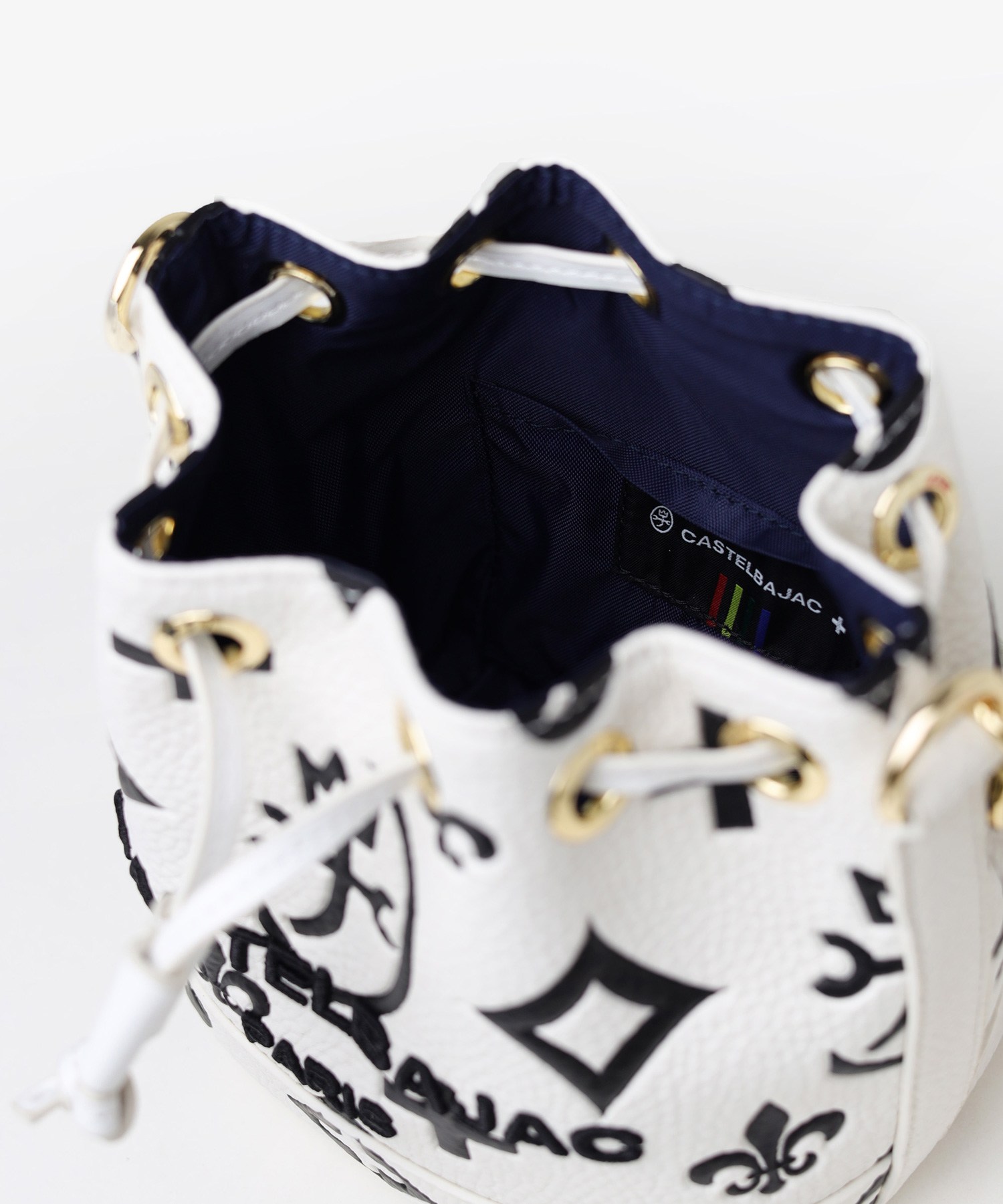 カステルバジャックのモノグラムを大胆にプリントした、巾着バッグです。"ちょい派手"をイメージした大人の遊び心あるデザインに仕上げました。