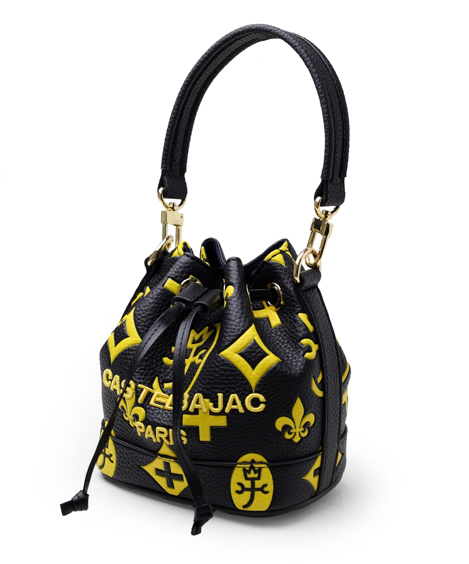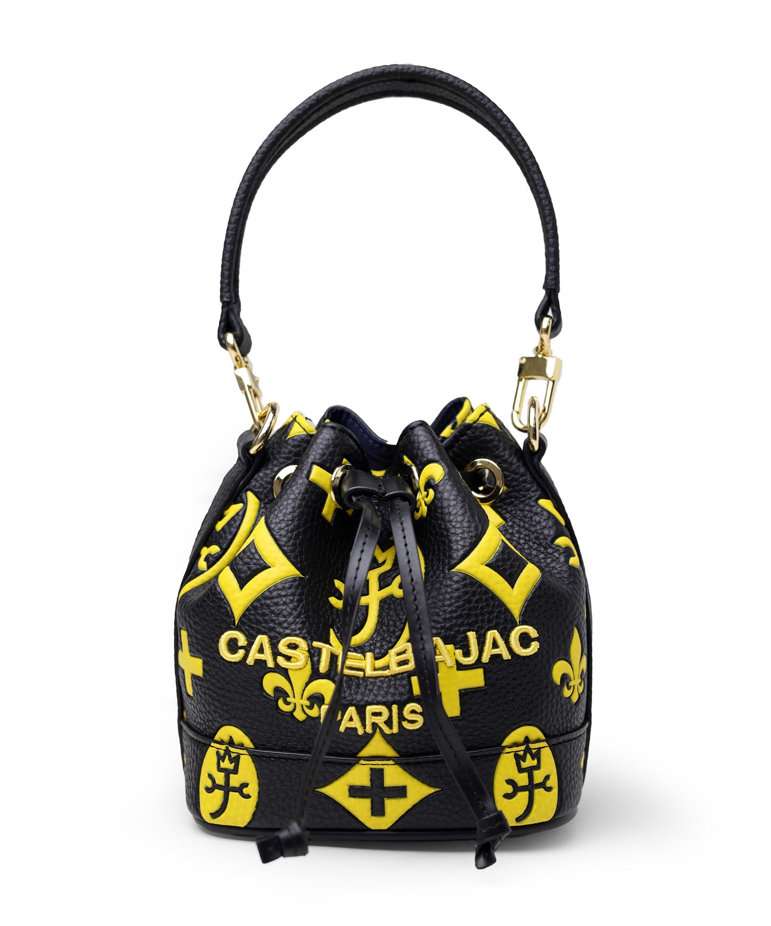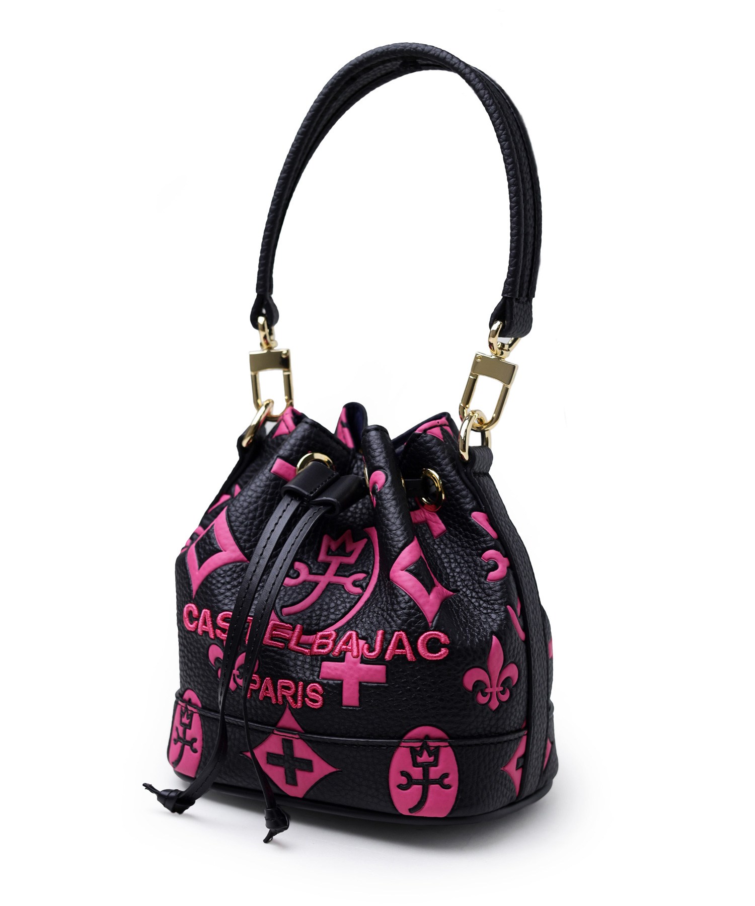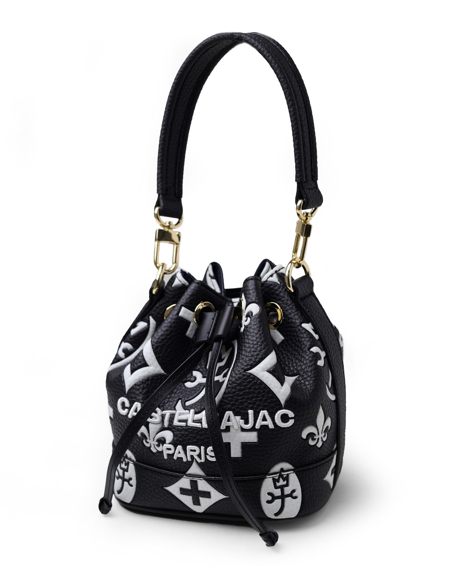 カステルバジャックのモノグラムを大胆にプリントした、巾着バッグです。"ちょい派手"をイメージした大人の遊び心あるデザインに仕上げました。