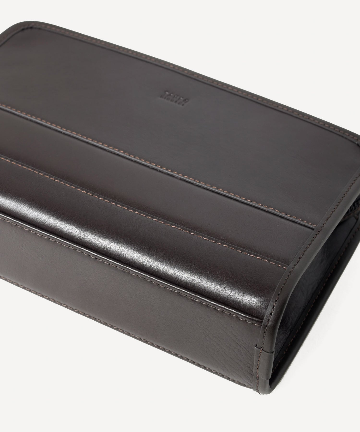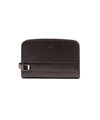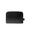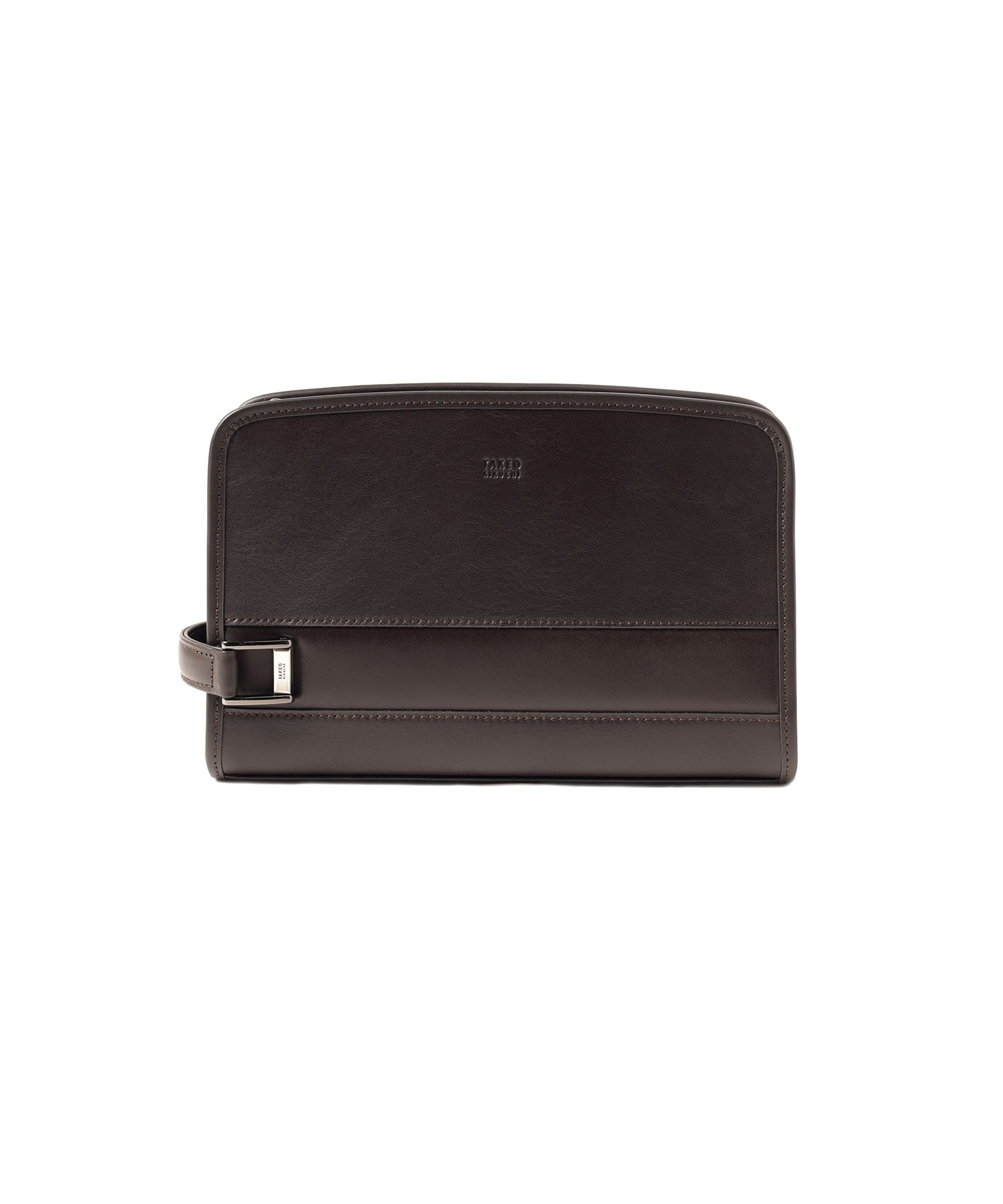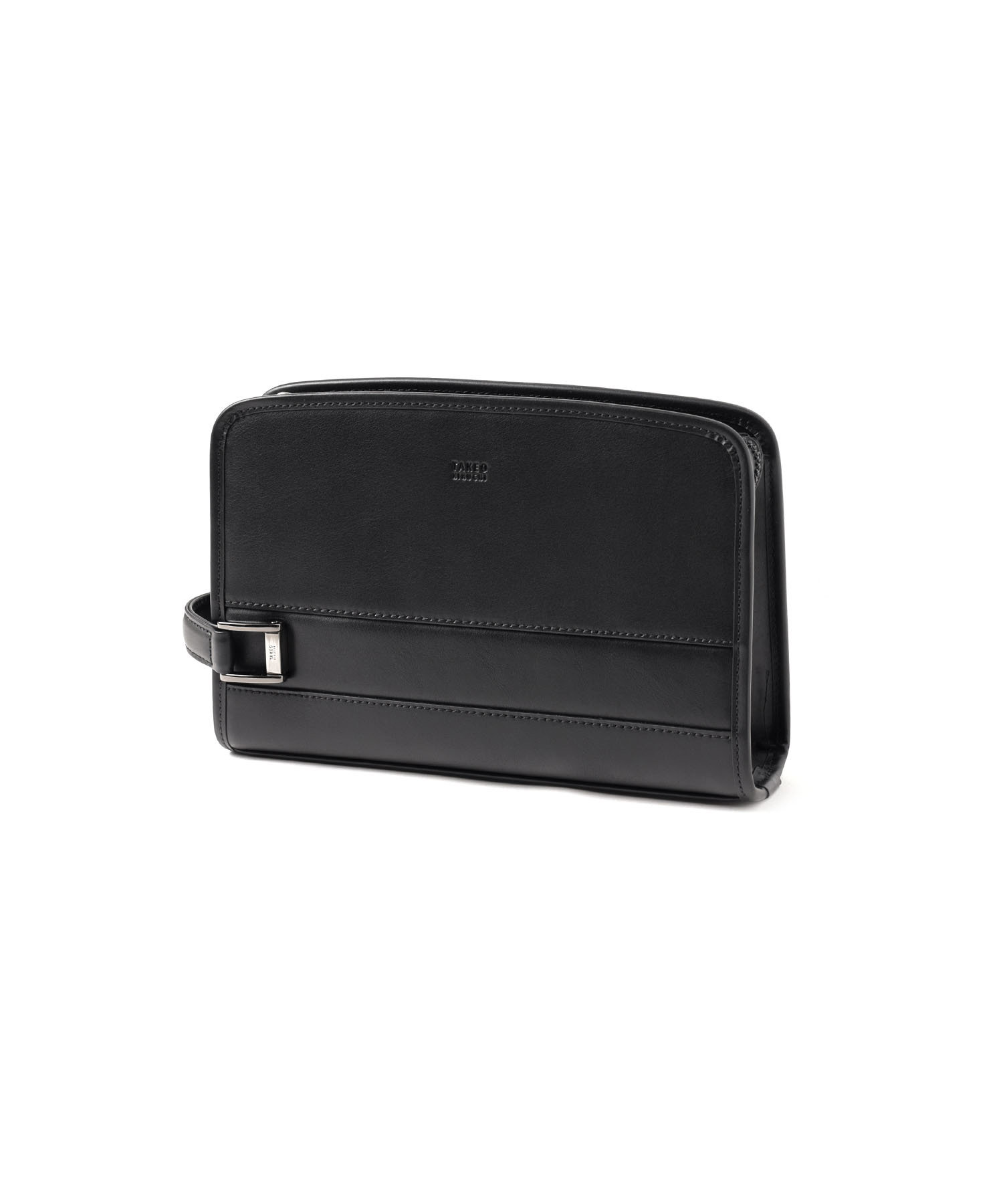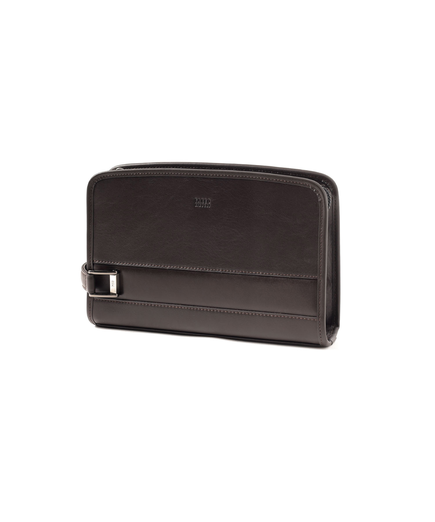 セミハードなタケオキクチのレザーメンズポーチ。角柱を一点一点切り出して作られる刻印入りオリジナルメタルなど、シンプルながらも細部に拘ったデザインが魅力です。ラウンドファスナー財布がぴったり入るサイズ感となっています。