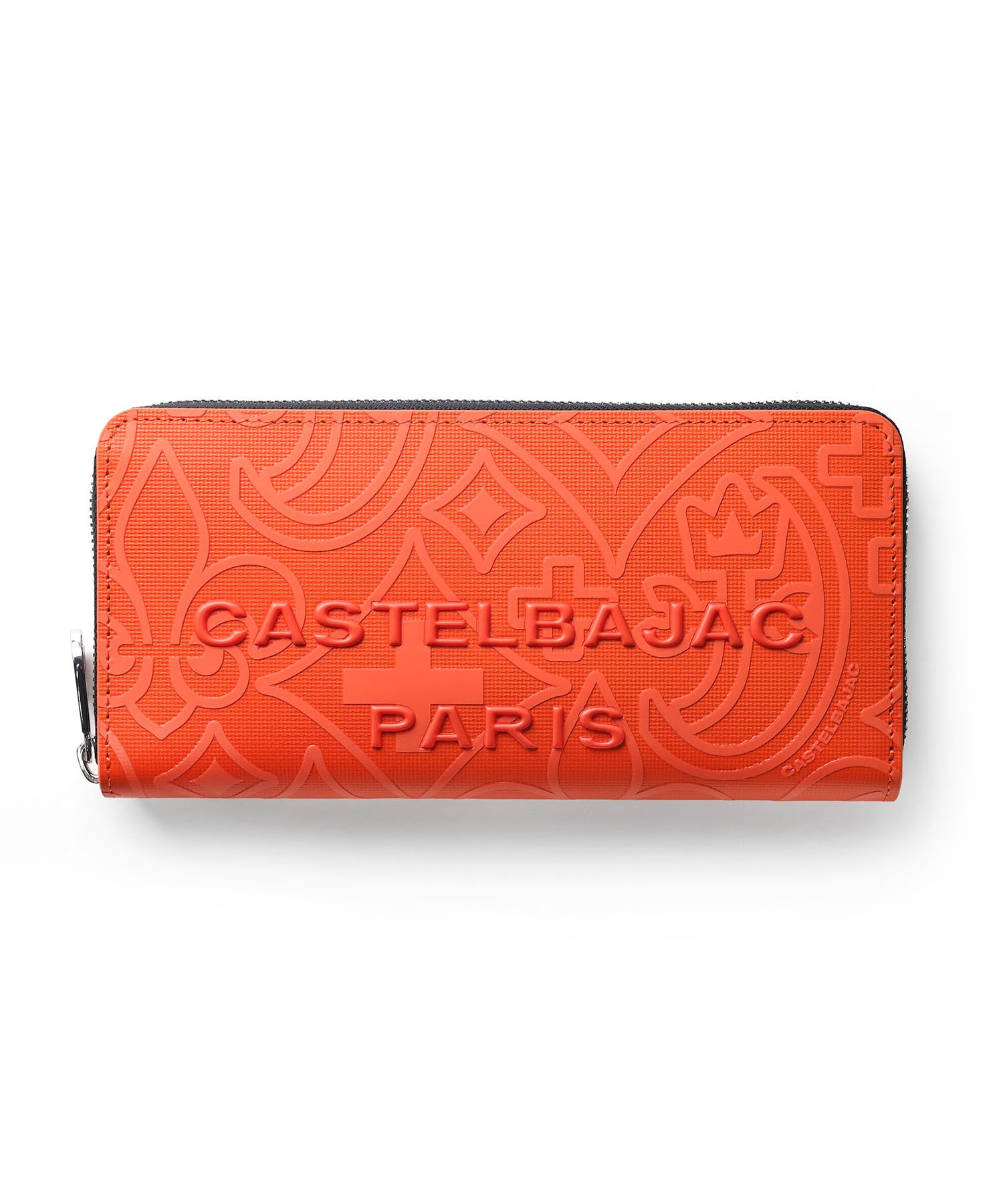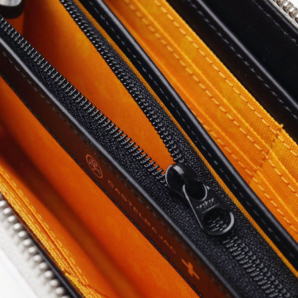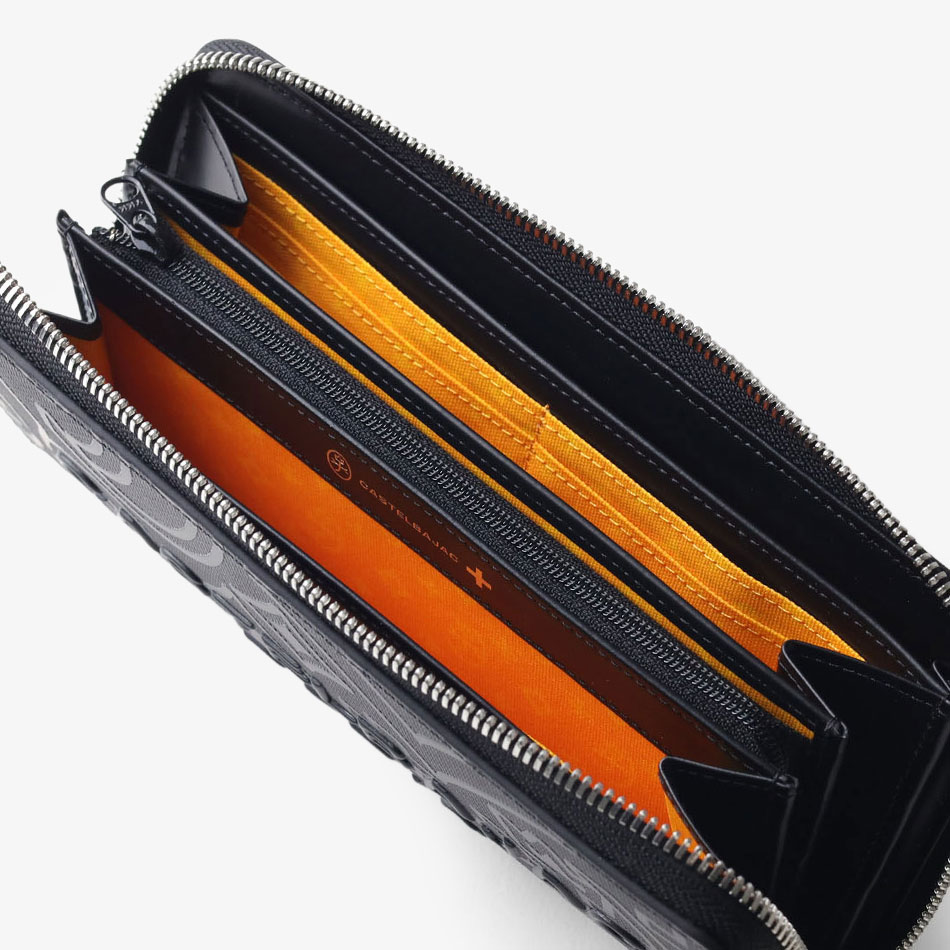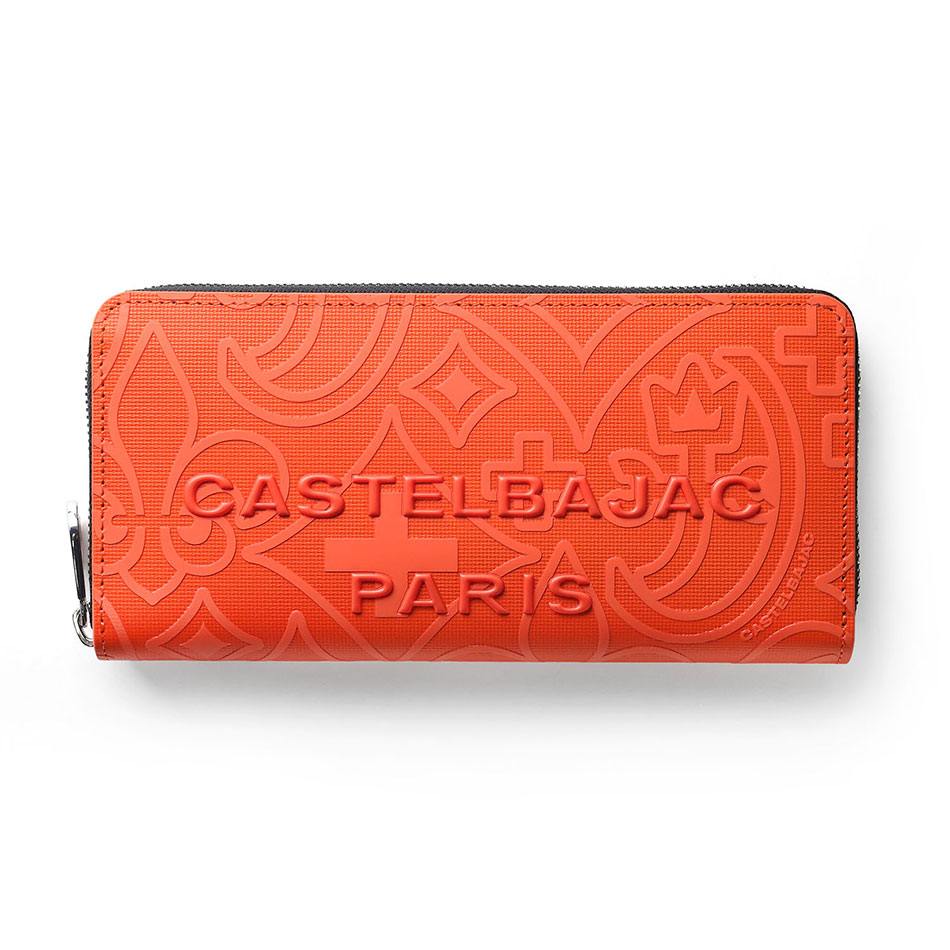 カステルバジャックのモノグラム柄をアレンジして表現した、新しい柄のラウンドファスナー長財布です。 本体同色のモノグラムプリントの上に立体感のあるロゴプリントを施すことで、カステルバジャックらしいテイストを残しつつ華やかすぎないデザインに仕上がっています。 内装には艶感のあるブラックレザーとロゴが入ったオレンジの裏地を使用しており、カステルバジャックの遊び心をデザインに落とし込んで表現しています。