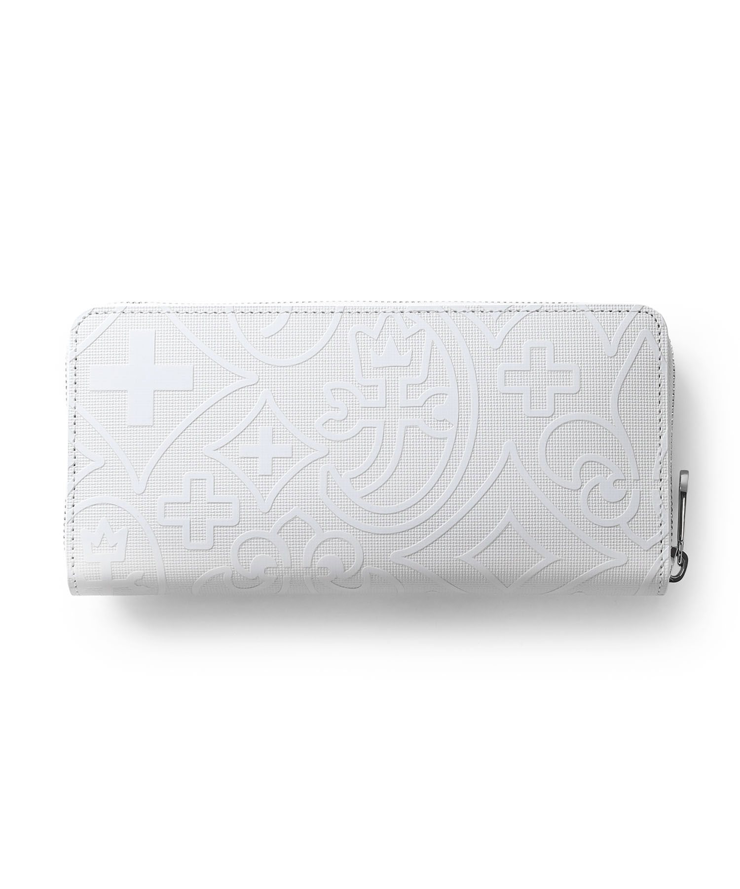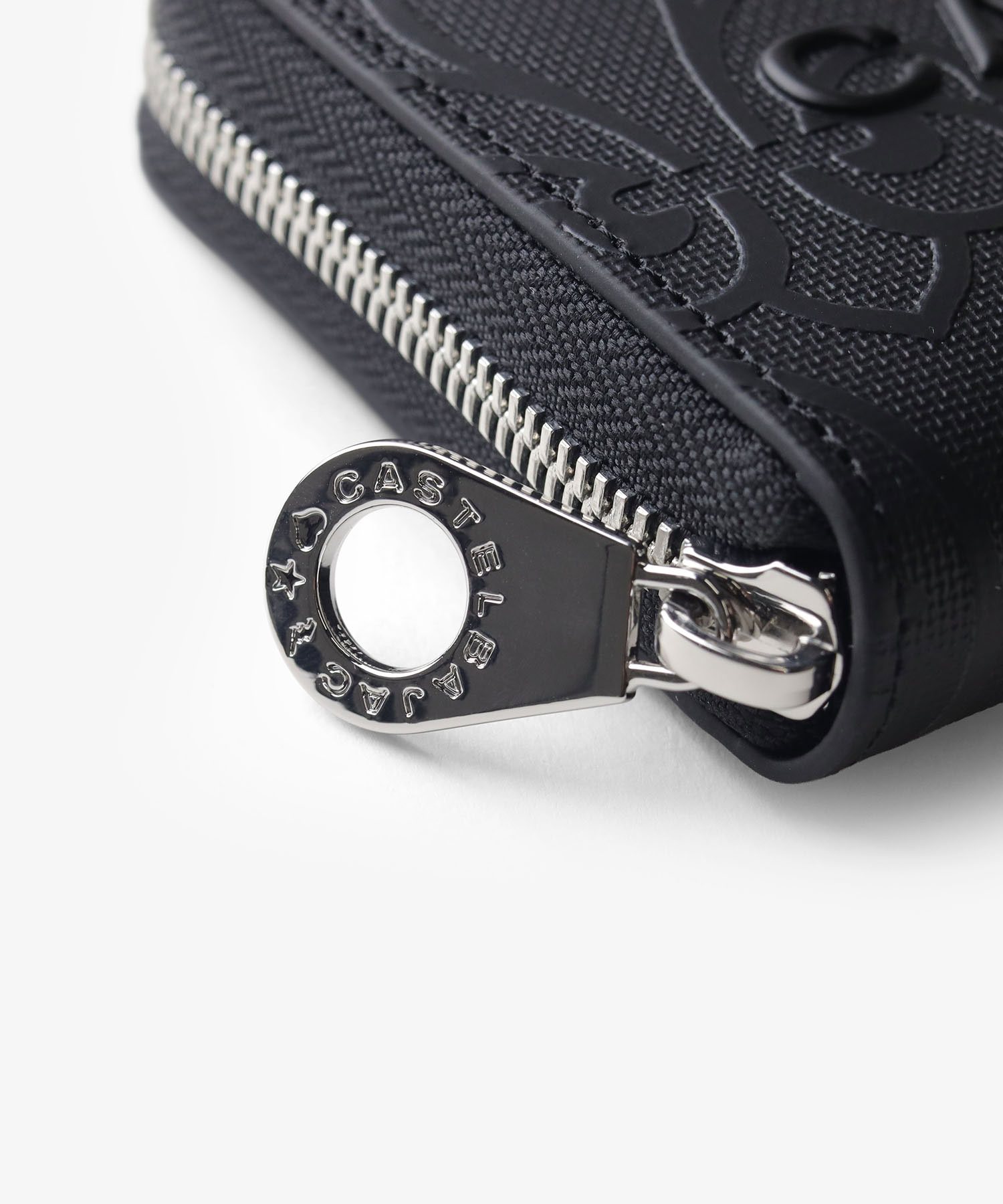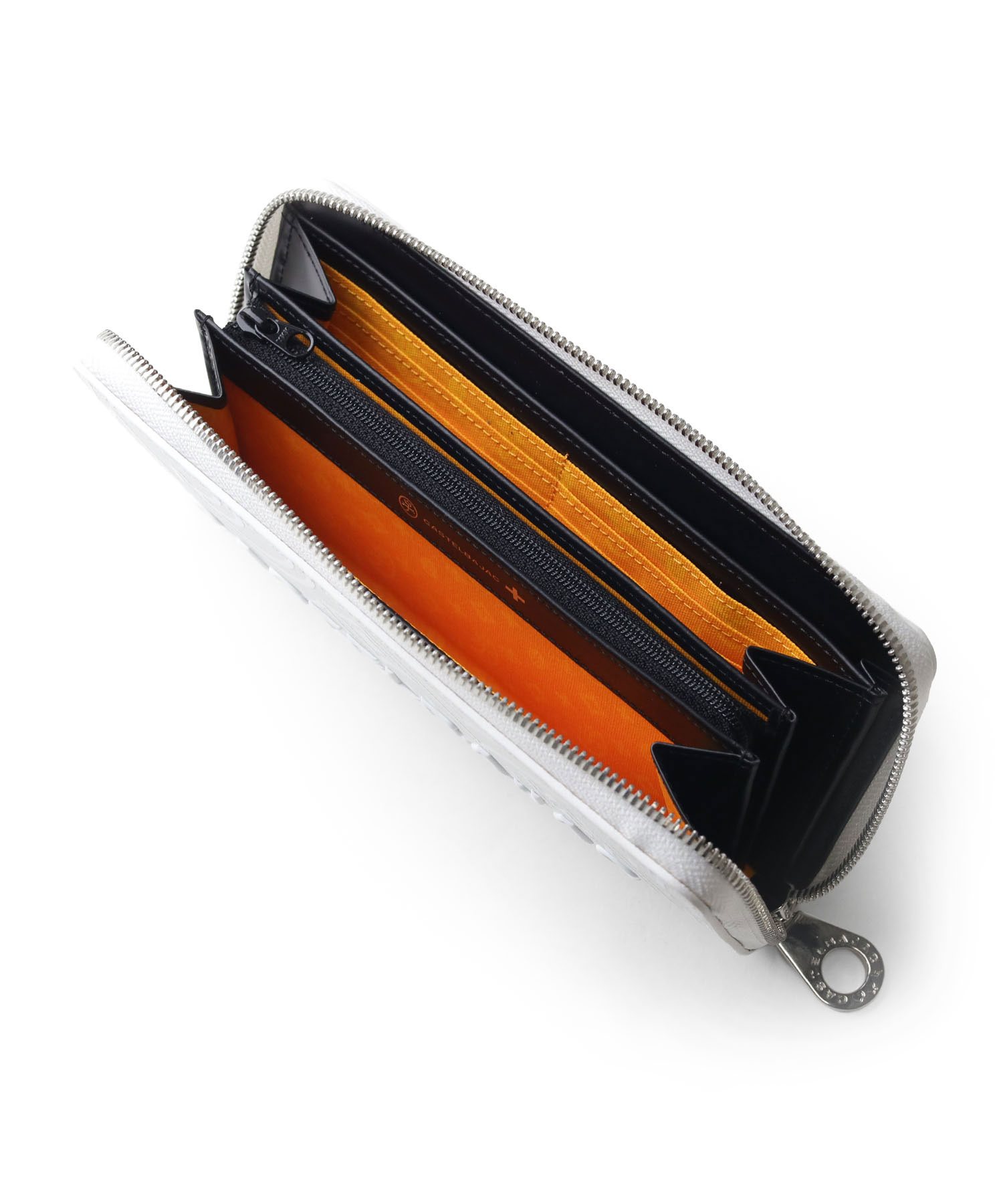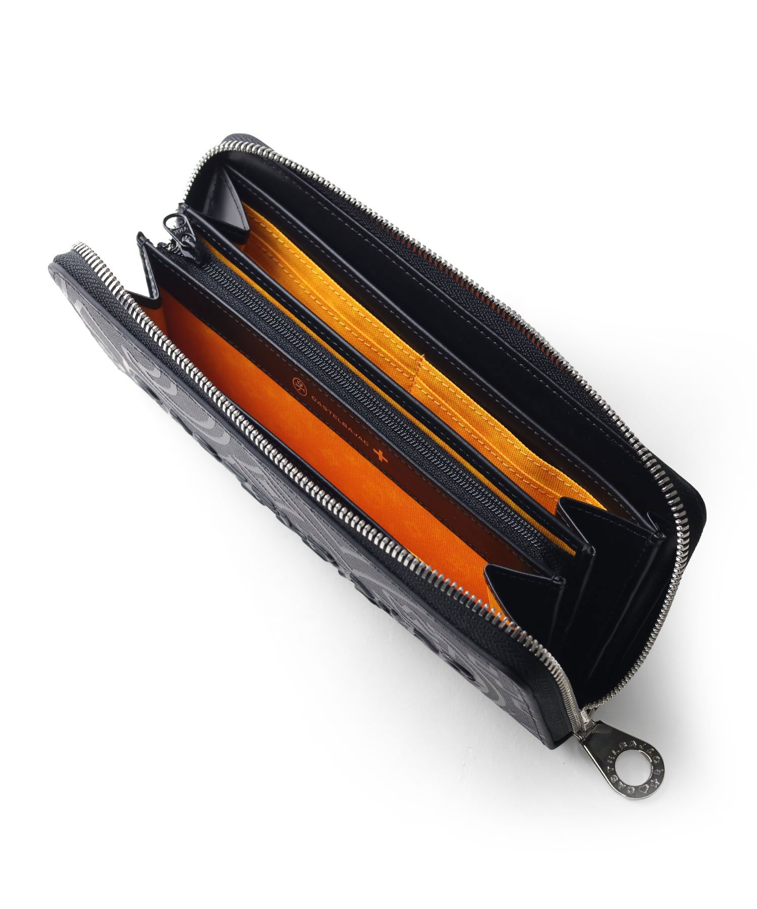 カステルバジャックのモノグラム柄をアレンジして表現した、新しい柄のラウンドファスナー長財布です。 本体同色のモノグラムプリントの上に立体感のあるロゴプリントを施すことで、カステルバジャックらしいテイストを残しつつ華やかすぎないデザインに仕上がっています。 内装には艶感のあるブラックレザーとロゴが入ったオレンジの裏地を使用しており、カステルバジャックの遊び心をデザインに落とし込んで表現しています。