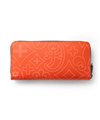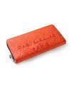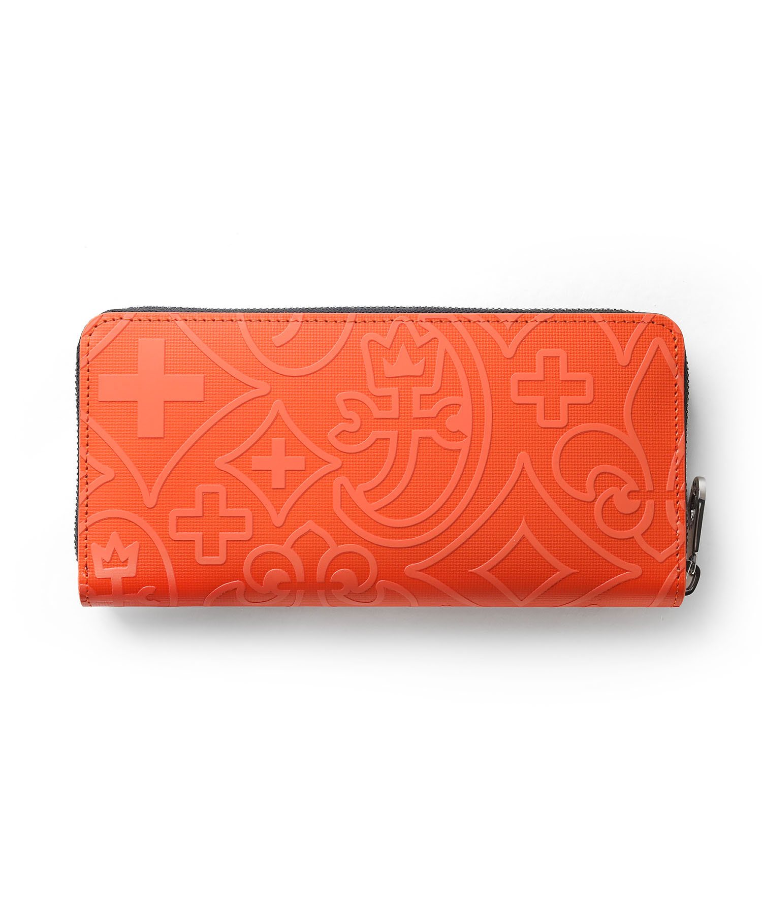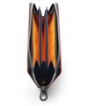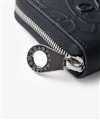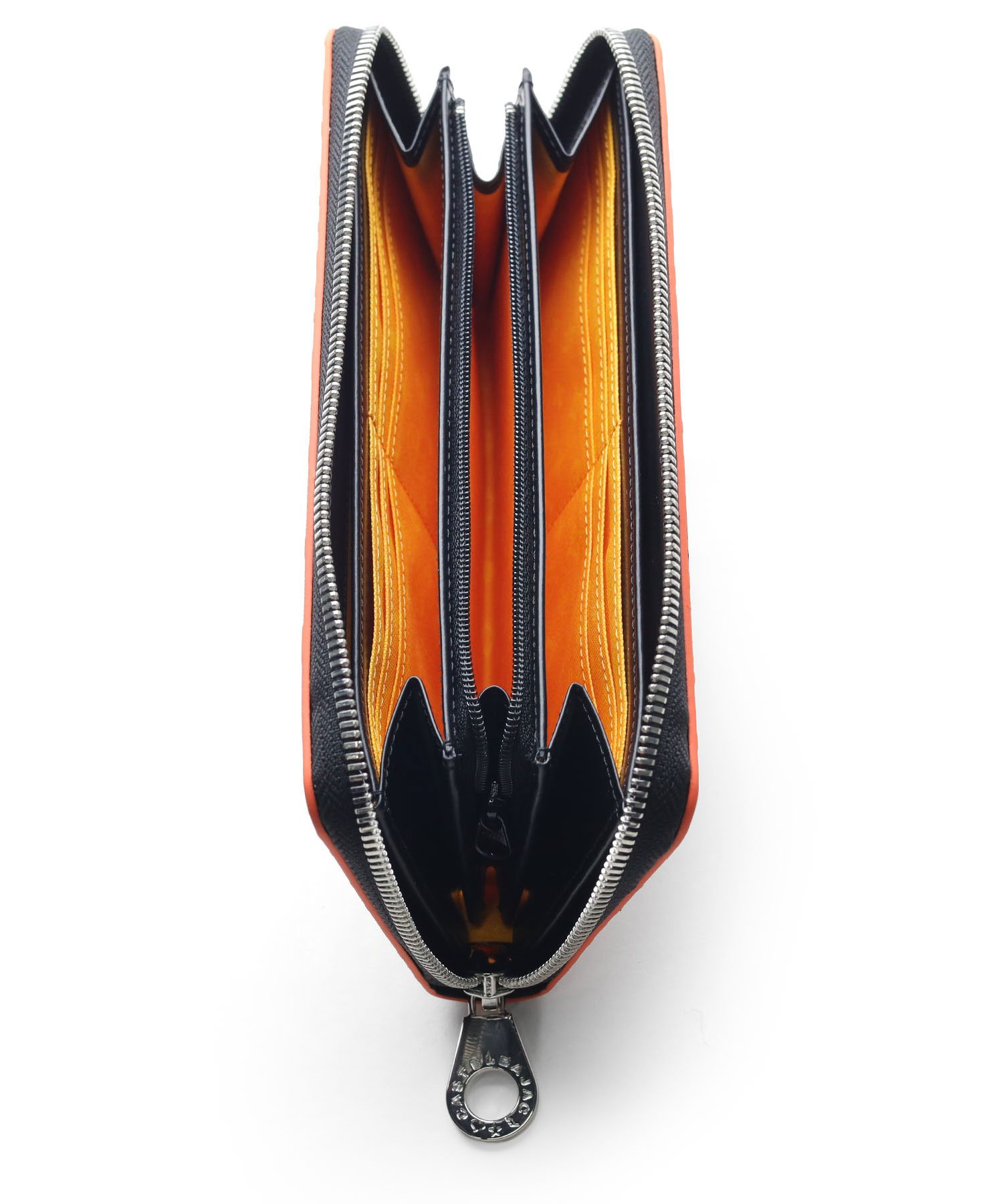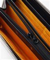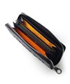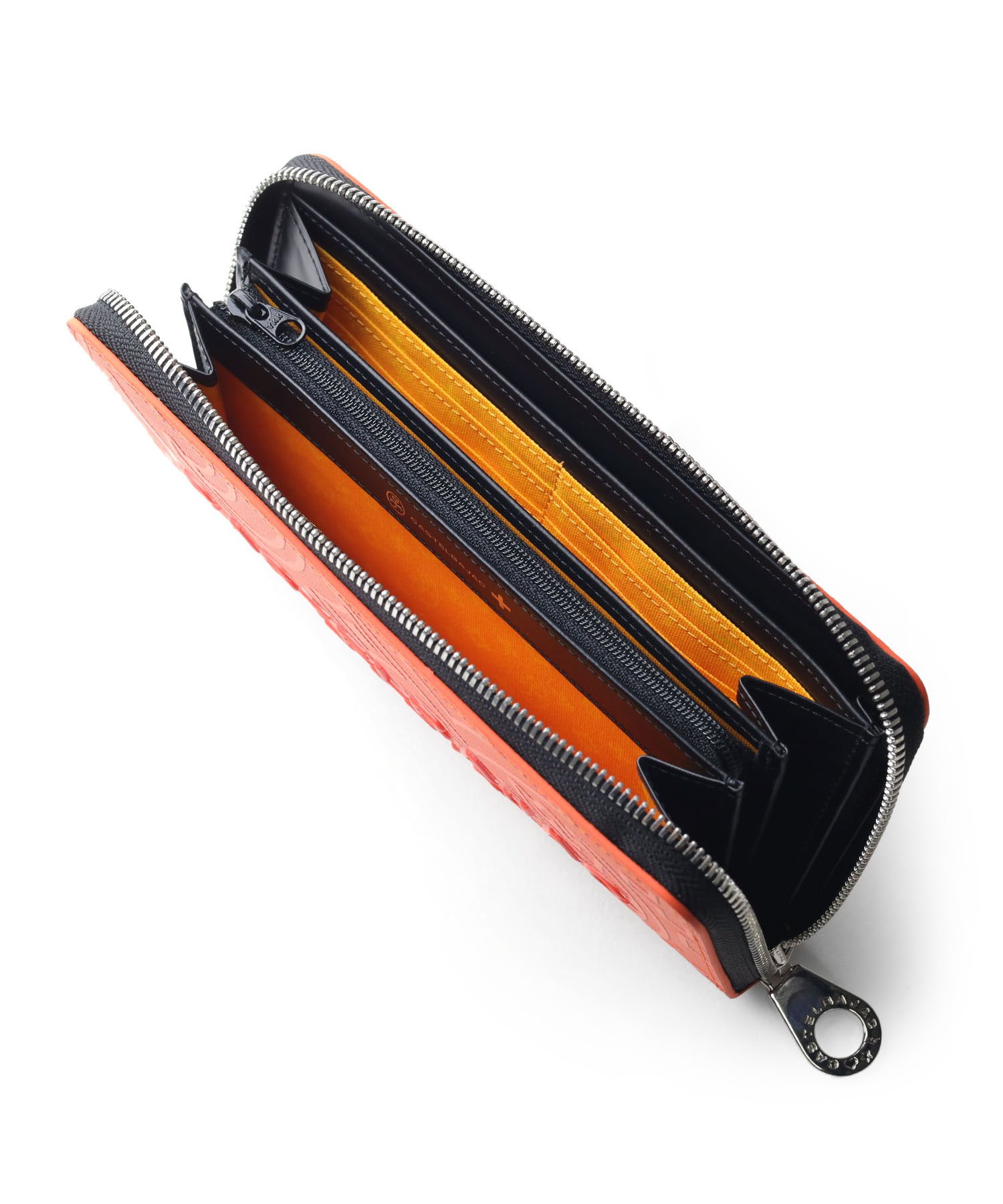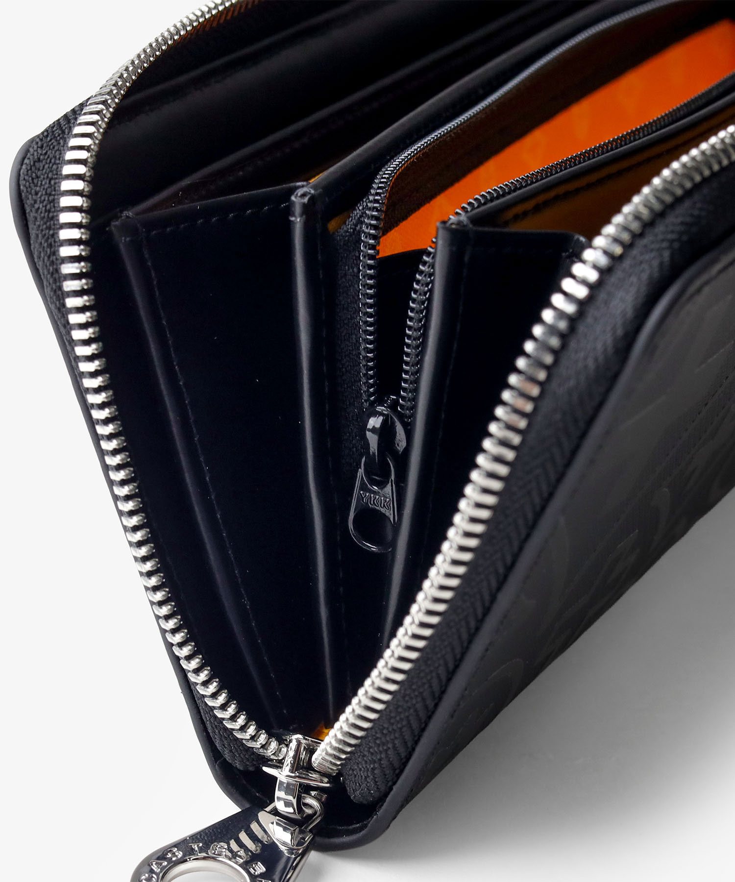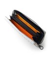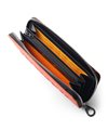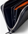 内装には札入れが2つ、カード段が計12段あり、カード段の裏側にはフリーポケットが設けられているため、レシートやチケット類の収納と整理が可能です。小銭入れにはL字ファスナーを採用し、大きく開いて中が見やすくスムーズに硬貨を出し入れすることができます。また、艶感のあるブラックレザーとロゴが入ったオレンジの裏地が目を引くデザインとなっています。