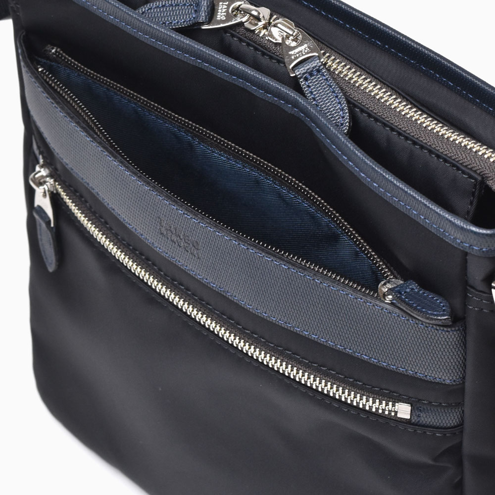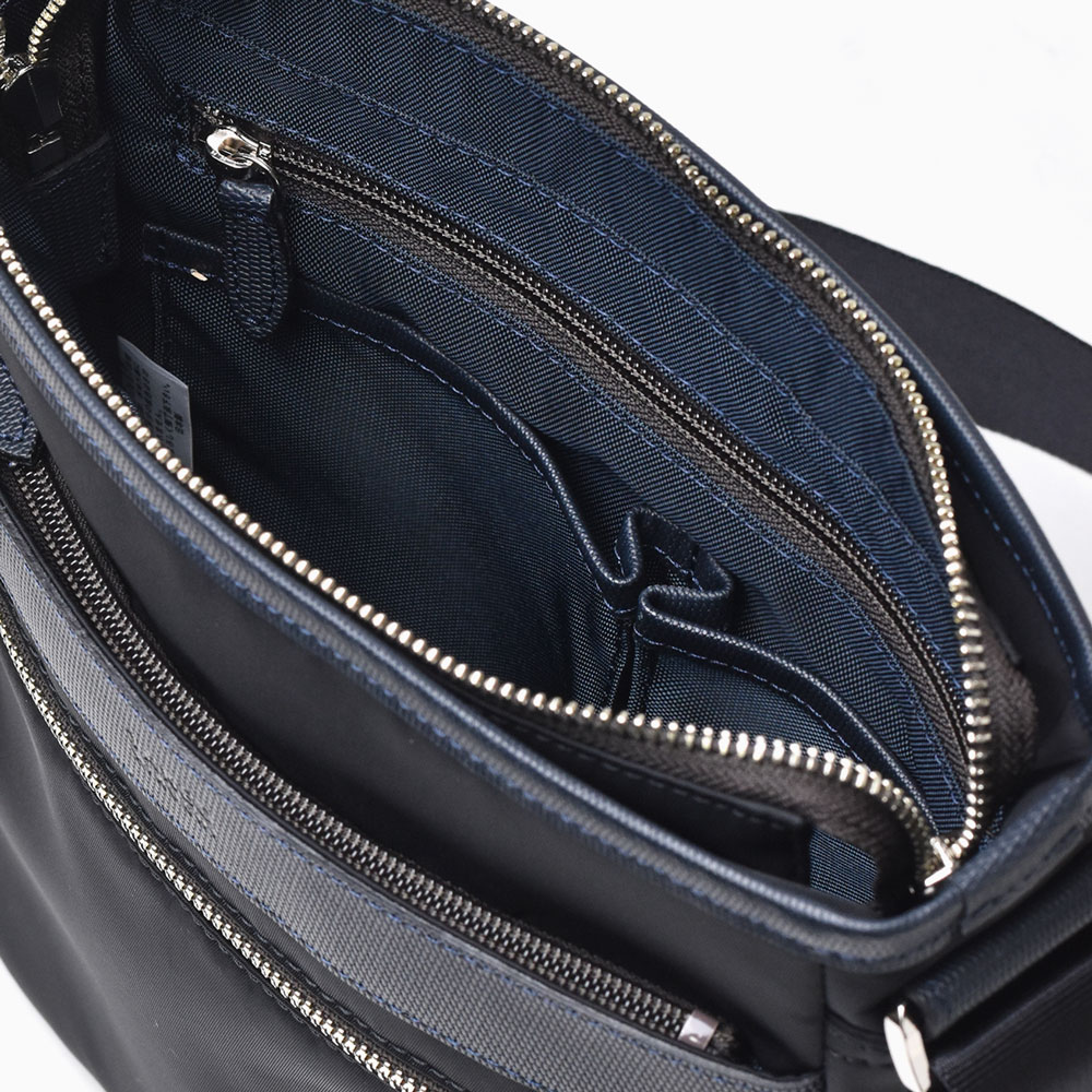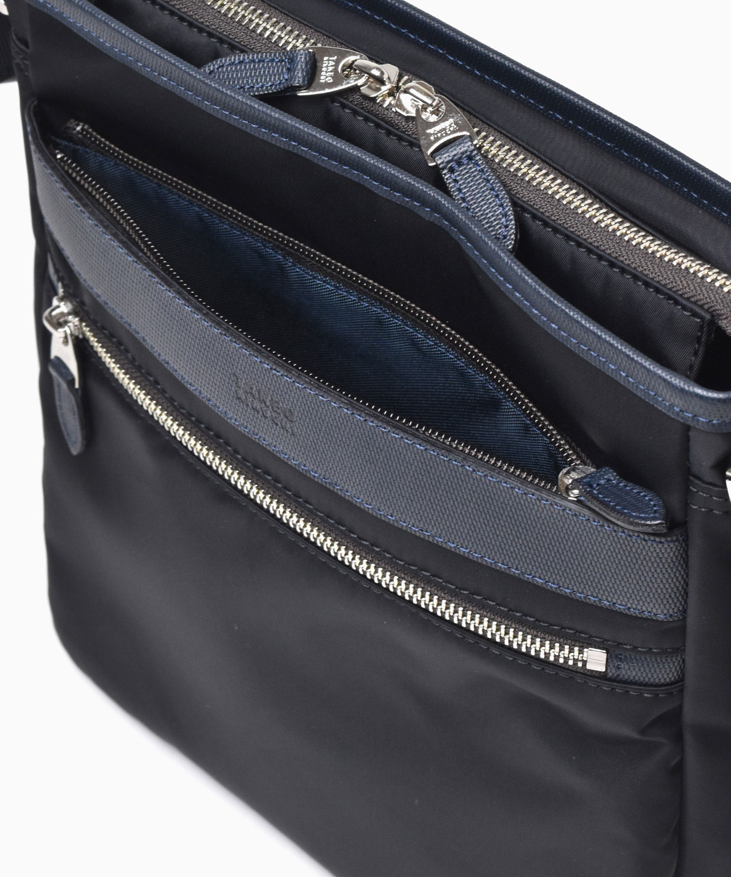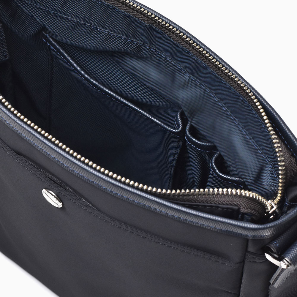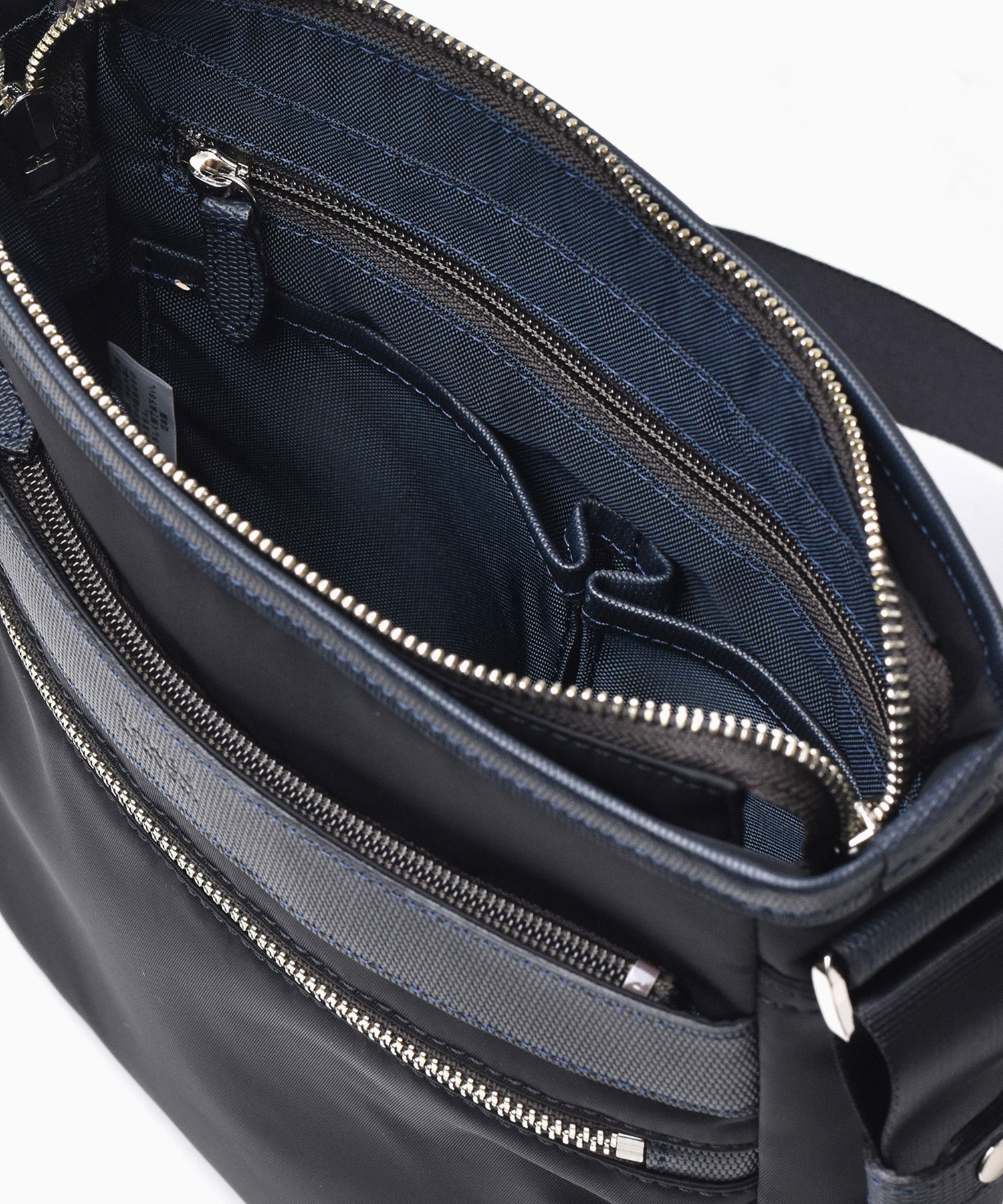 上品な光沢感と発色の良さが特徴のナイロンツイルを使用した、カジュアルショルダーバッグ。シンプルで使いやすいデザインの中に、付属革やメタルパーツでタケオキクチらしいこだわりを表現しています。本体素材には、上品な光沢感と発色の良さが特徴のナイロンツイルを使用しています。付属革にはミニメッシュエンボスレザーを使用。マットブラック色の箔押しを施すことで、ブランドネームをさり気なく引き立てています。