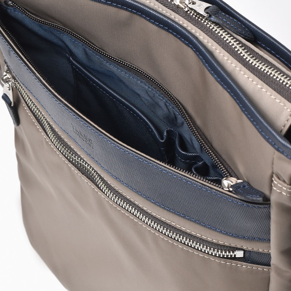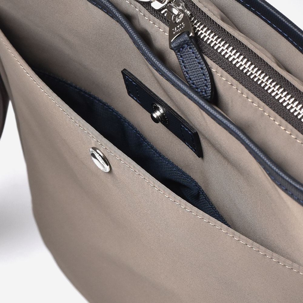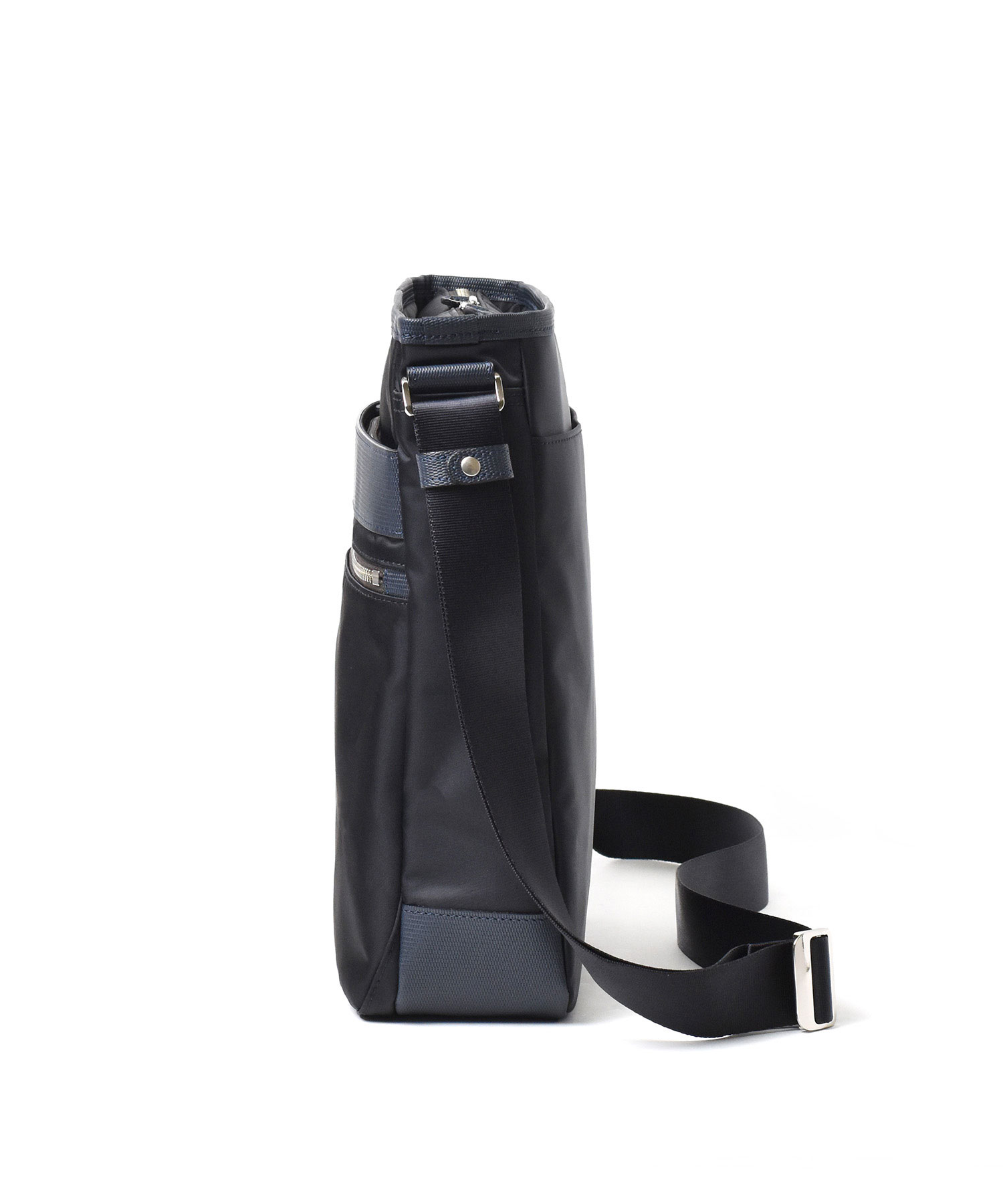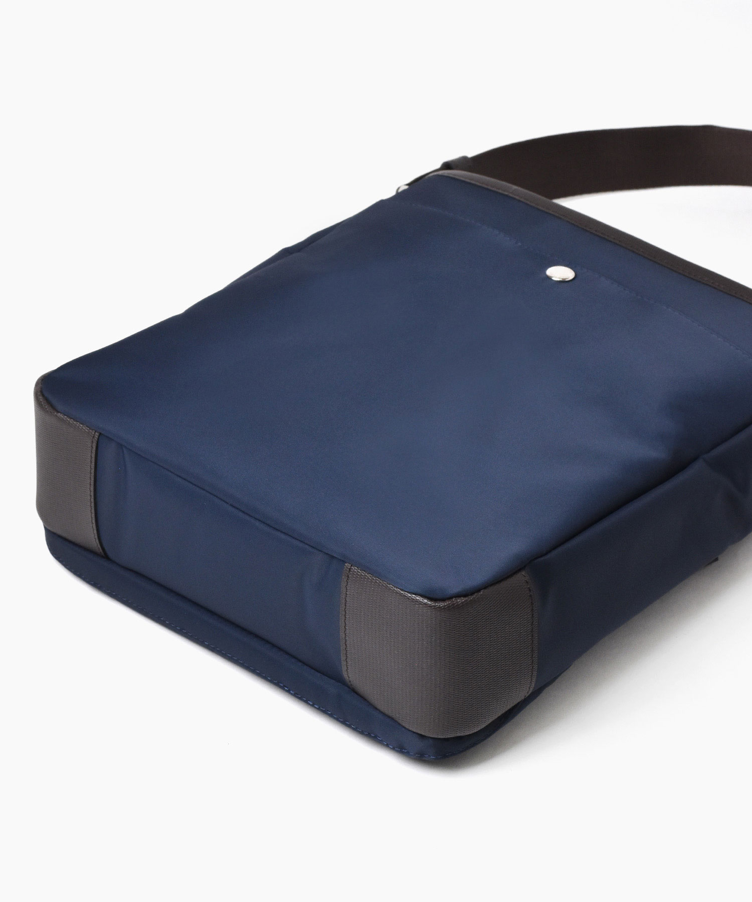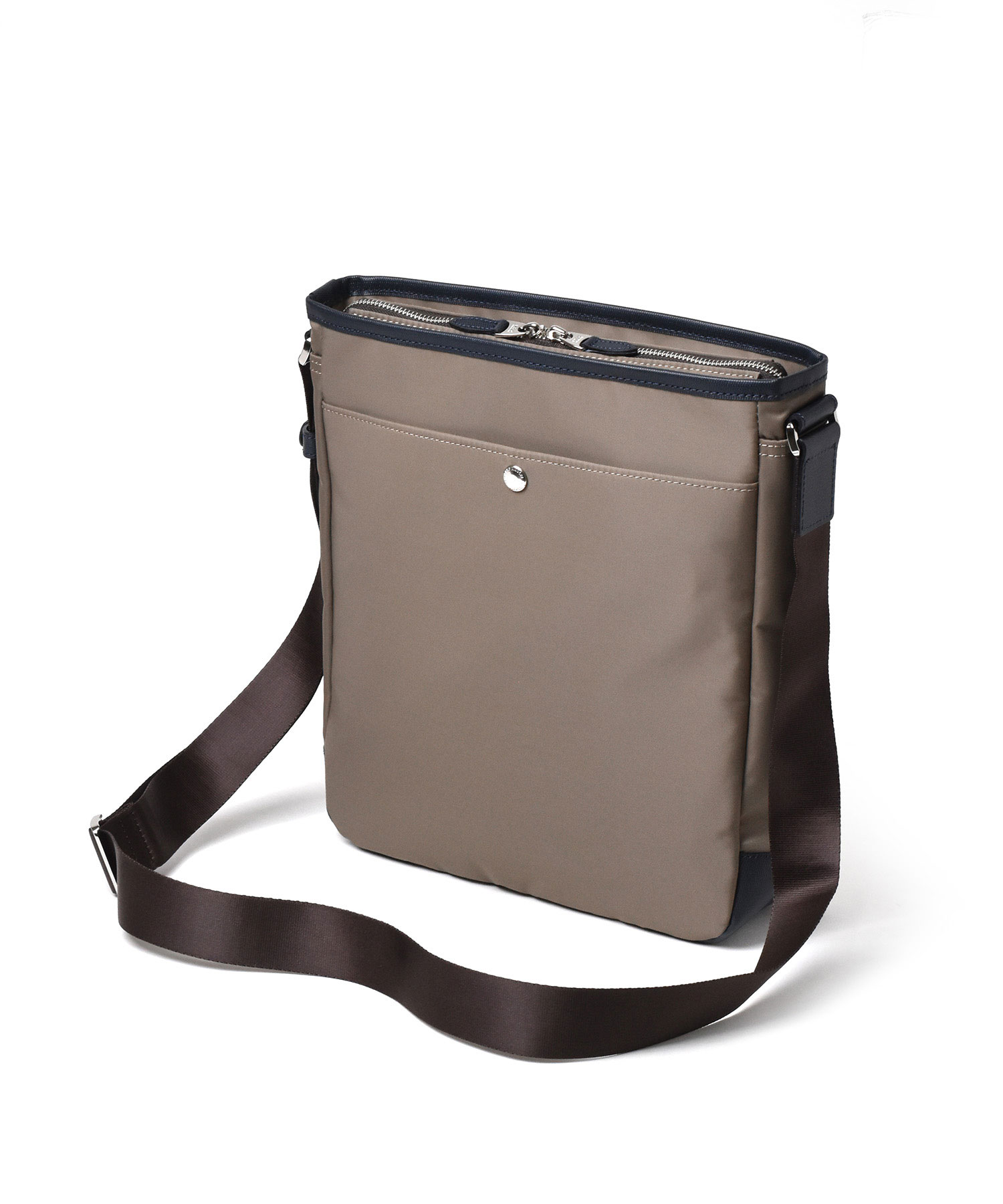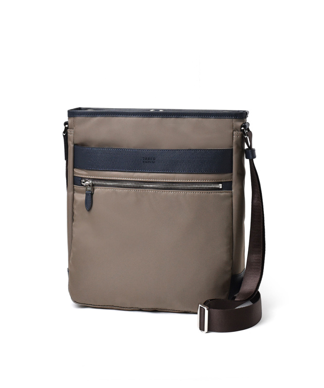 上品な光沢感と発色の良さが特徴のナイロンツイルを使用した、A4サイズのカジュアルショルダーバッグ。シンプルで使いやすいデザインの中に、付属革やメタルパーツでタケオキクチらしいこだわりを表現しています。