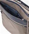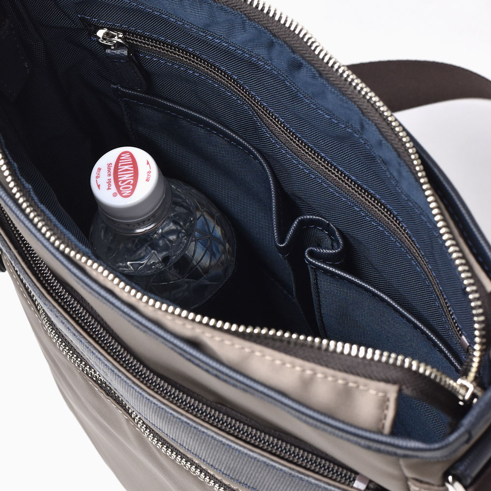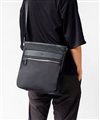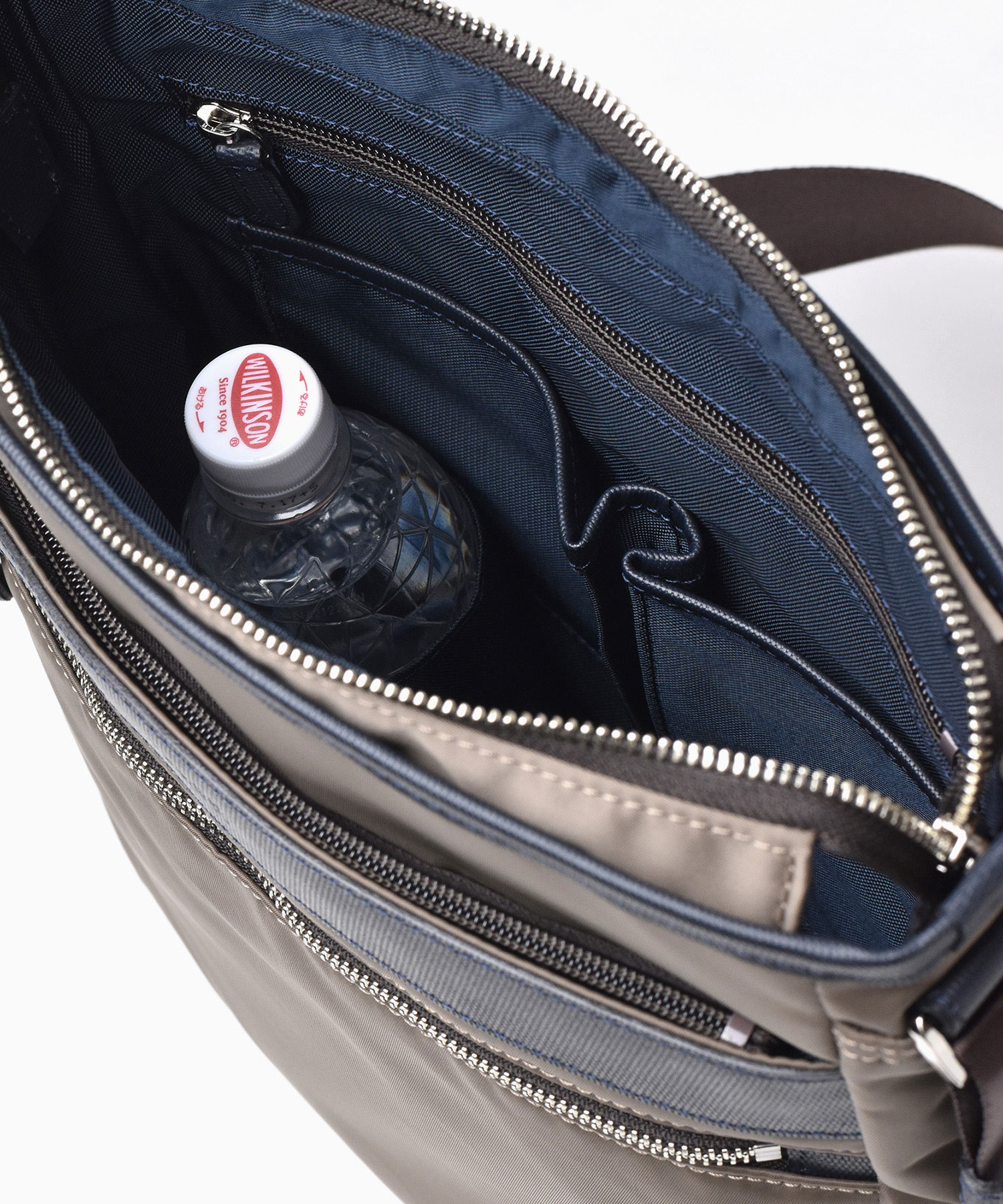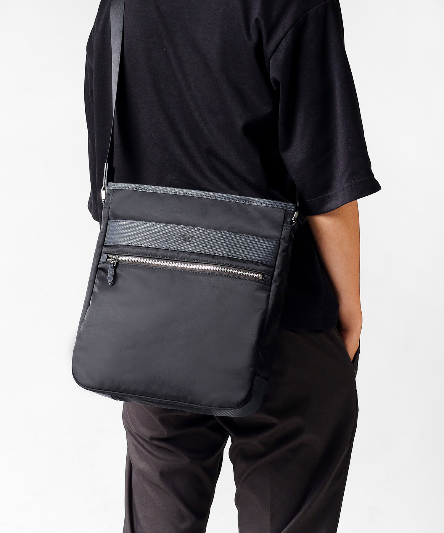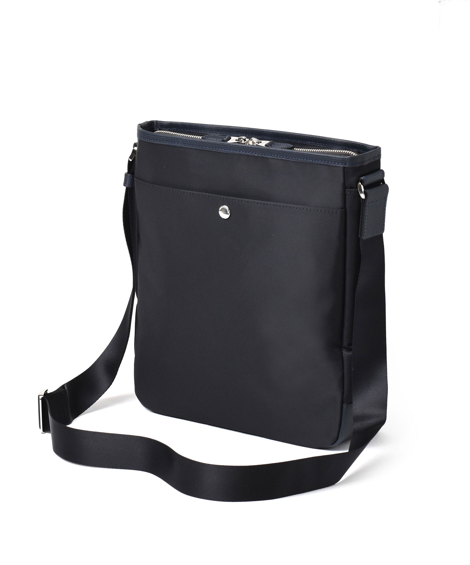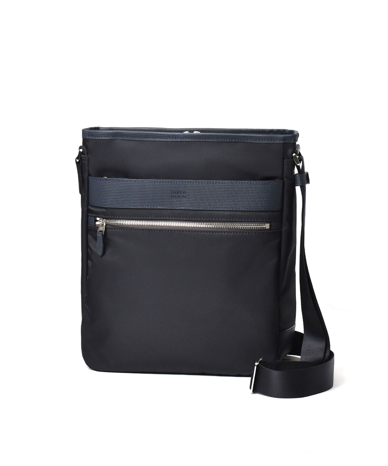 上品な光沢感と発色の良さが特徴のナイロンツイルを使用した、A4サイズのカジュアルショルダーバッグ。シンプルで使いやすいデザインの中に、付属革やメタルパーツでタケオキクチらしいこだわりを表現しています。本体素材には、上品な光沢感と発色の良さが特徴のナイロンツイルを使用しています。付属革にはミニメッシュエンボスレザーを使用。マットブラック色の箔押しを施し、ブランドネームをさり気なく引き立てています。