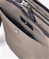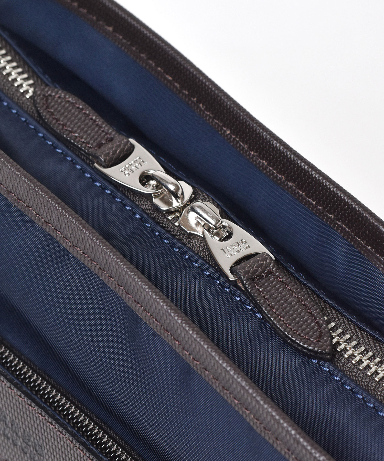 本体素材には、上品な光沢感と発色の良さが特徴のナイロンツイルを使用しています。付属革にはミニメッシュエンボスレザーを使用。マットブラック色の箔押しを施すことで、ブランドネームをさり気なく引き立てています。