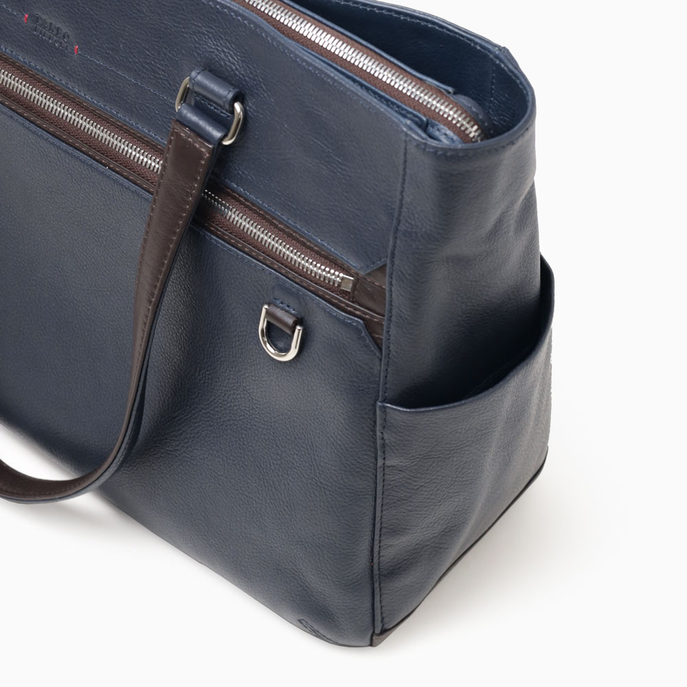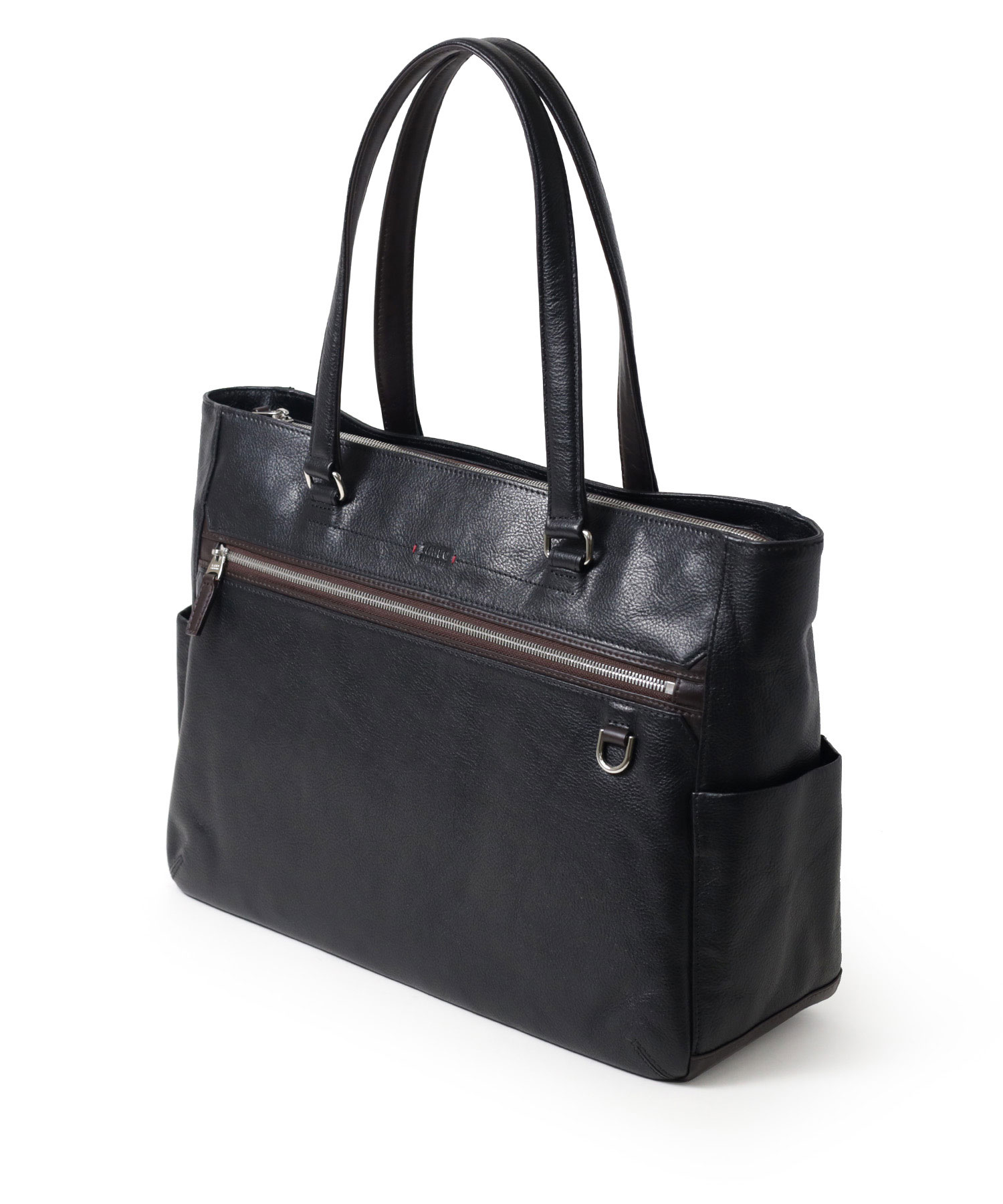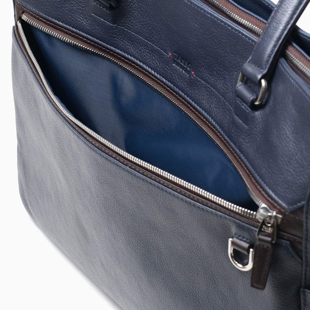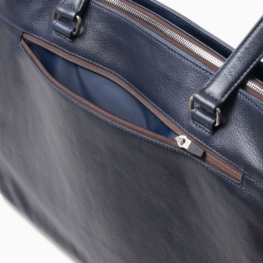 ON/OFF問わずお使いいただける、B4サイズのビジネスレザートートバッグ。内装にはビジネスに必要な機能性を持たせ、外観は様々なスタイルに合わせやすいシンプルなデザインになっています。 本体素材には、撥水加工を施したエンボスシュリンクシボの牛革を使用。傷が目立ちにくいのが特徴で、雨の日も安心してお使いいただけます。