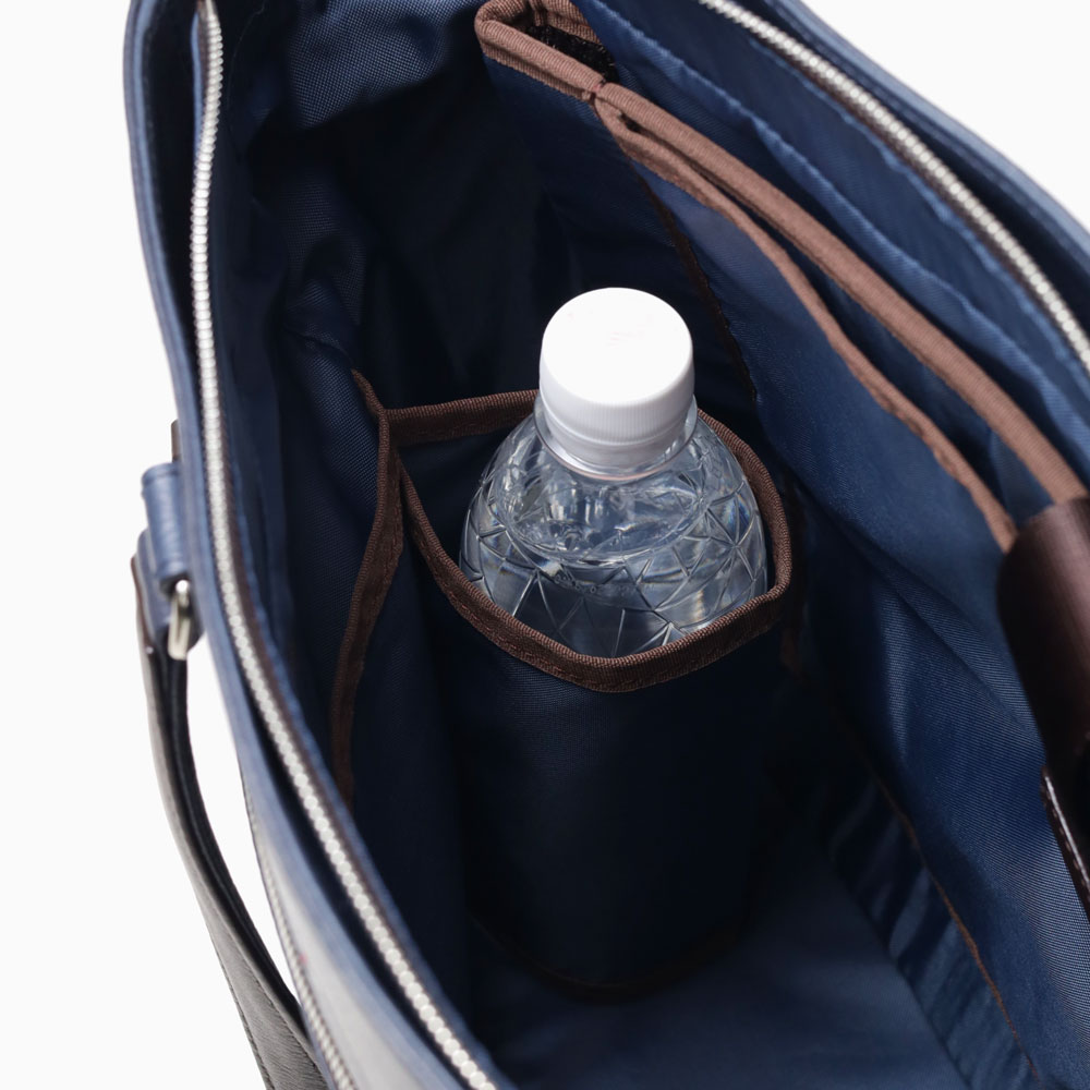 メインルームにはクッション付きポケットが2つ、ファスナーポケット、オープンポケットが2つ、ペットボトルホルダーがあり、ビジネスユースに必要な機能が揃っています。クッション付きの①タブレット収納ポケットと②PC収納ポケット(13.3inchノートPC対応)が備わっているので、電子機器の持ち運びにも困りません。