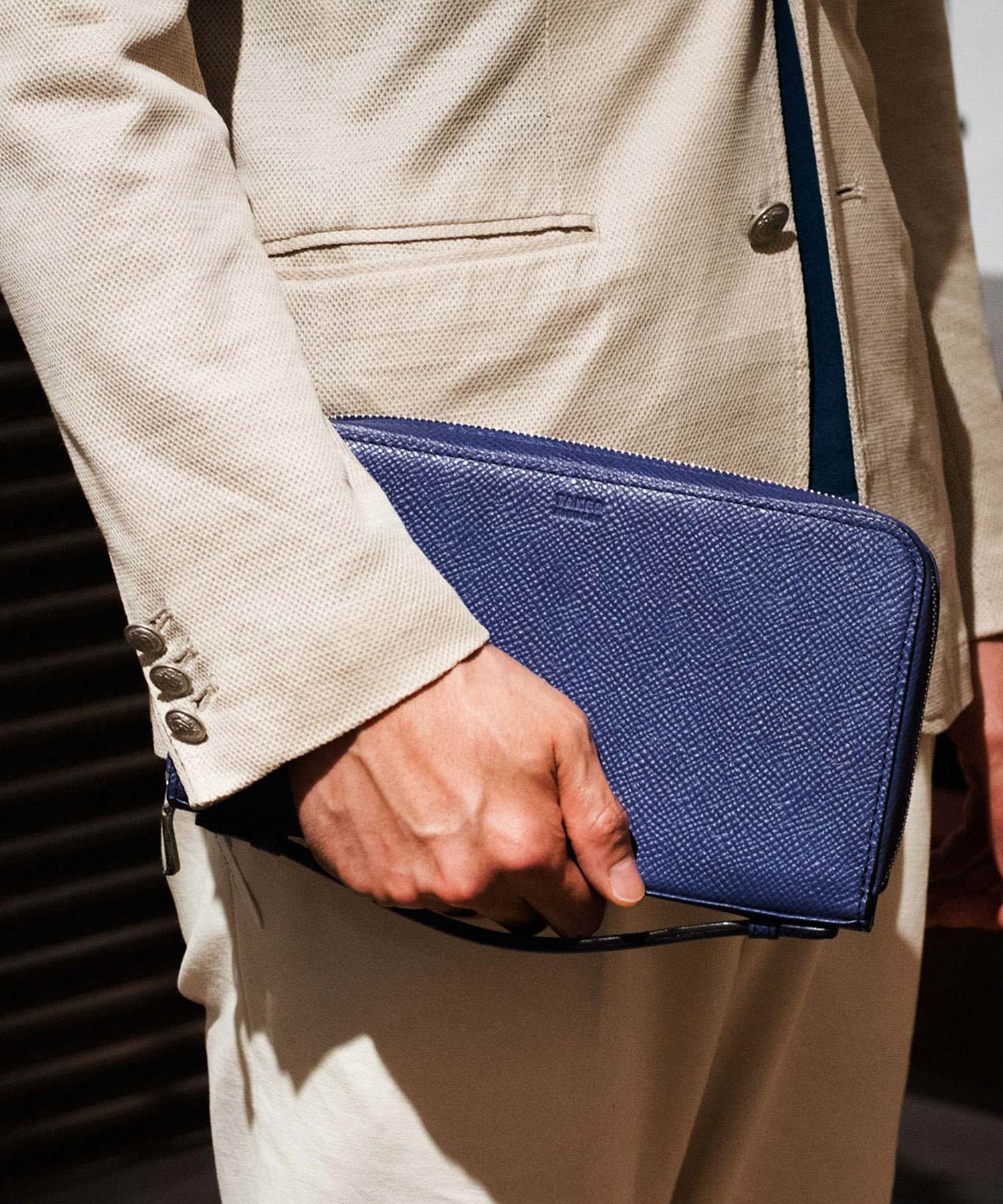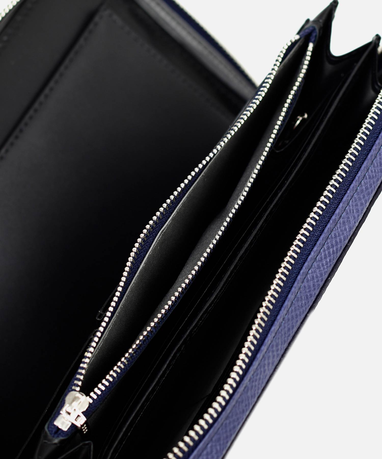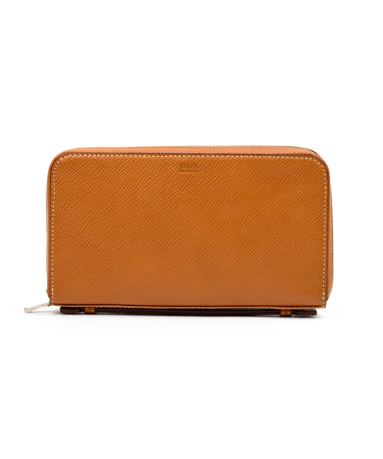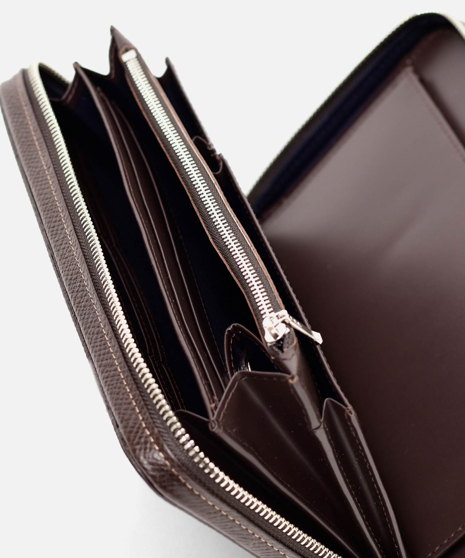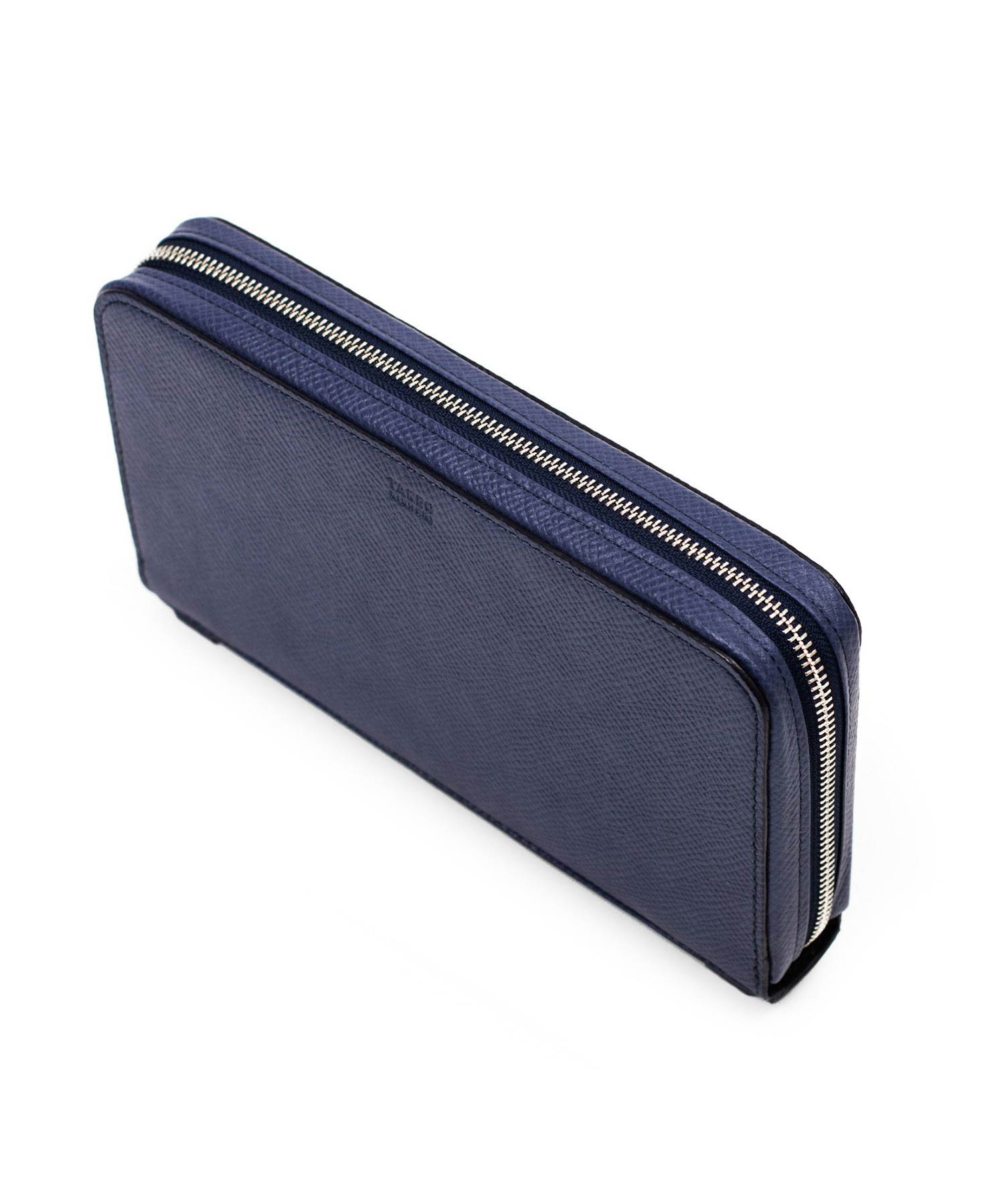 通常の財布としての機能に、スマートフォンや周辺機器、スマートキー等の収納機能をプラスしたTAKEO KIKUCHIのスマートセルバッグ。日々持ち歩く貴重品(カード、現金、スマホ、etc)を一つにまとめられる機能的なアイテムです。本体素材は、角シボのエンボス加工を施したレザーにアイロン加工を施し、ナチュラルなツヤ感を出しています。