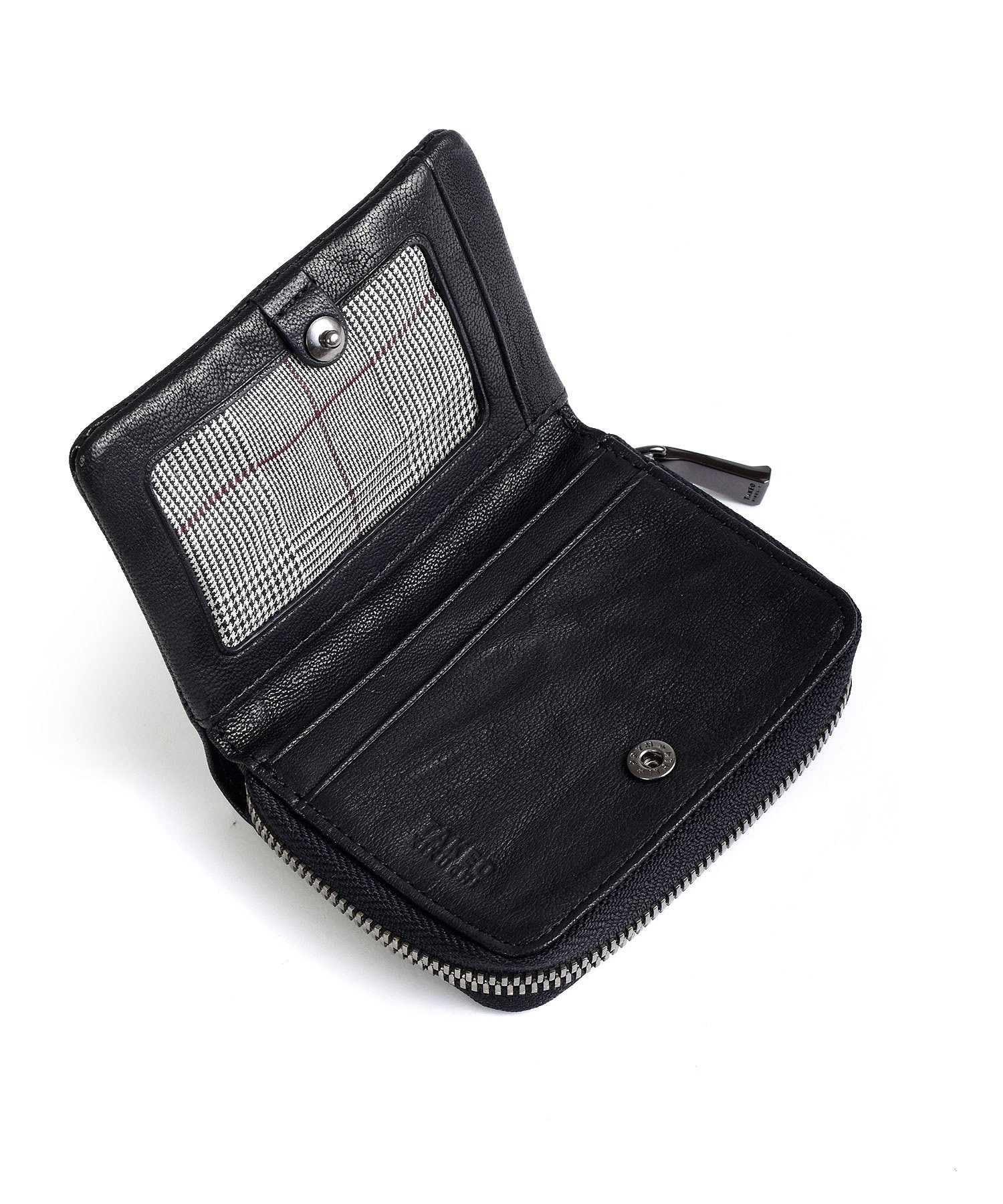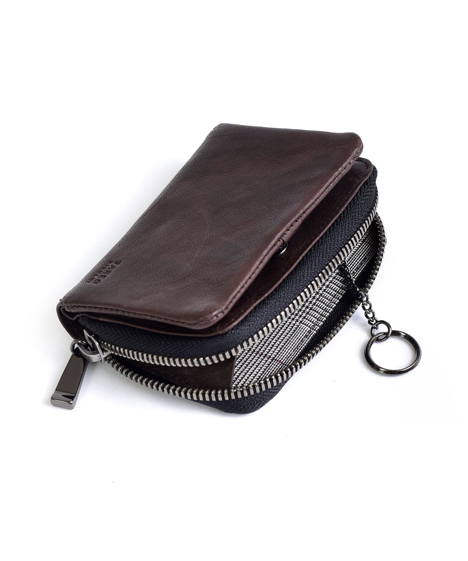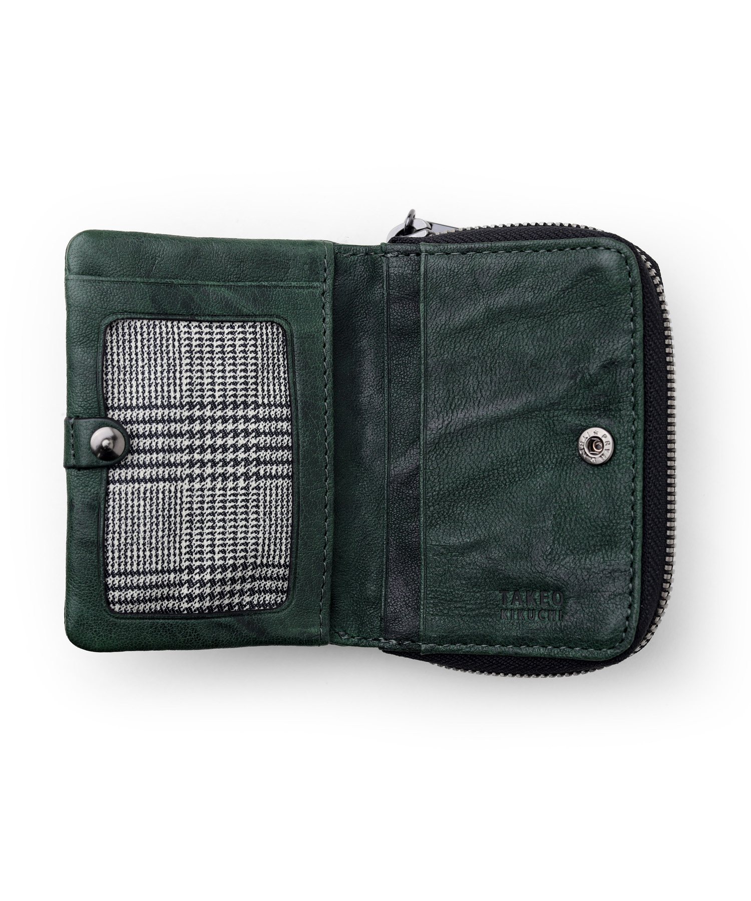 TAKEO KIKUCHIのブランドロゴが施されたファスナー引き手や、内装のグレンチェック柄など、随所にブランドらしさをちりばめています。また、ファスナーには太番手ファスナーを使用することで、収納力を上げています。