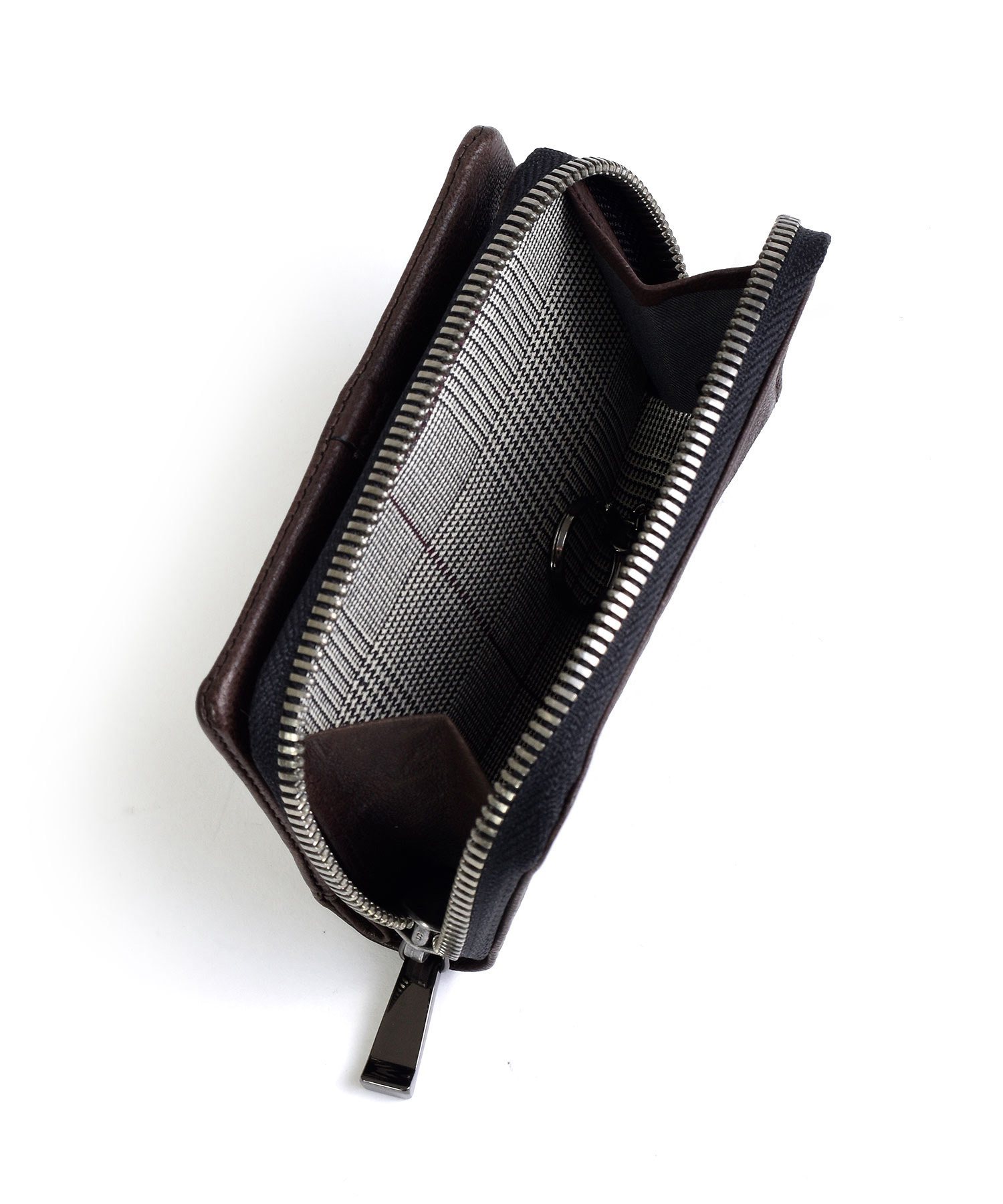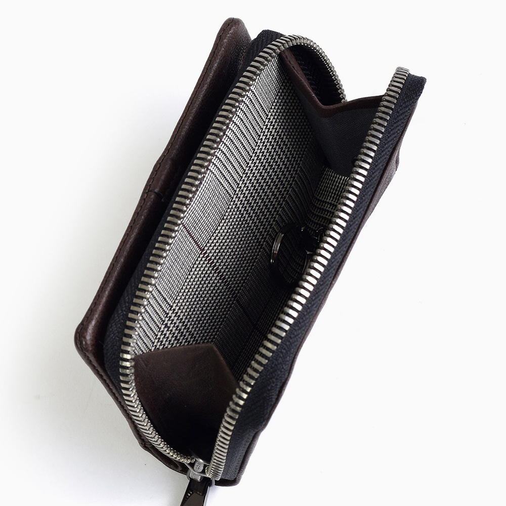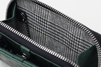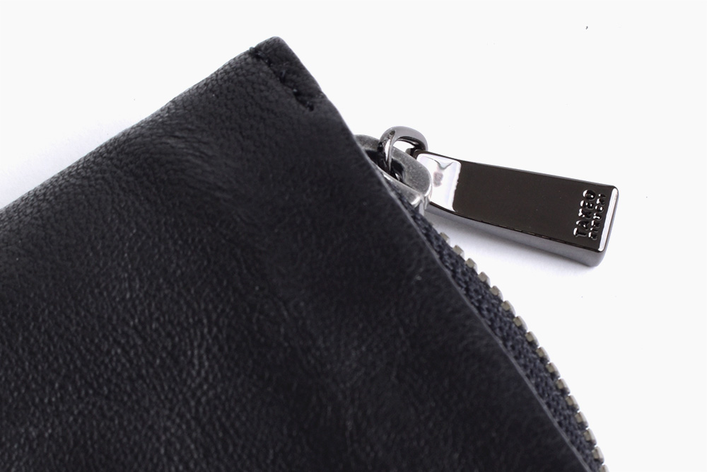 TAKEO KIKUCHIのブランドロゴが施されたファスナー引き手や、内装のグレンチェック柄など、随所にブランドらしさをちりばめています。また、ファスナーには太番手ファスナーを使用することで、収納力を上げています。