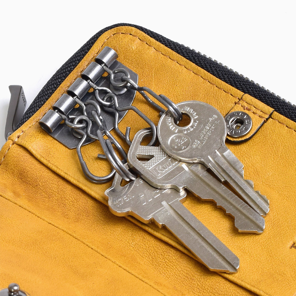 マルチに活躍するキーケースは、キーリング大1つ、小3つ、カードサイズポケットが2つ、ファスナー小銭入れが1つ、小銭入れ内にキーチェーンが1つあります。鍵、カード類、ちょっとしたお金をこれ1つに入れて持ち歩け、キャッシュレス社会にも対応したキーケースです。