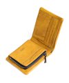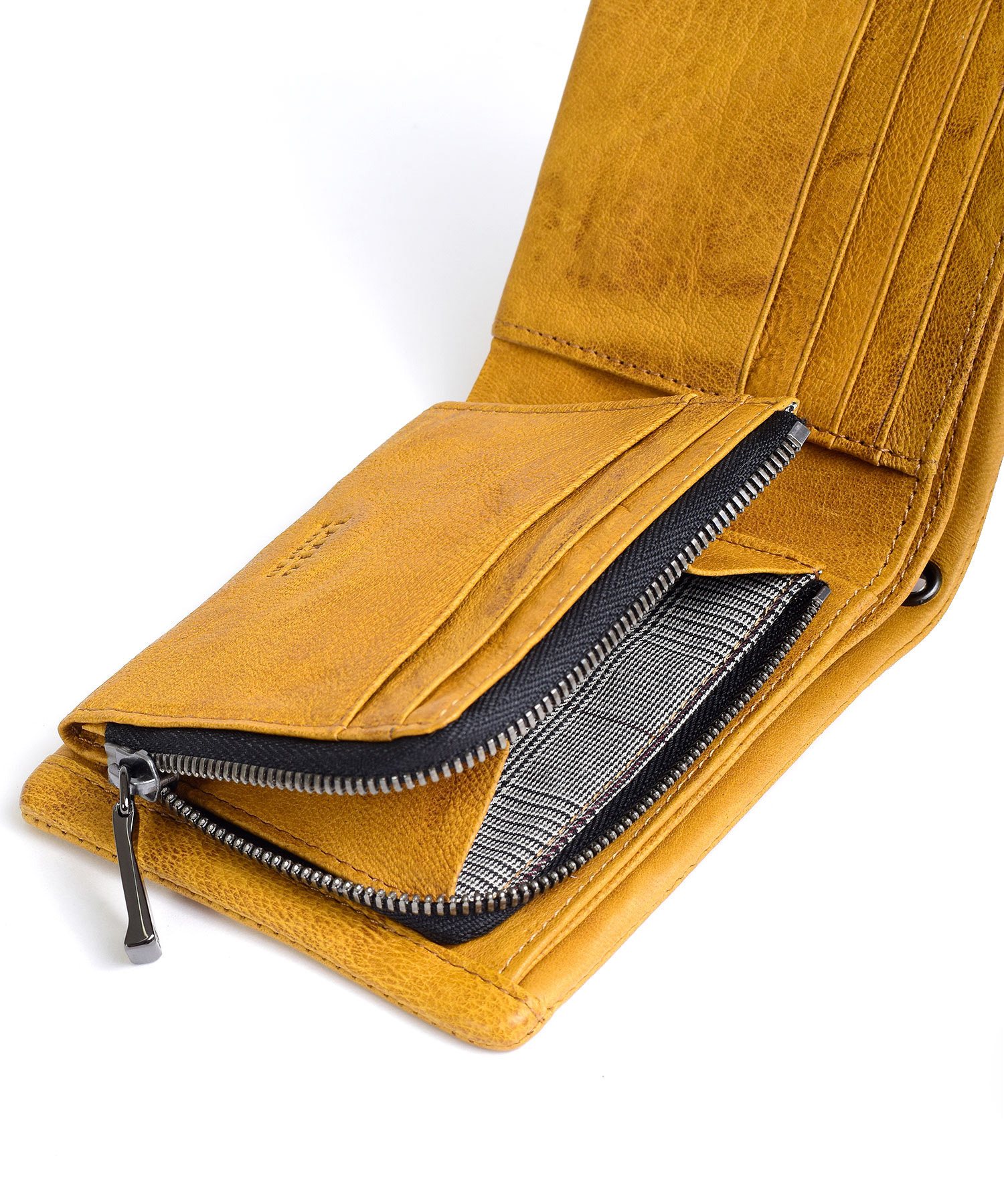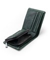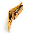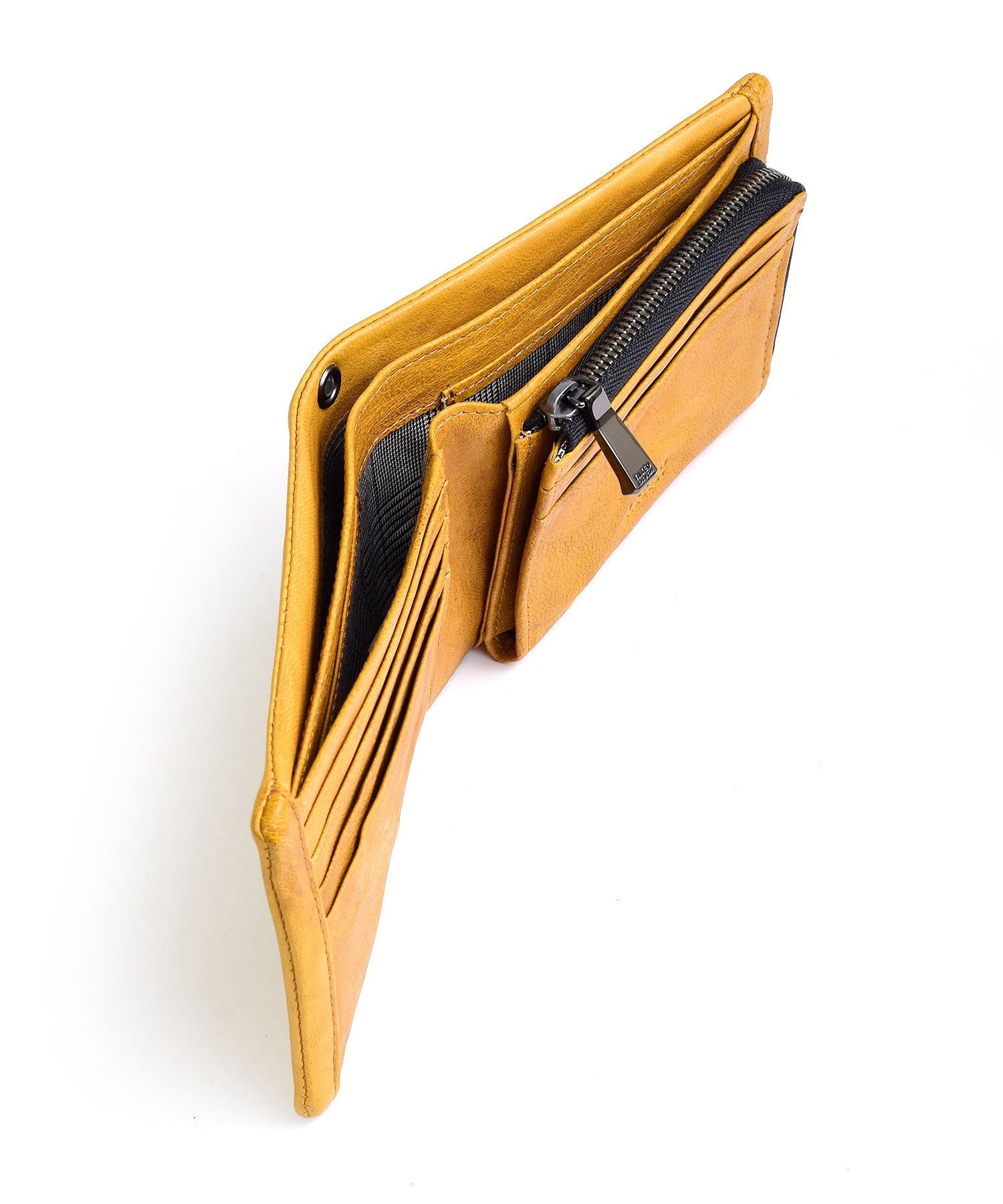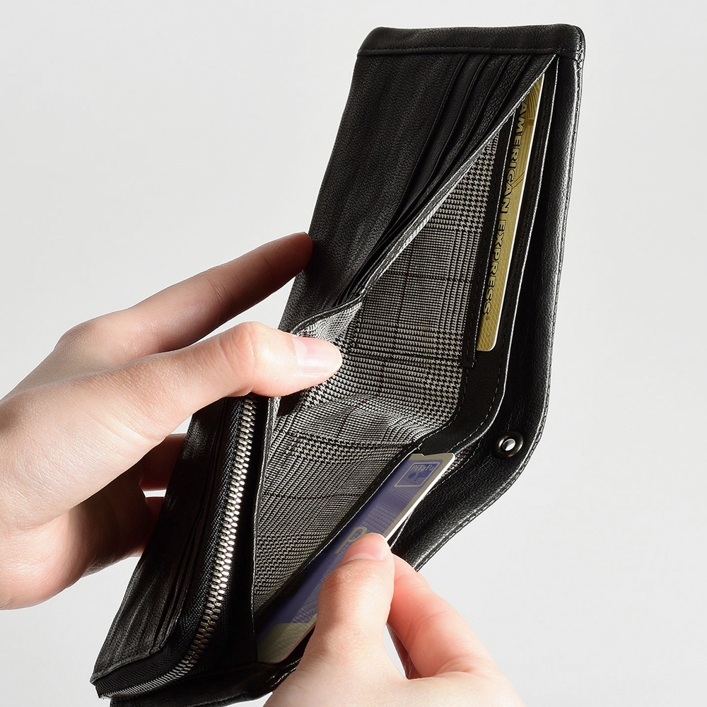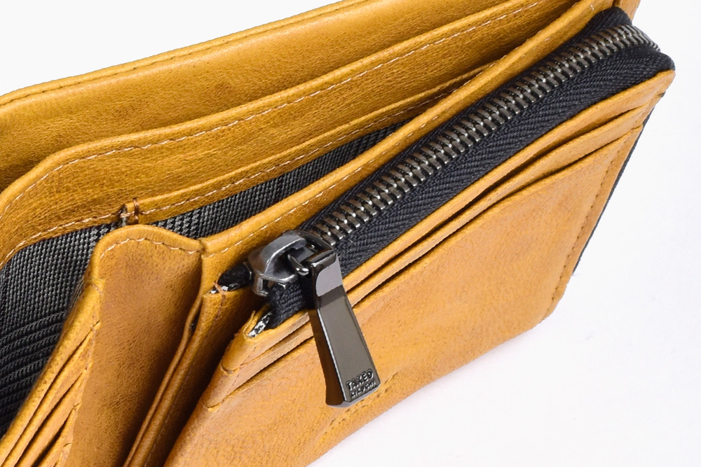 二つ折り財布は、札入れスペースが2つ、小銭入れが1つ、カード段が計8、フリーポケットが2つあります。小銭入れはL字ファスナーで、硬貨の確認が容易です。札入れ内にもカード段を設け、カード収納が豊富です。