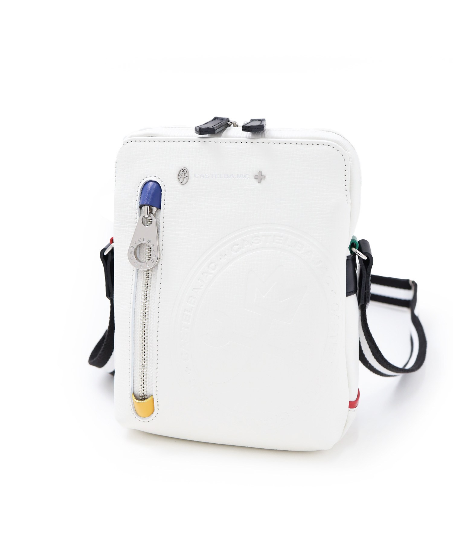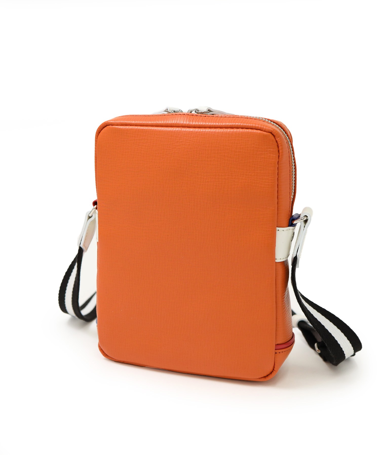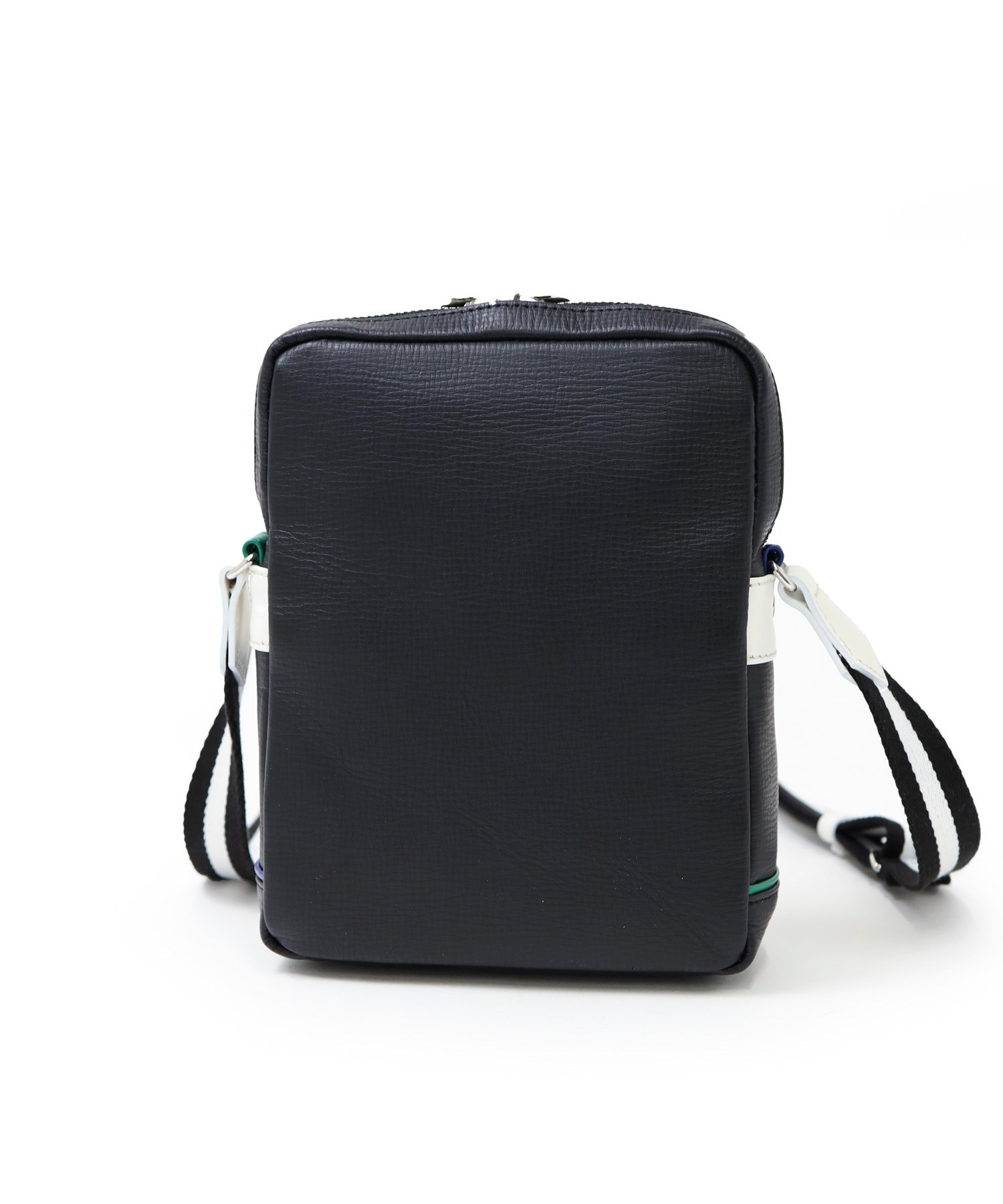 エンボスレザーに大胆な家紋とメタルパーツによるロゴ表現、ポイントに使用したバジャックカラーが魅力の日本製レザーミニショルダーバッグ。