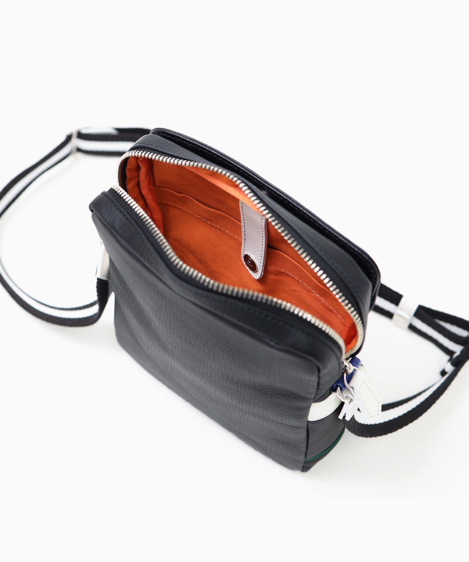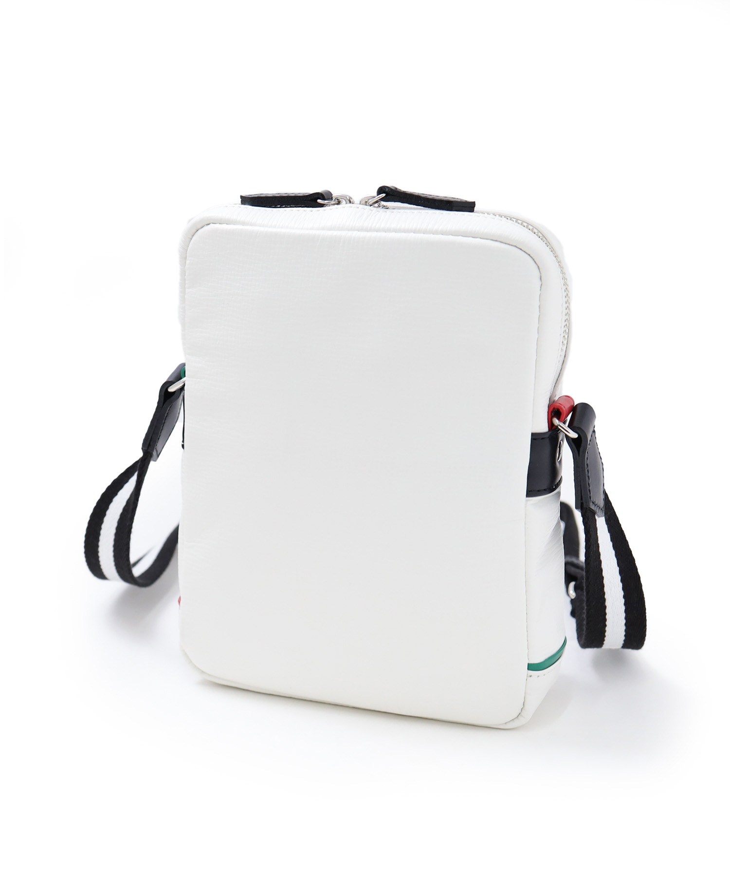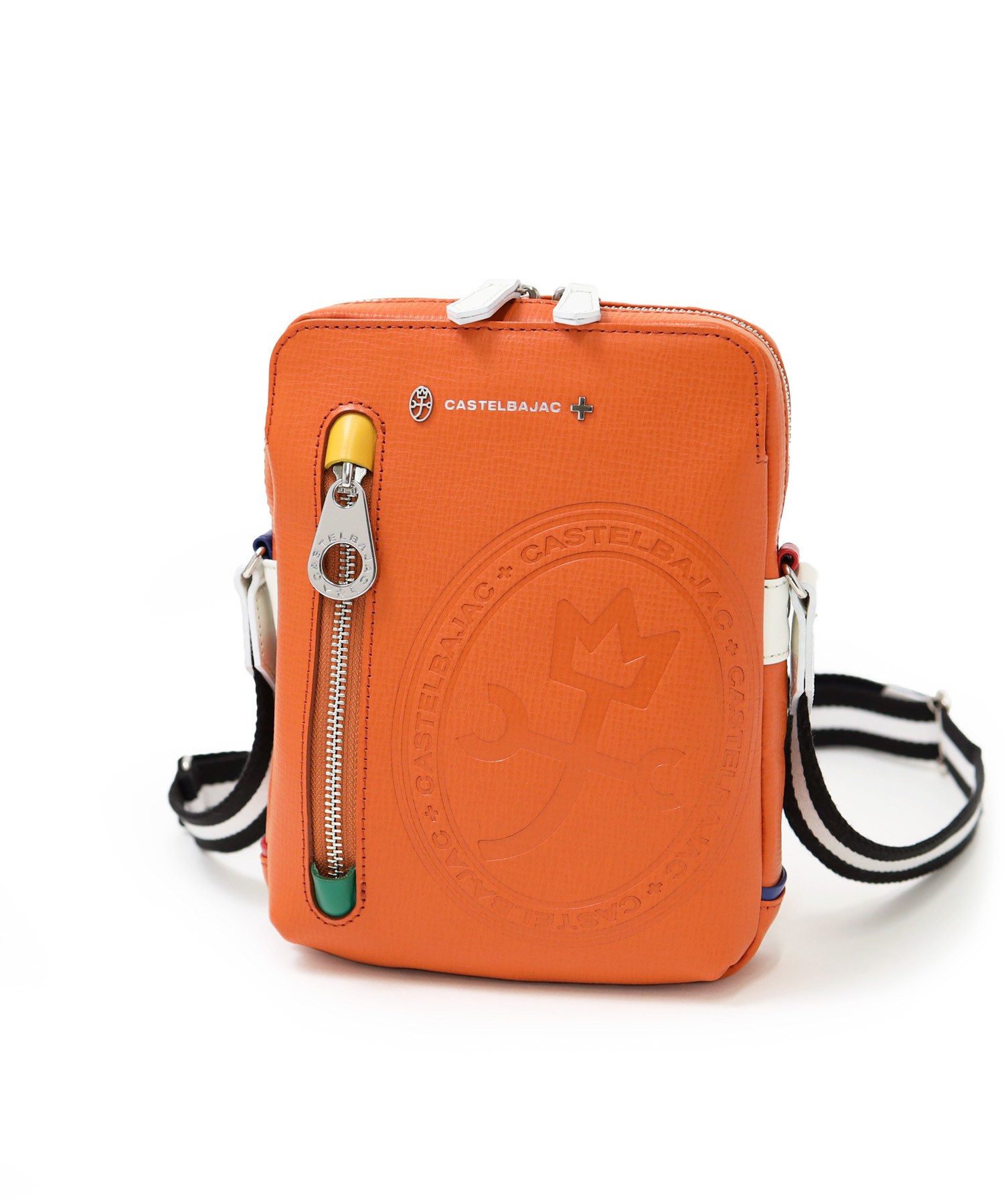 エンボスレザーに大胆な家紋とメタルパーツによるロゴ表現、ポイントに使用したバジャックカラーが魅力の日本製レザーミニショルダーバッグ。