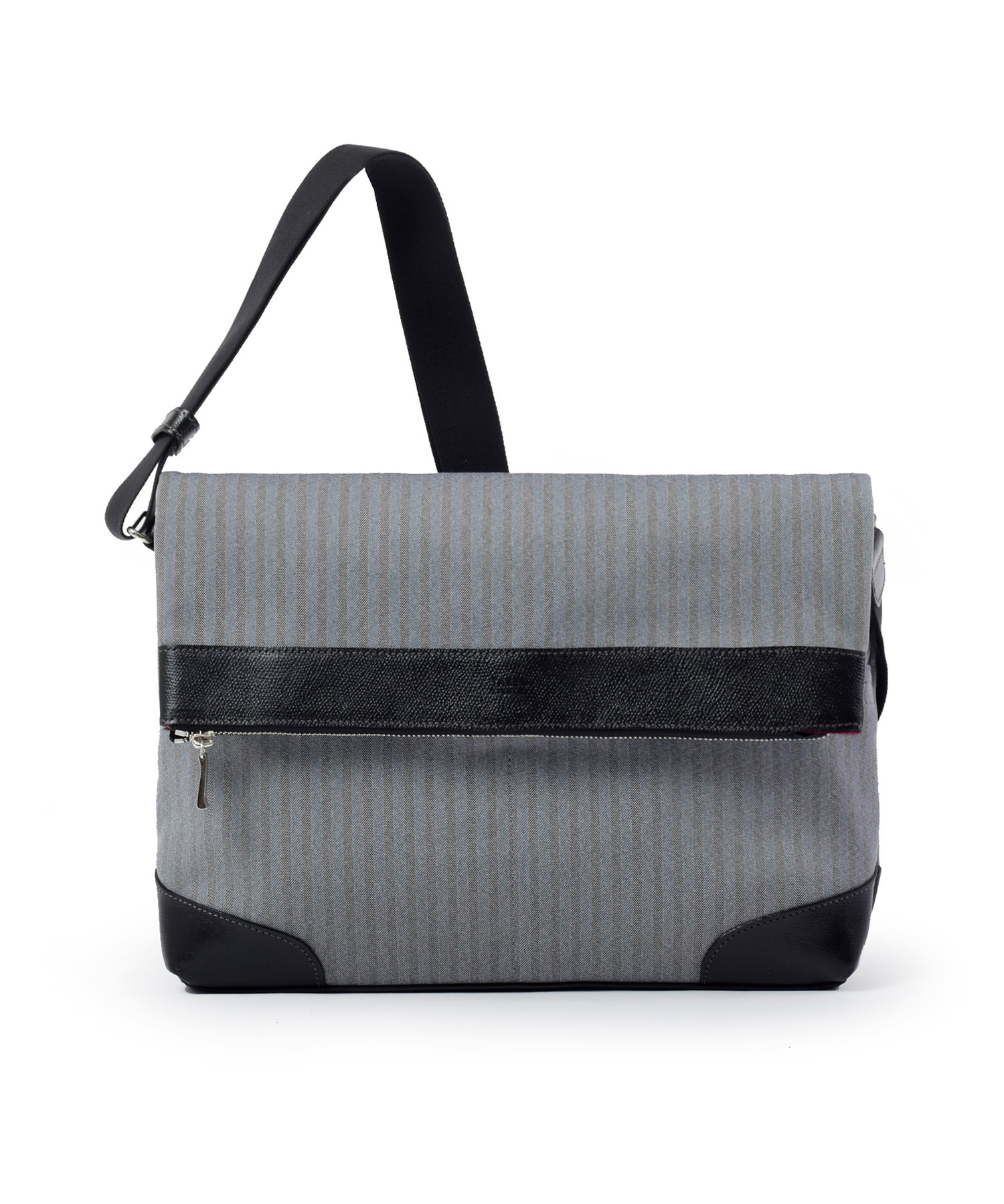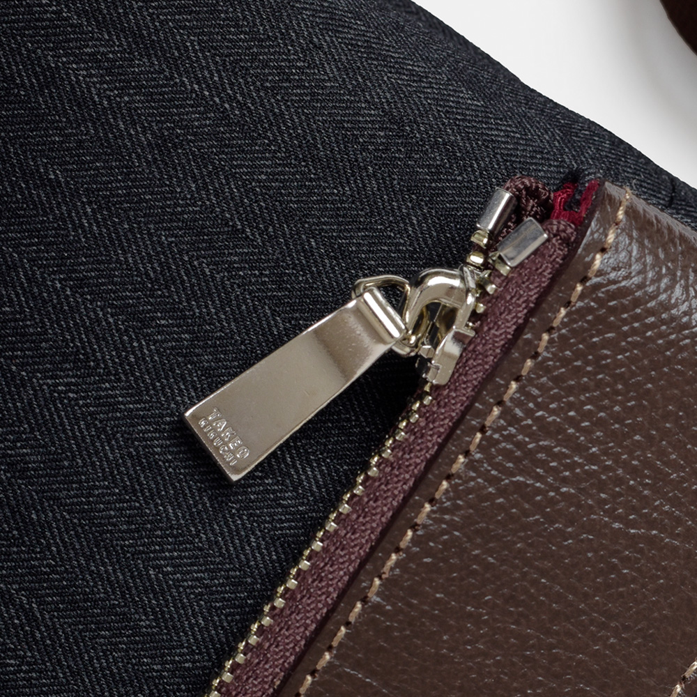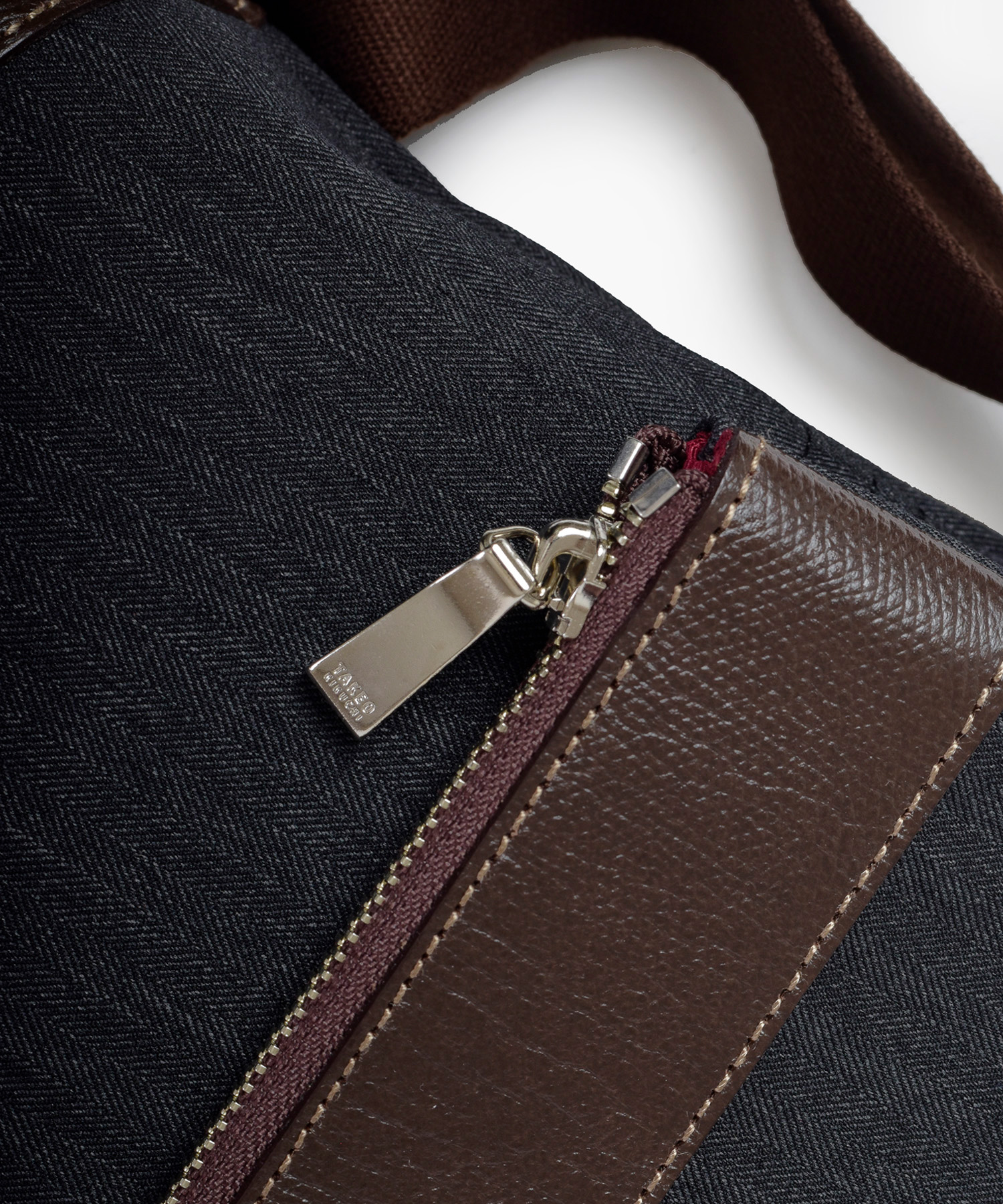 本体生地には高感度・多機能素材として主に服地で用いられるLANATEC(ラナテック)という抗ピリング加工が施された杢調ポリエステルを使用。ヘリンボーン柄で織られた素材感のある大人っぽい印象の素材になります。 表面には撥水加工を施し、裏面にカツラギを溶剤で圧着していますので、汚れが付きにくく、水が中に染み込むことがなく、抗ピリング加工により耐久性もある鞄用素材に仕上がっています。