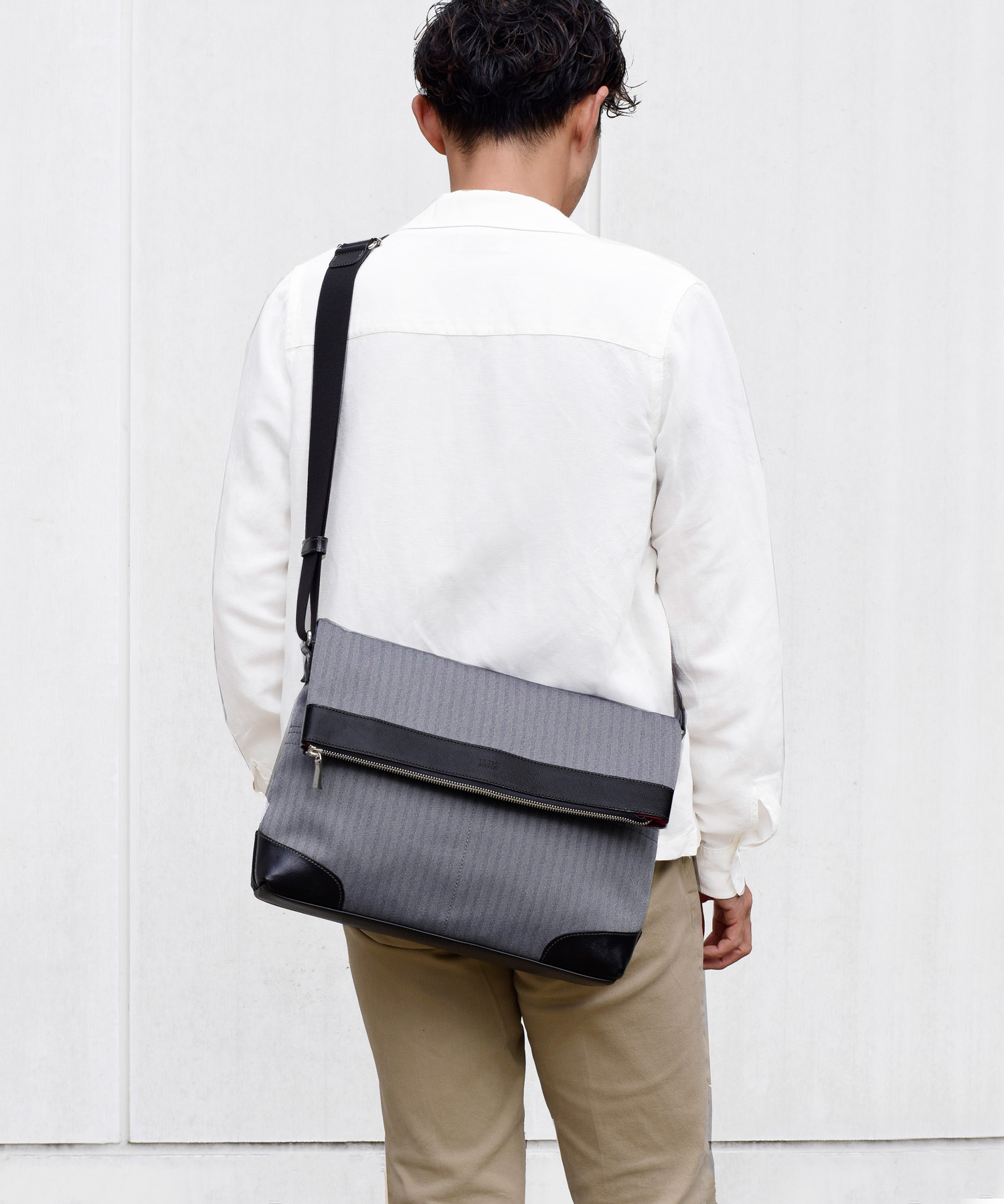 大人な雰囲気の杢調ヘリンボーン生地を使用した、TAKEO KIKUCHIのカジュアルショルダーバッグ。タブレット・スマホが入れられるクッションつきポケットの搭載や、かぶせ部分を開けなくてもメインルームに繋がる背面ファスナーなど、機能面も高めた、安心の日本製バッグです。 本体素材には汚れが付きにくく、水が中に染み込むことがなく、耐久性もある鞄用素材を使用しました。実際にTAKEO KIKUCHIのアパレルでも同様の生地が使用され、アパレルブランドらしい布帛生地を使用したデザイン性と、多機能素材を併せ持ちます。