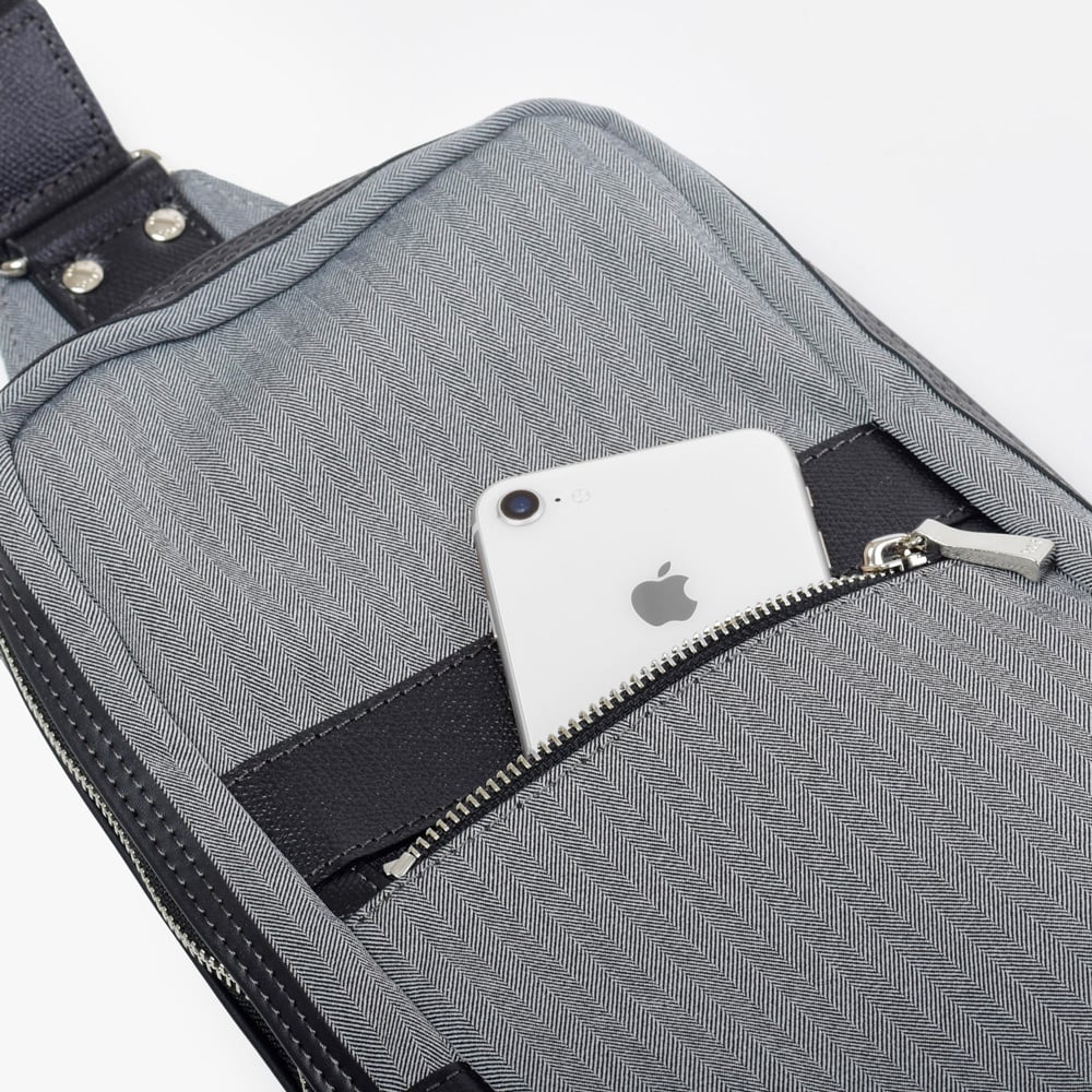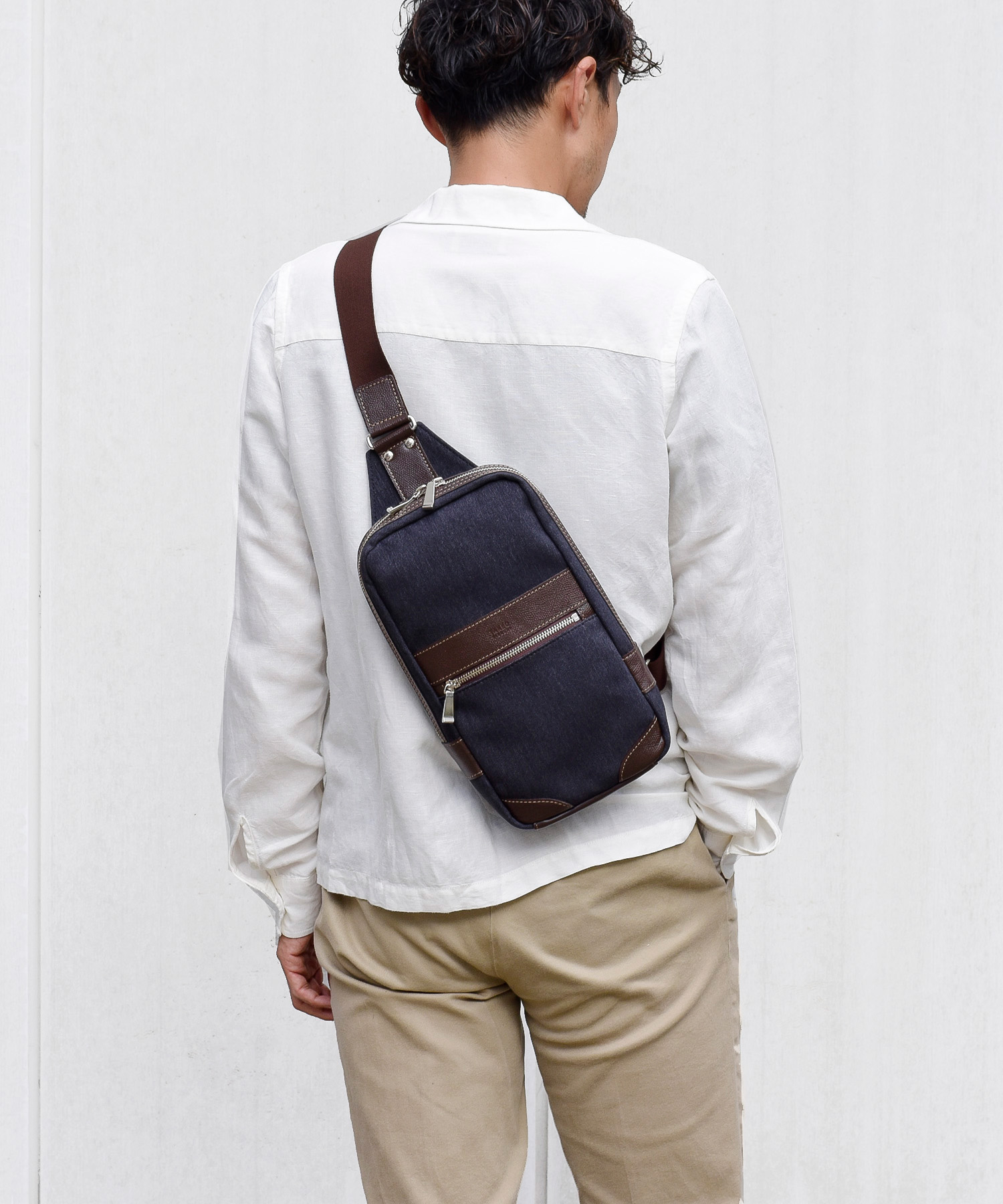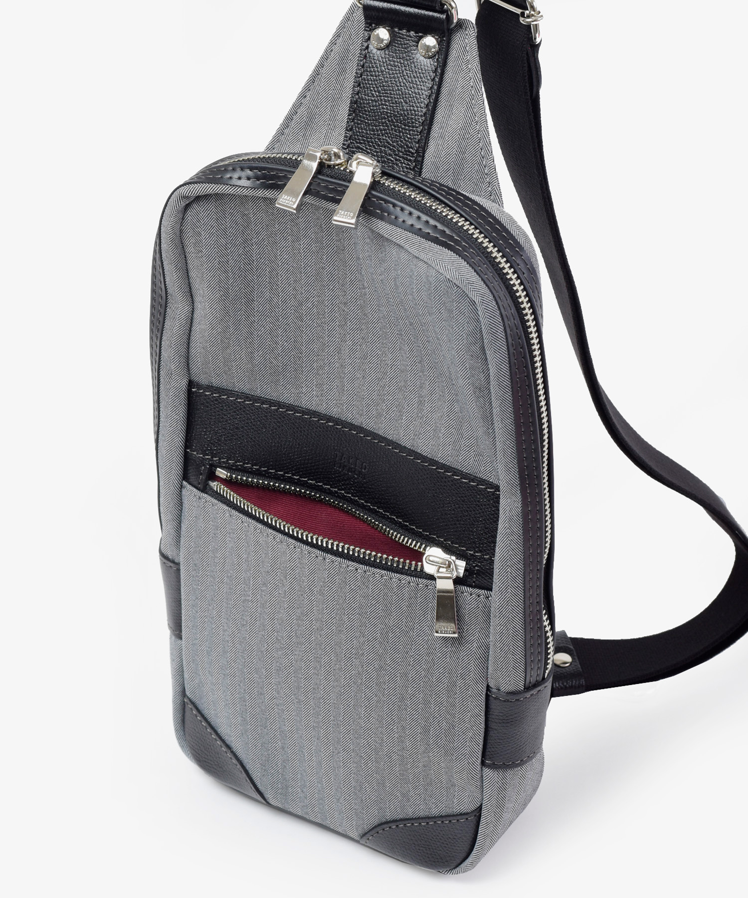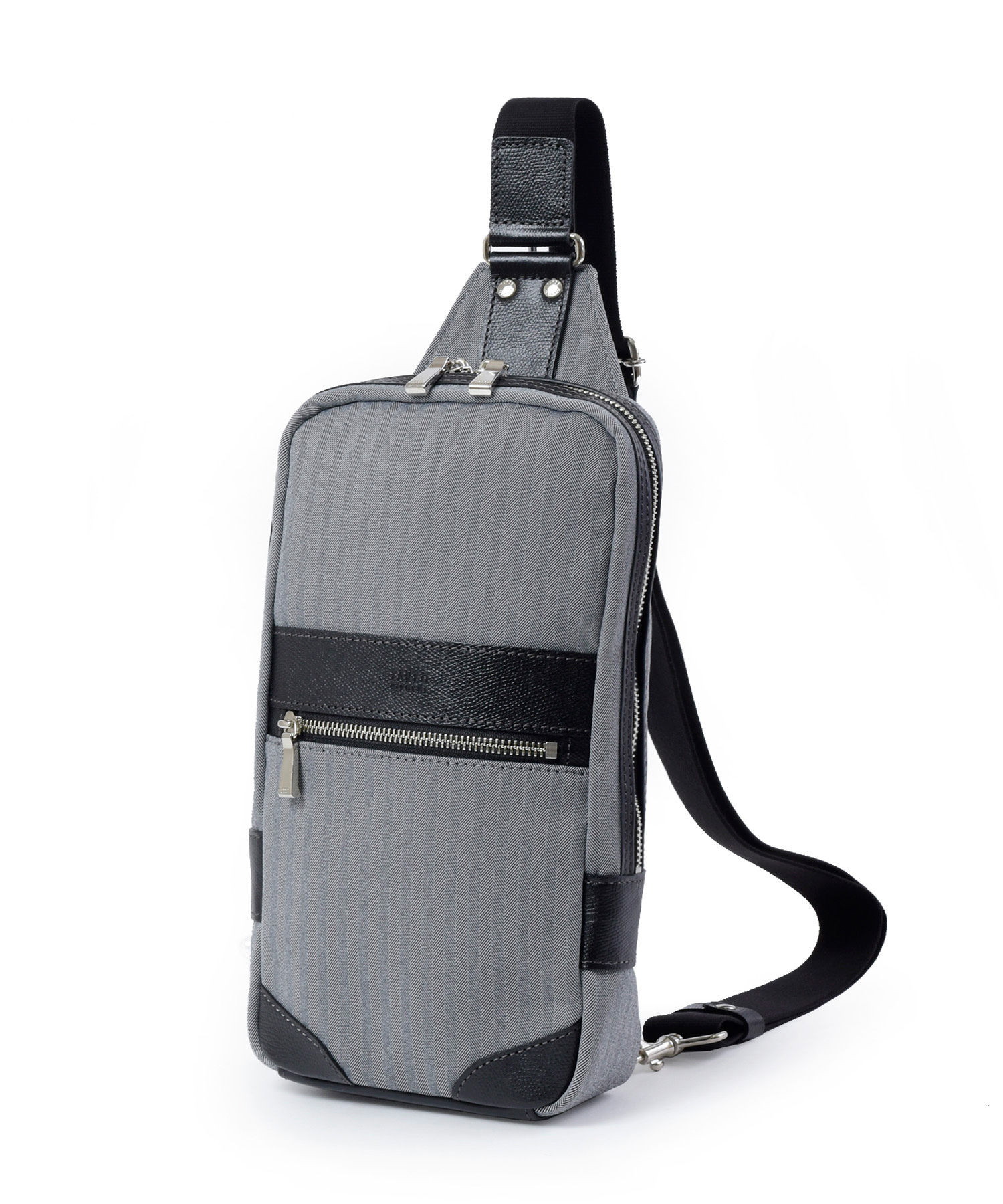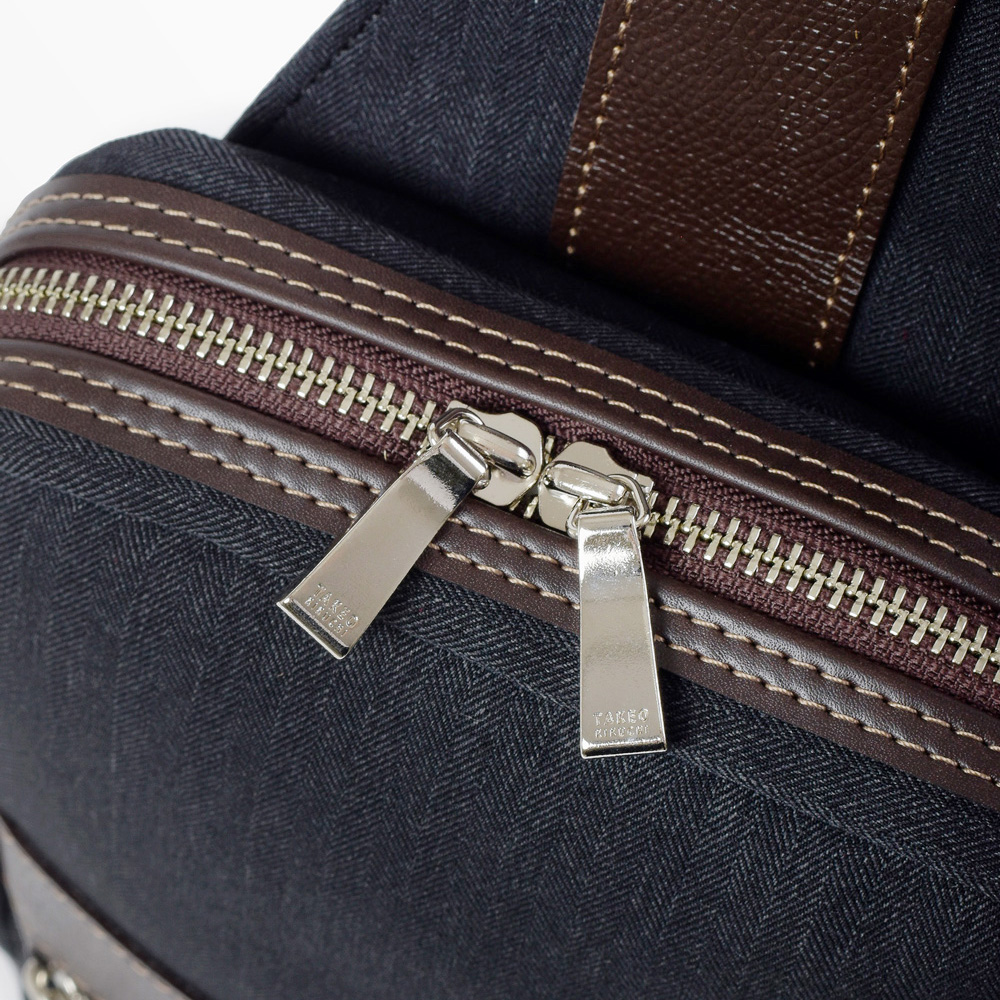 大人な雰囲気の杢調ヘリンボーン生地を使用した、TAKEO KIKUCHIのカジュアルワンショルダーバッグ。休日の散策にジャストサイズのコンパクト設計ながら、外出に必要な物をたっぷり収納する事が出来る機能面も高めた、安心の日本製バッグです。 本体素材には汚れが付きにくく、水が中に染み込むことがなく、耐久性もある鞄用素材を使用しました。実際にTAKEO KIKUCHIのアパレルでも同様の生地が使用され、アパレルブランドらしい布帛生地を使用したデザイン性と、多機能素材を併せ持ちます。