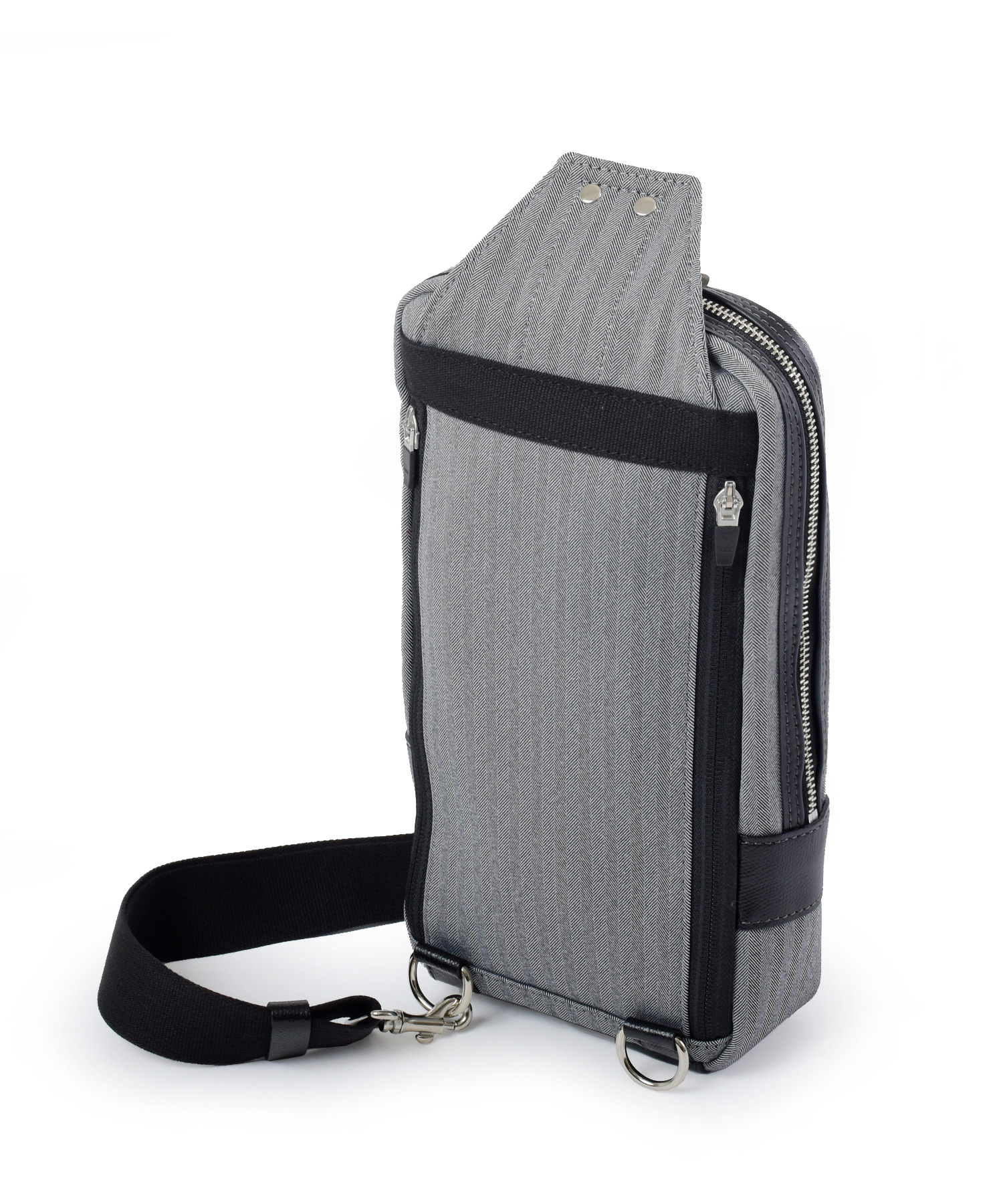 本体生地には高感度・多機能素材として主に服地で用いられるLANATEC(ラナテック)という抗ピリング加工が施された杢調ポリエステルを使用。ヘリンボーン柄で織られた素材感のある大人っぽい印象の素材になります。 表面には撥水加工を施し、裏面にカツラギを溶剤で圧着しているので、汚れが付きにくく、水が中に染み込むことがなく、抗ピリング加工により耐久性もある鞄用素材に仕上がっています。 付属革は実績のあるチェルケス調エンボスのヌメ革を引き続き使用しています。しっかりとエンボスされ、上品なイメージと強度に優れた素材になります。