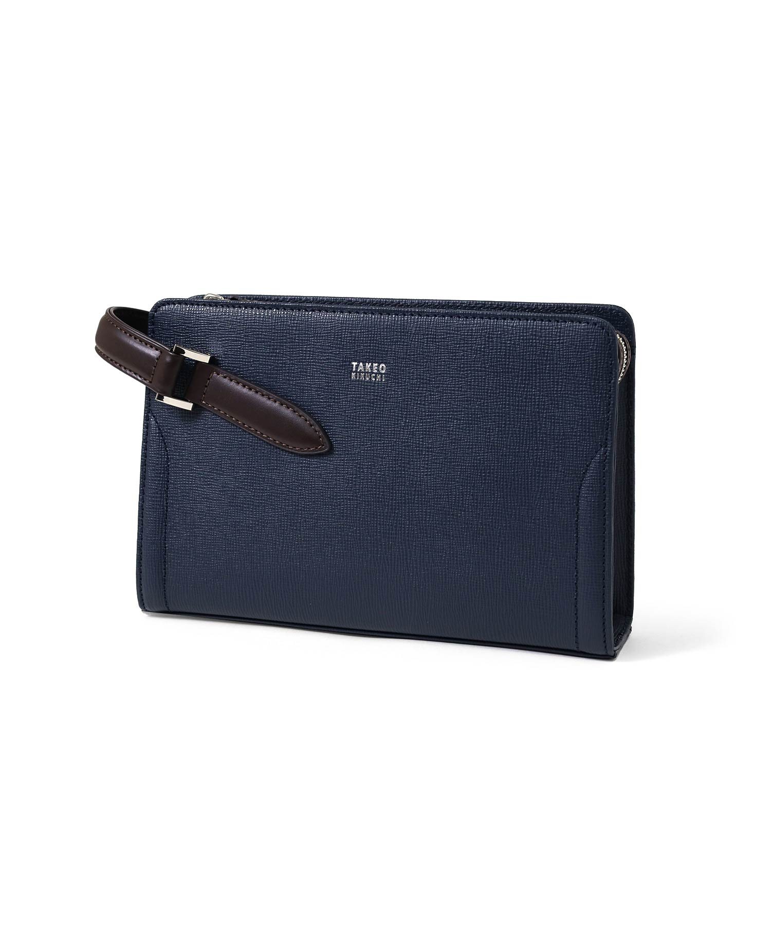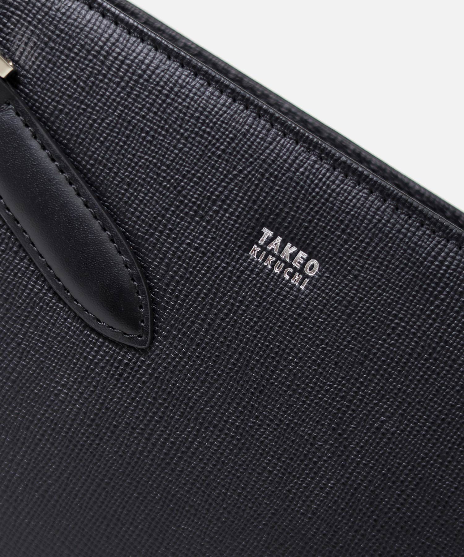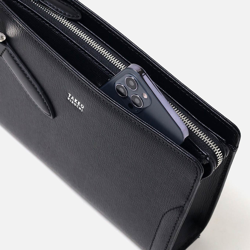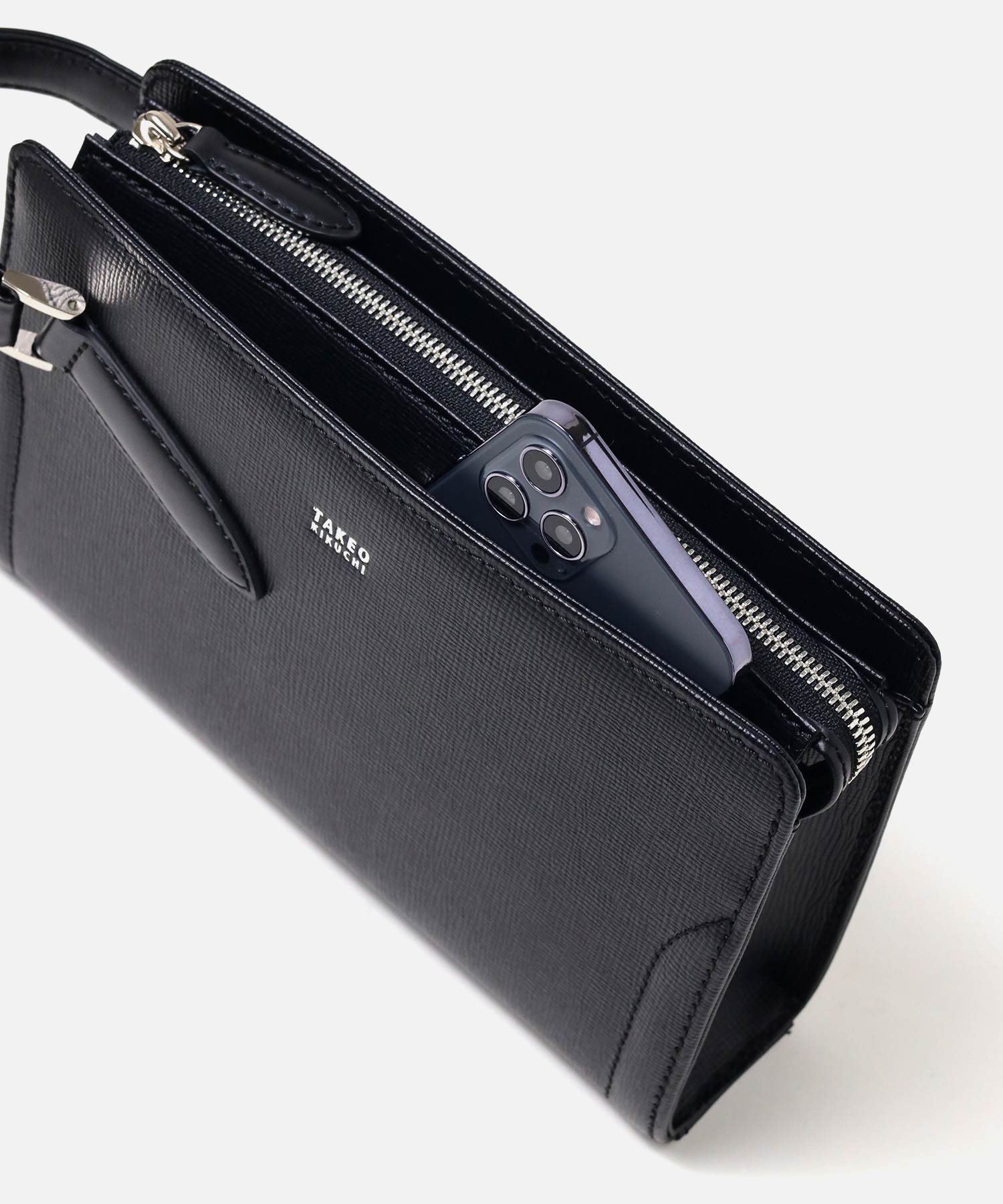 スーツスタイルにぴったりはまる、タケオキクチのスモールサイズのレザーメンズバッグ。品のあるレザー使いが、フォーマルなスーツスタイルと相性抜群。冠婚葬祭のシーンにも持てるシンプルなデザインのメンズバッグです。