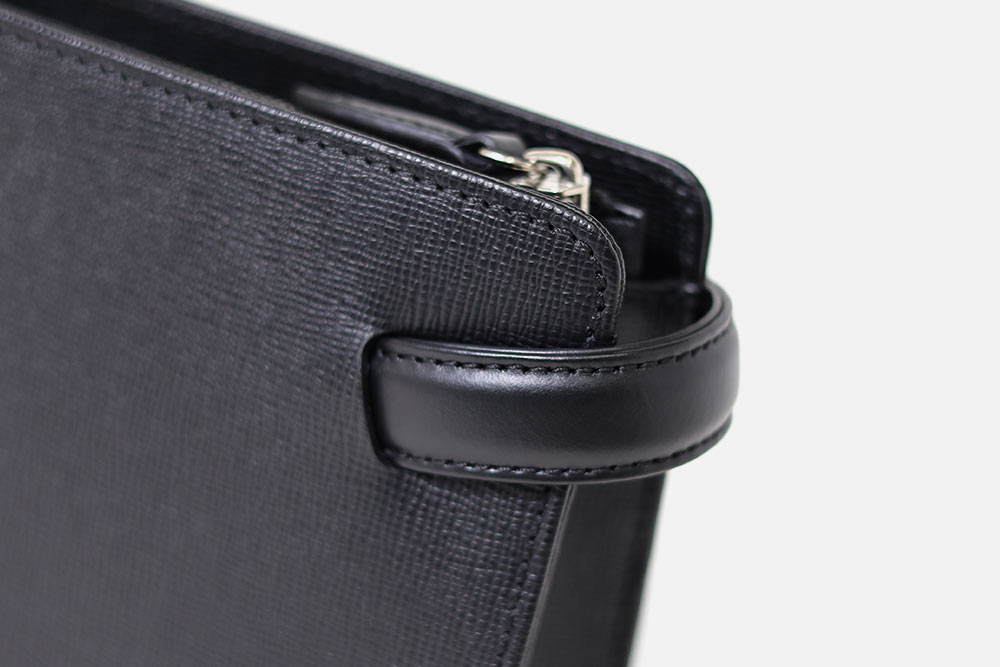 本体素材には、上品な角シボのエンボス加工を施した牛革を使用しています。頭と谷に艶の段差をつけることで、高級感のある仕上がりとなっています。また、キズも目立ちにくくお手入れも簡単です。