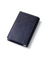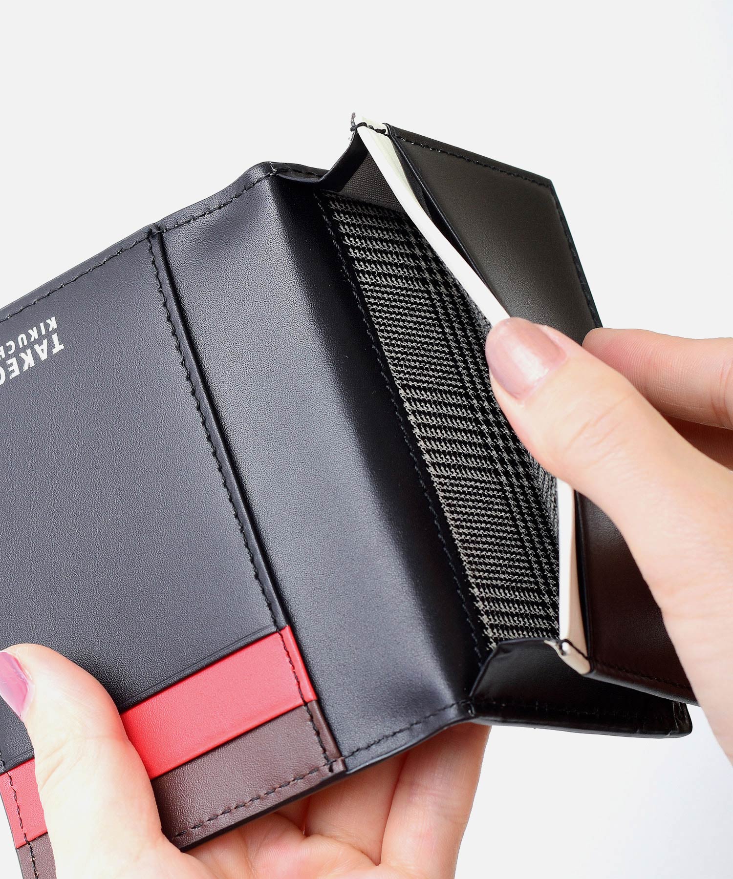 外装のベーシックカラーと、内装のトリコロールカラーのギャップが魅力の、小銭入れにもなるTAKEO KIKUCHIの名刺入れ。目の細かいシャープな格子柄が特徴的です。一部にブランドアイコンの柄であるグレンチェック柄の生地を採用しており、ベーシックながらもさりげなくブランドらしさを表現しています。