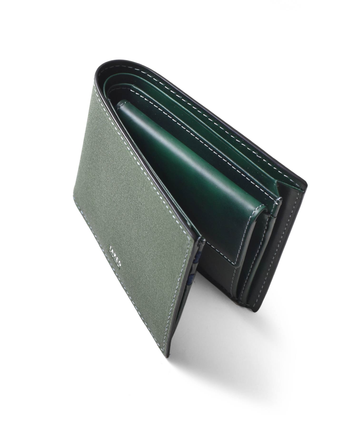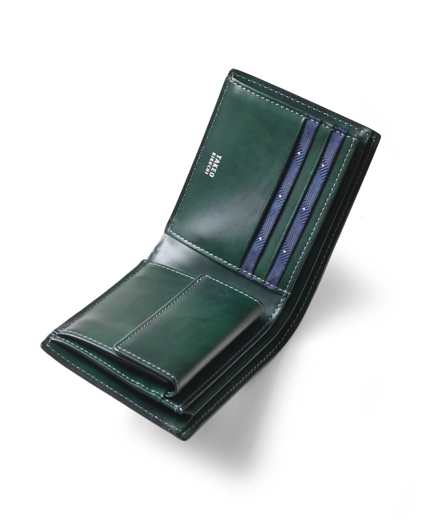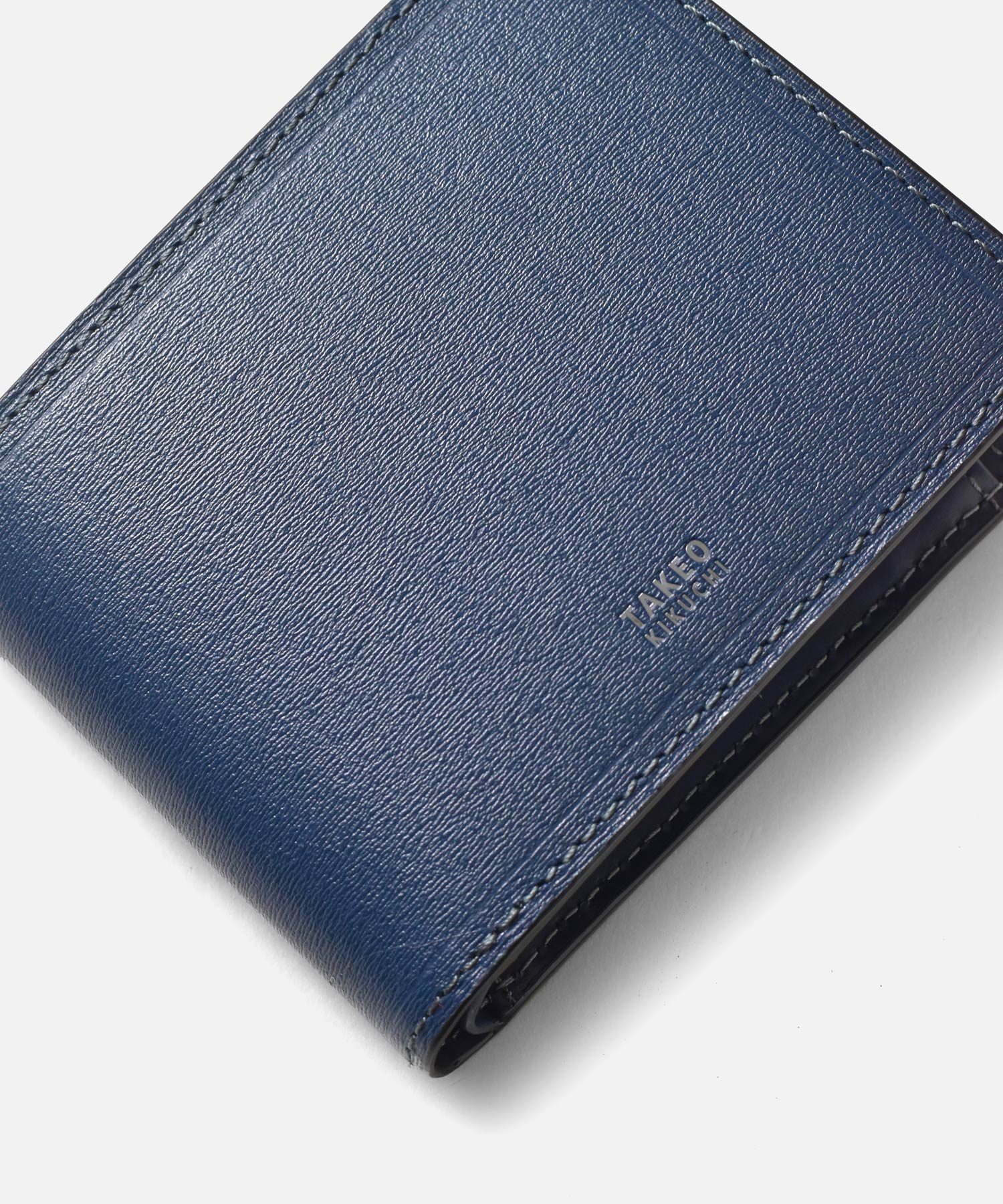 上質なイタリアンエンボスレザーを使用した、タケオキクチの二つ折り財布。繊細で上品な雰囲気が魅力の革財布です。札入れ部分は風琴マチとなっており、引っ掛かりがなく紙幣を出し入れすることができます。一般的な型押しレザーと違い、タンナー独自のクロム鞣しを施すことで柔軟性に優れた素材の仕上がりとなっています。