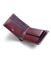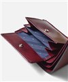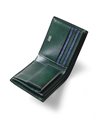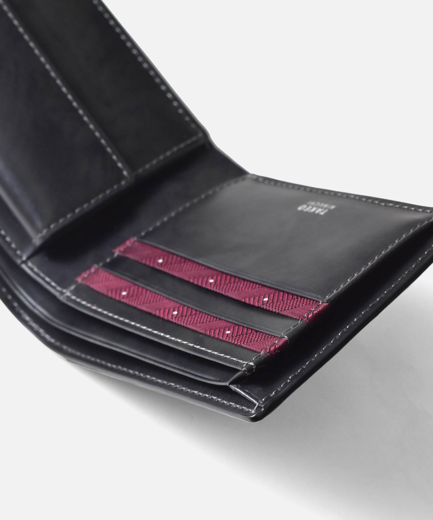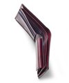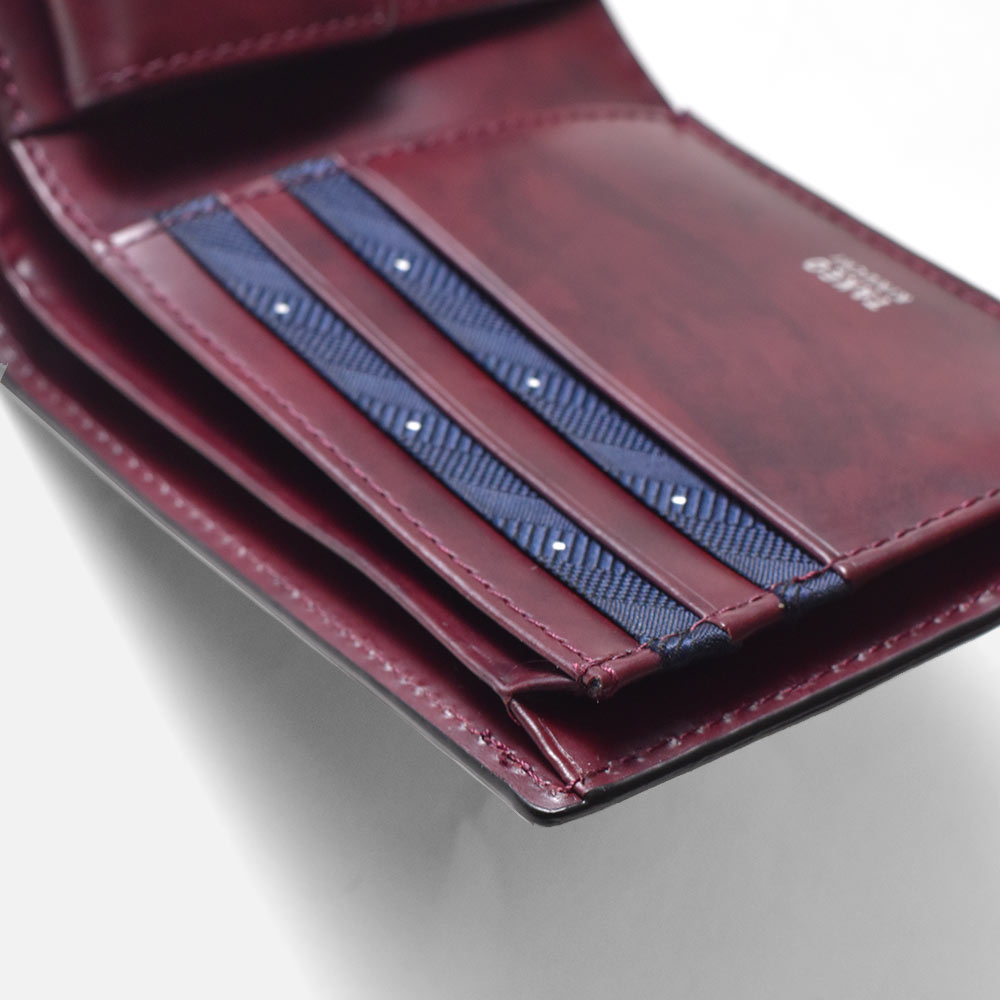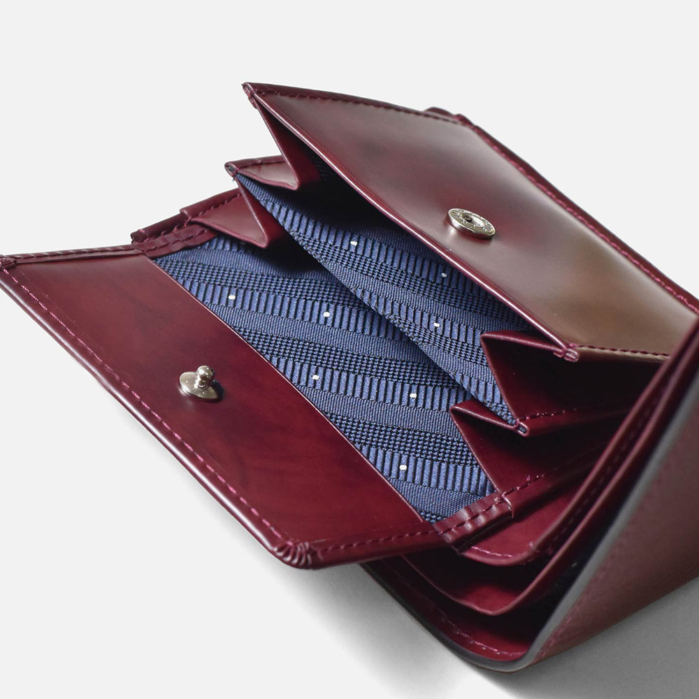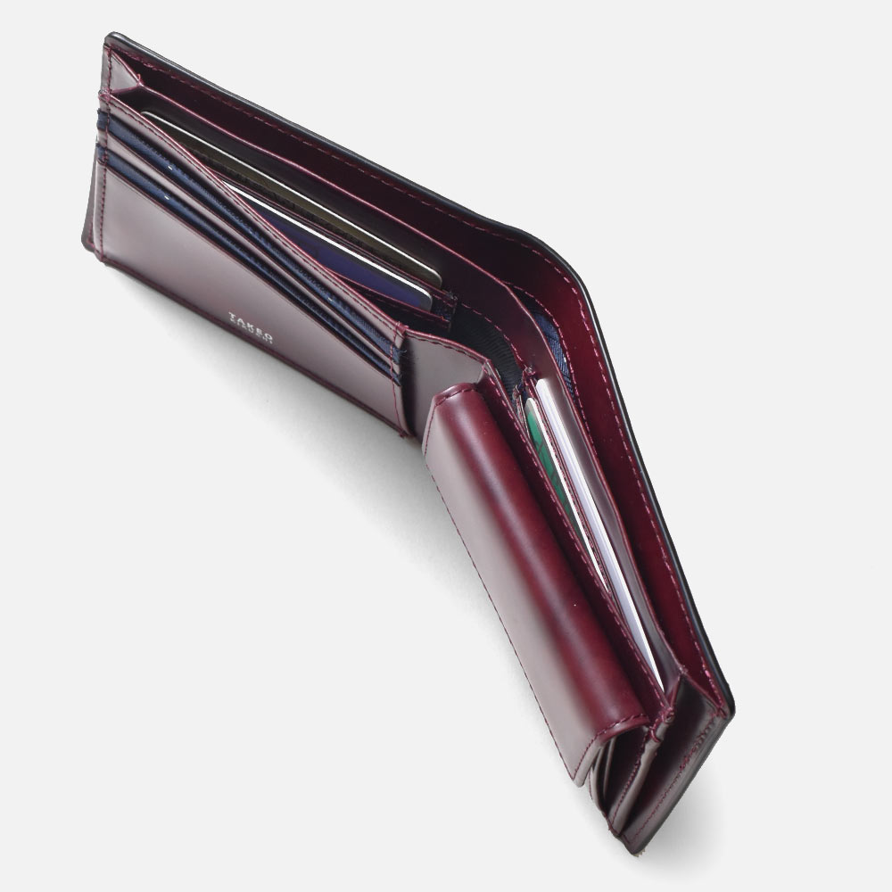 札室は2層で、内側にカード段が4つあります。マチ部分は風琴マチ仕様。風琴マチとは、アコーディオンの様にマチを外側に折られているマチです。内側にマチを折りこむササマチよりも、有効幅が広くなるため、引っ掛かりがなく紙幣を出し入れすることができます。 小銭入れは仕切り付きで、硬貨を分けて収納可能です。他にカード段が4つ、フリーポケットが3つあります。