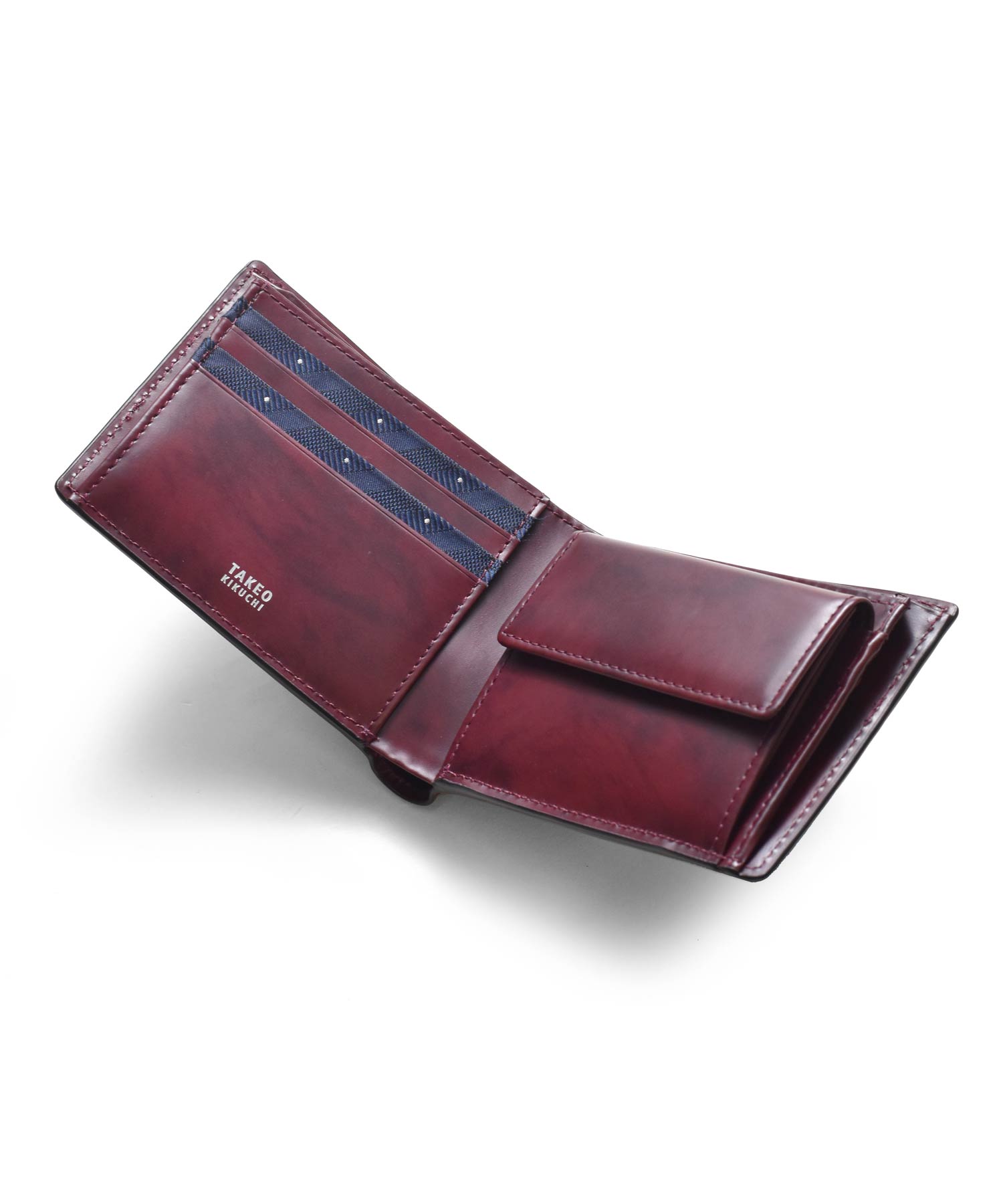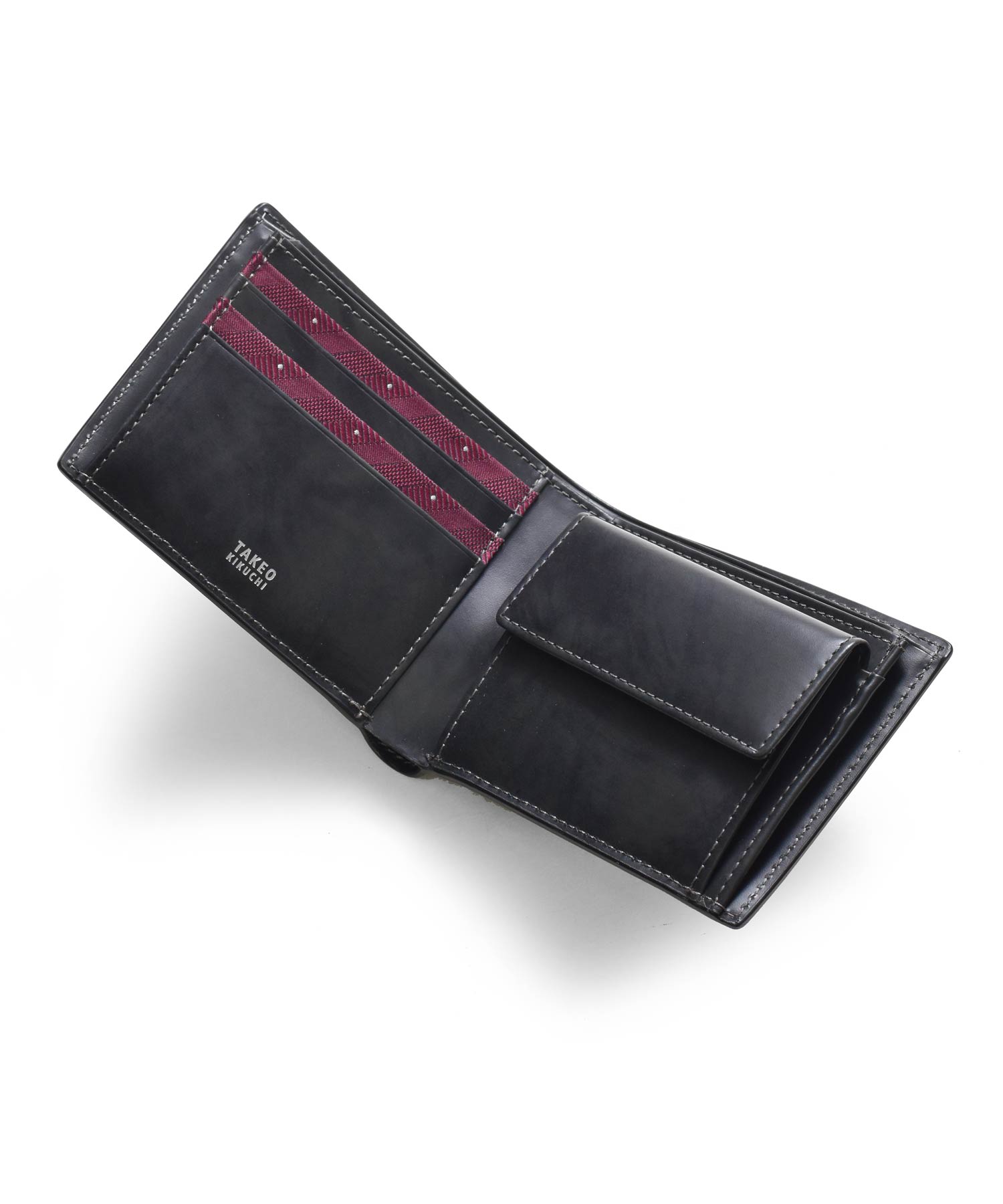 上質なイタリアンエンボスレザーを使用した、タケオキクチの二つ折り財布。繊細で上品な雰囲気が魅力の革財布です。札入れ部分は風琴マチとなっており、引っ掛かりがなく紙幣を出し入れすることができます。