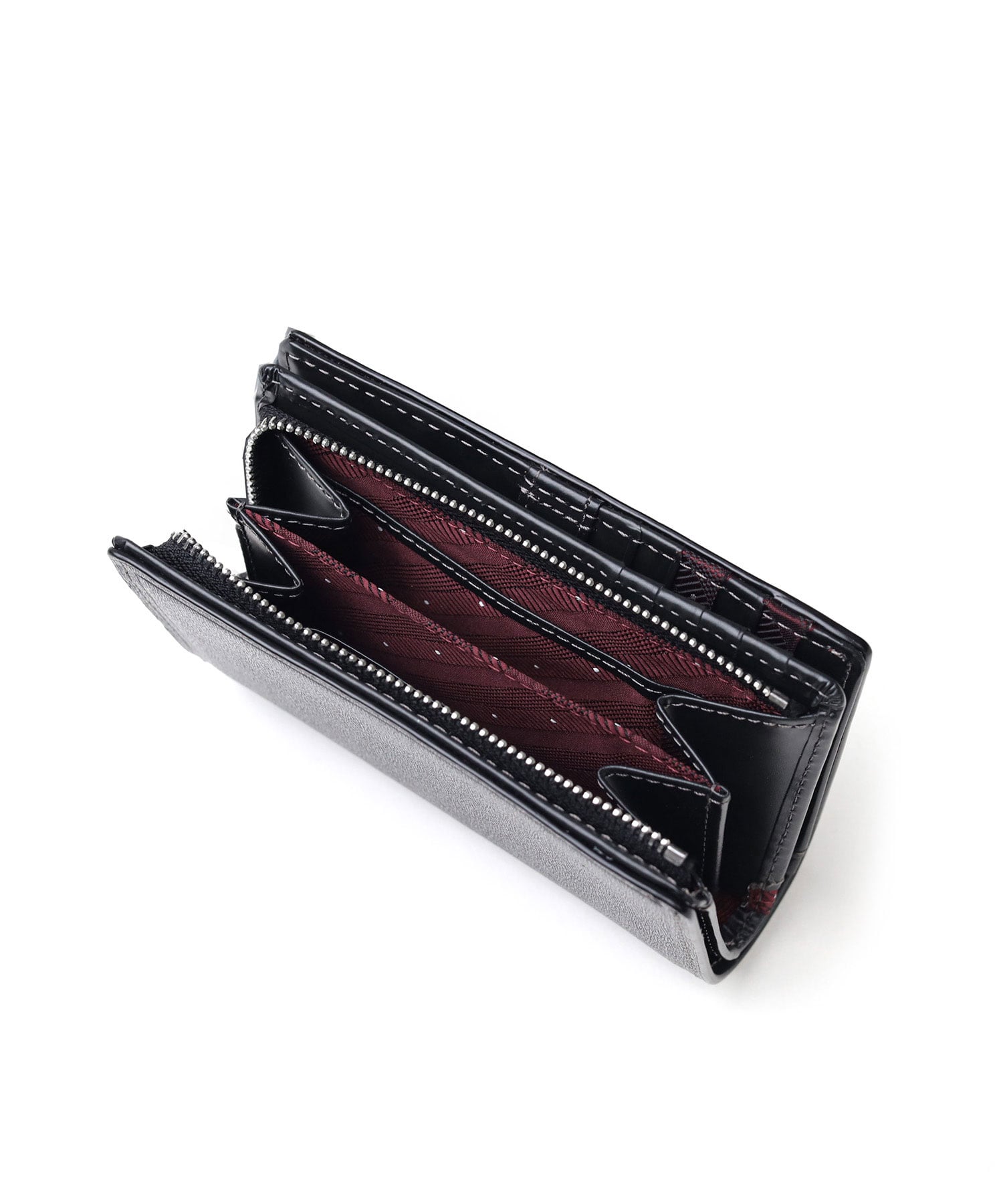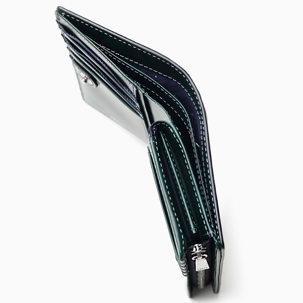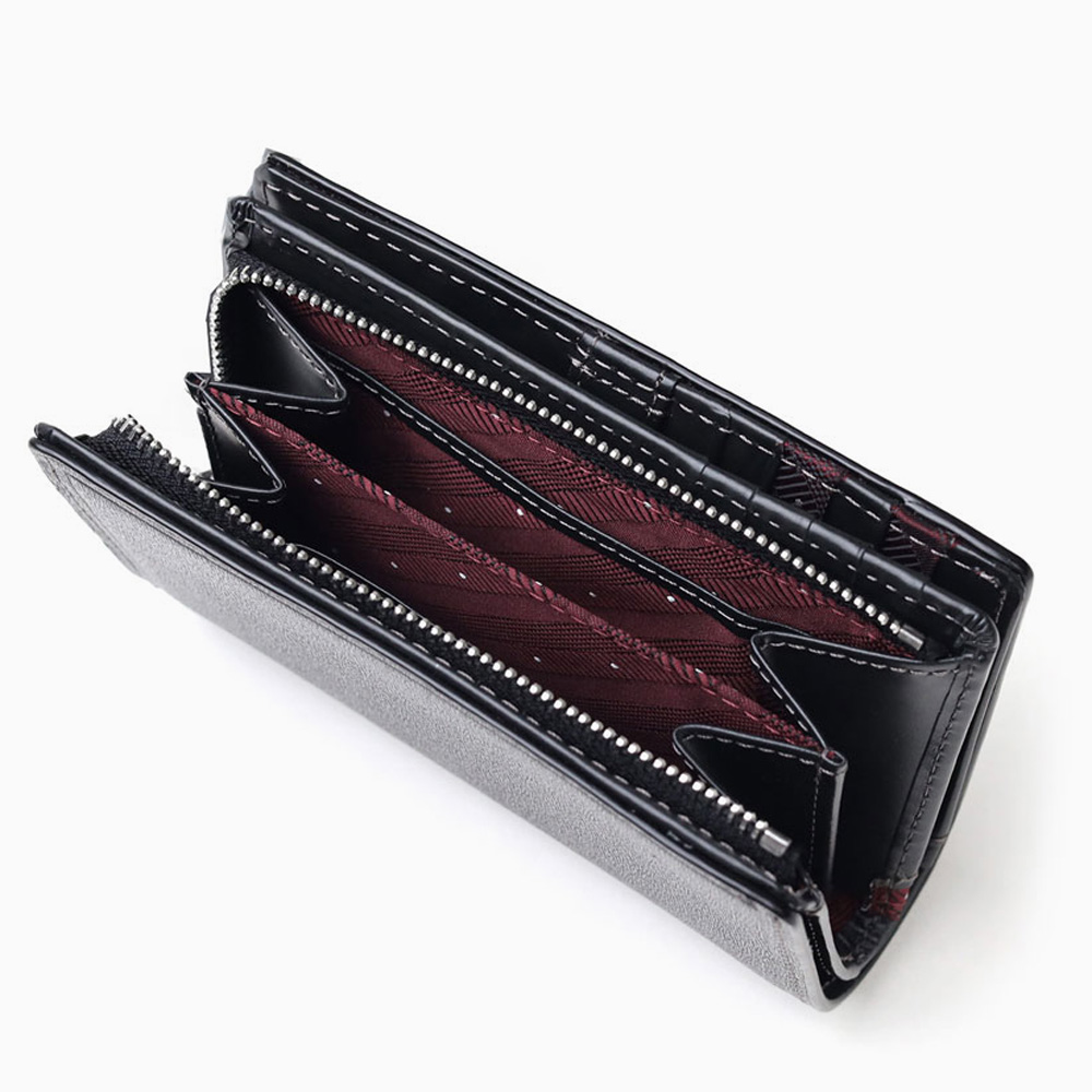内装にはフリーポケットが4つ、小銭入れ、小銭入れ内にポケットが2つ、札入れが2つ、カード段が合計10段あります。ポケットがたくさん備わっているので、コンパクトながらカードをたっぷり収納することができます。また、小銭入れがL字ファスナータイプで大きく開くため、視認性が良く取り出しやすい仕様になっています。