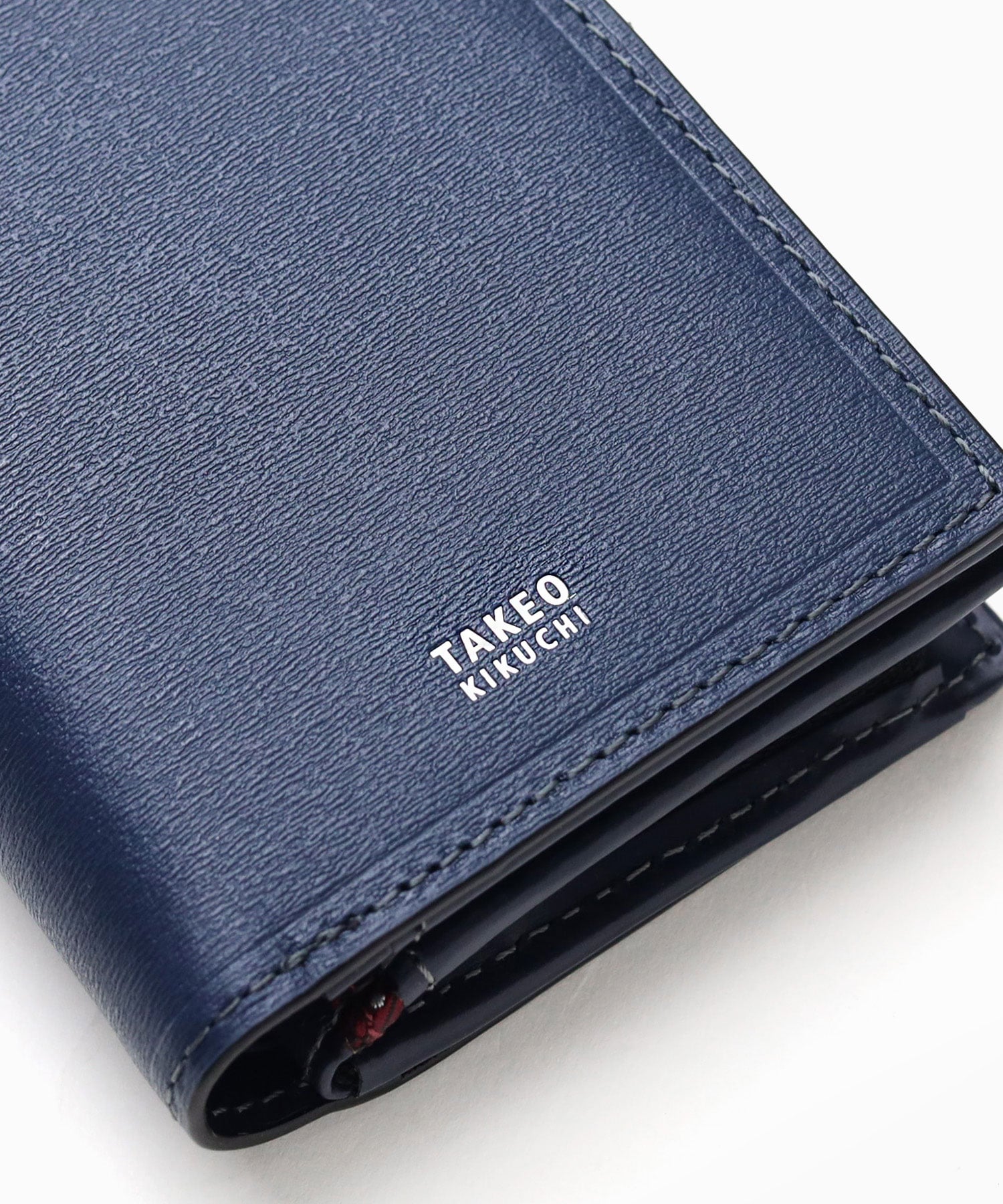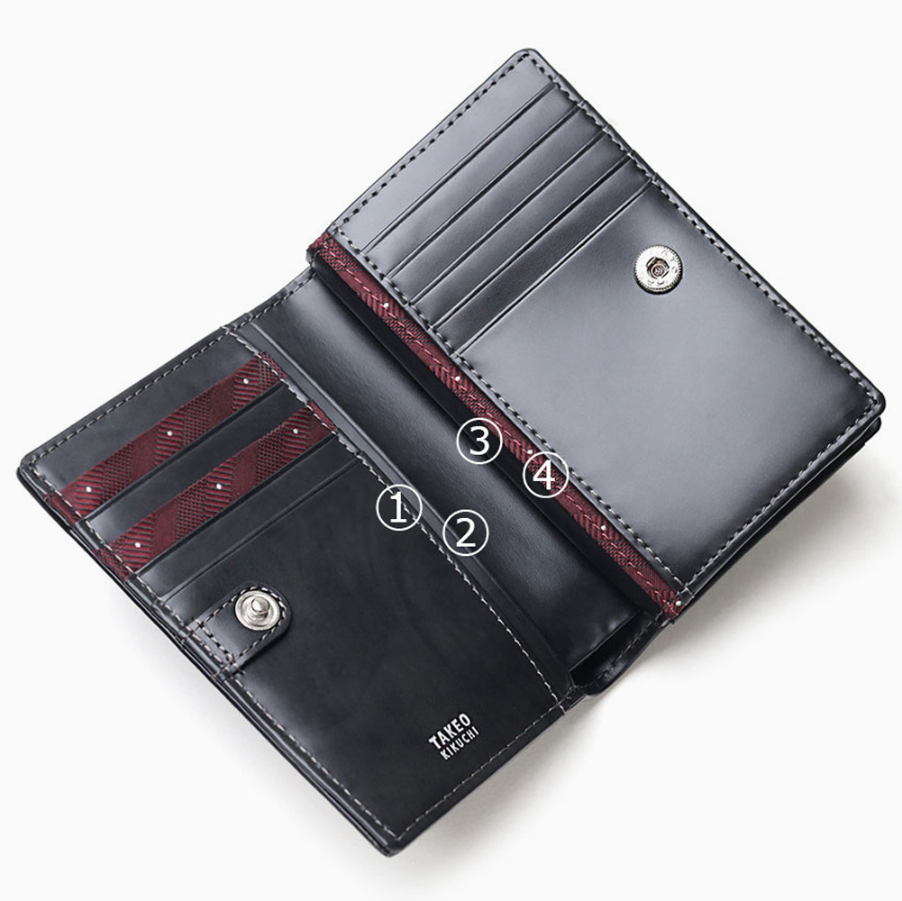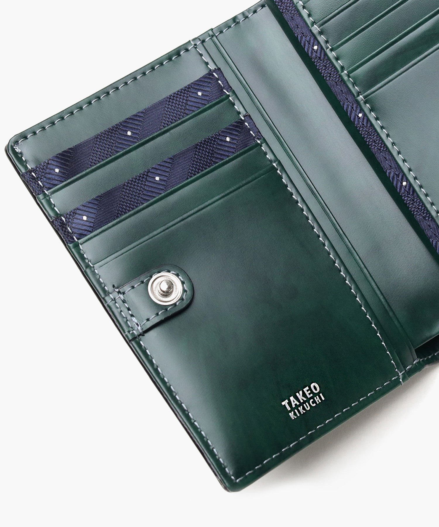 裏地には、TAKEO KIKUCHIを代表するネクタイ柄「ドットストライプ」が使用されています。本体色クロ・コンにはワイン色、本体色グリーンにはネイビー色と裏生地の配色も使い分けています。