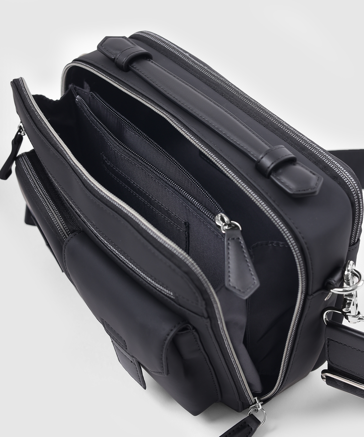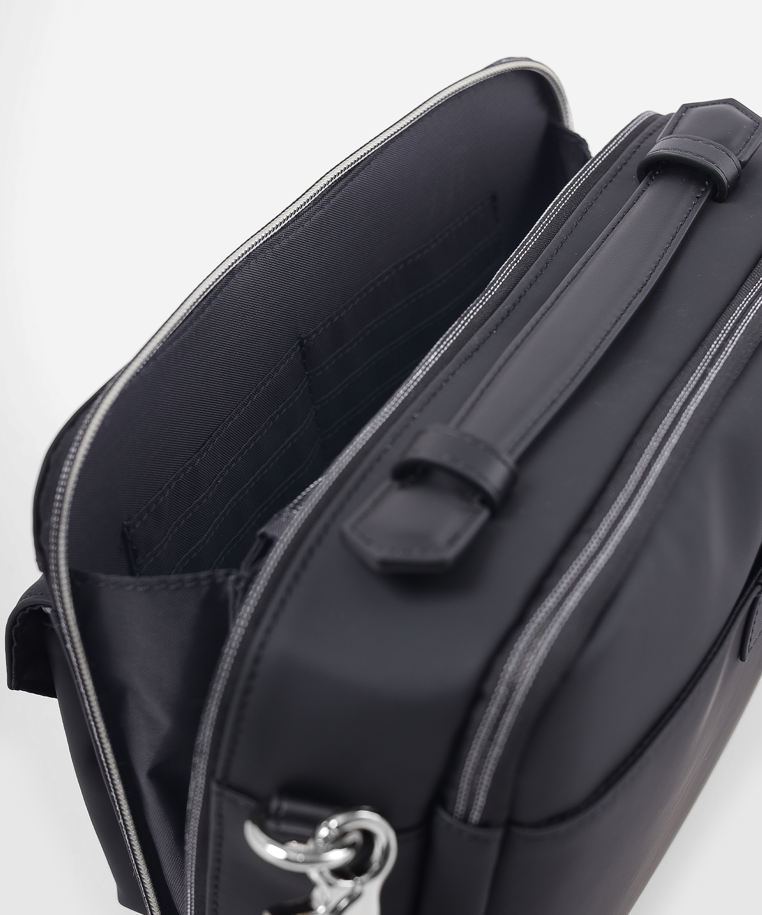 収納機能は外装に細かなものを収納できるようにポケットが4つ。内装メインルームはA5サイズの入る大きさで内側に小物を収納できるファスナーポケットとカードポケットが12個あります。
