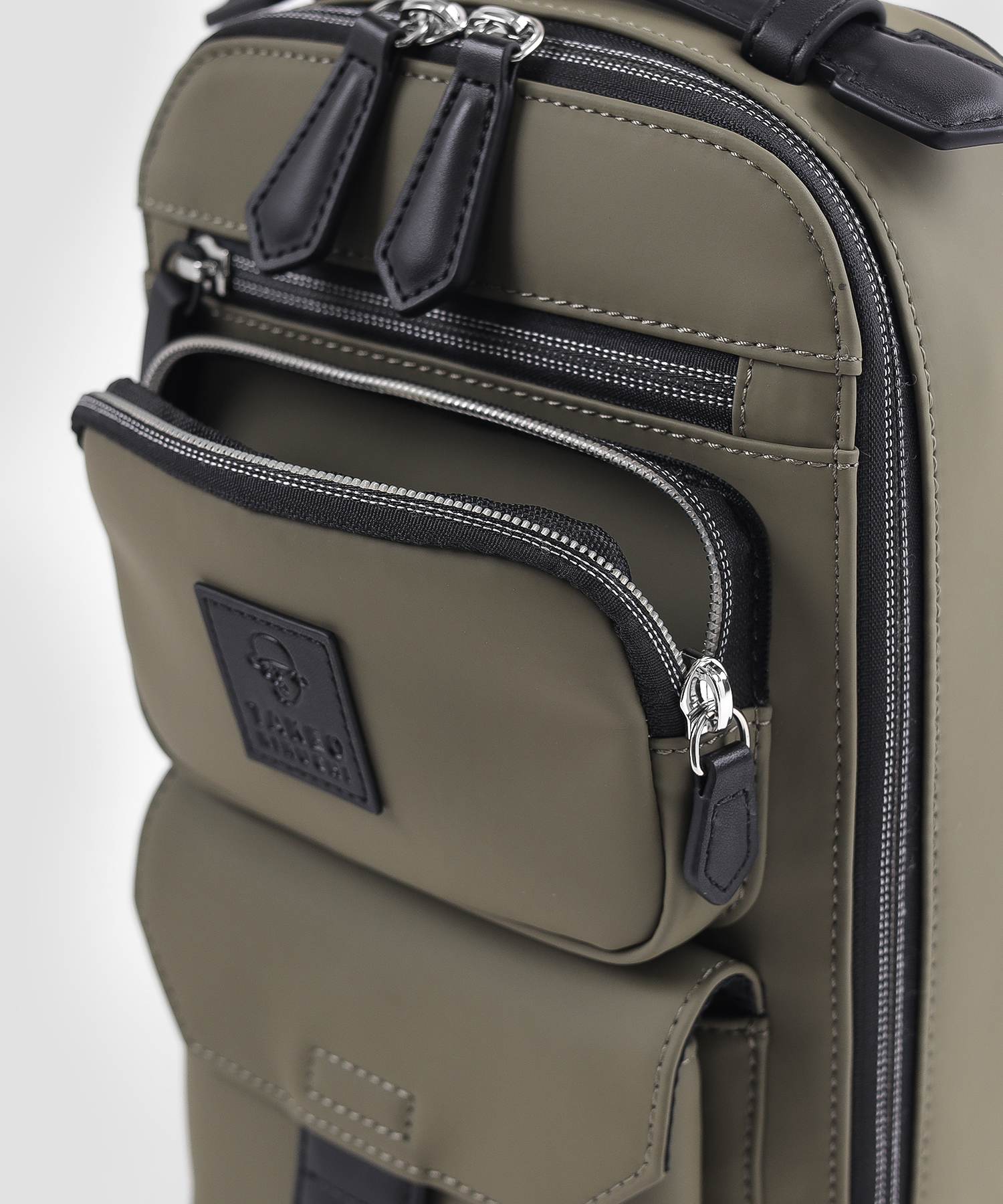 本体に使用されているポリカーボネートは、強靭な表面摩擦強度と高耐久性を有した素材で日々の使用でも気軽に安心してご利用いただけます。またタケオキクチのブランドタグや引手にはスプリットレザー(床革)を使用。このスプリットレザーは、本革を削った残り部分のため本来製品に使用するには手間と時間がかかるので廃棄されることがほとんどでした。しかし近年のサスティナビリティの観点からこのような廃棄予定のものを再利用するアップサイクルで生まれた持続可能な未来のための素材使用しています。