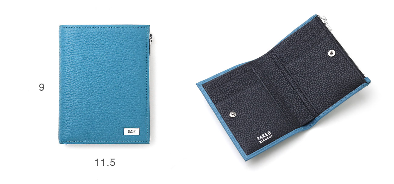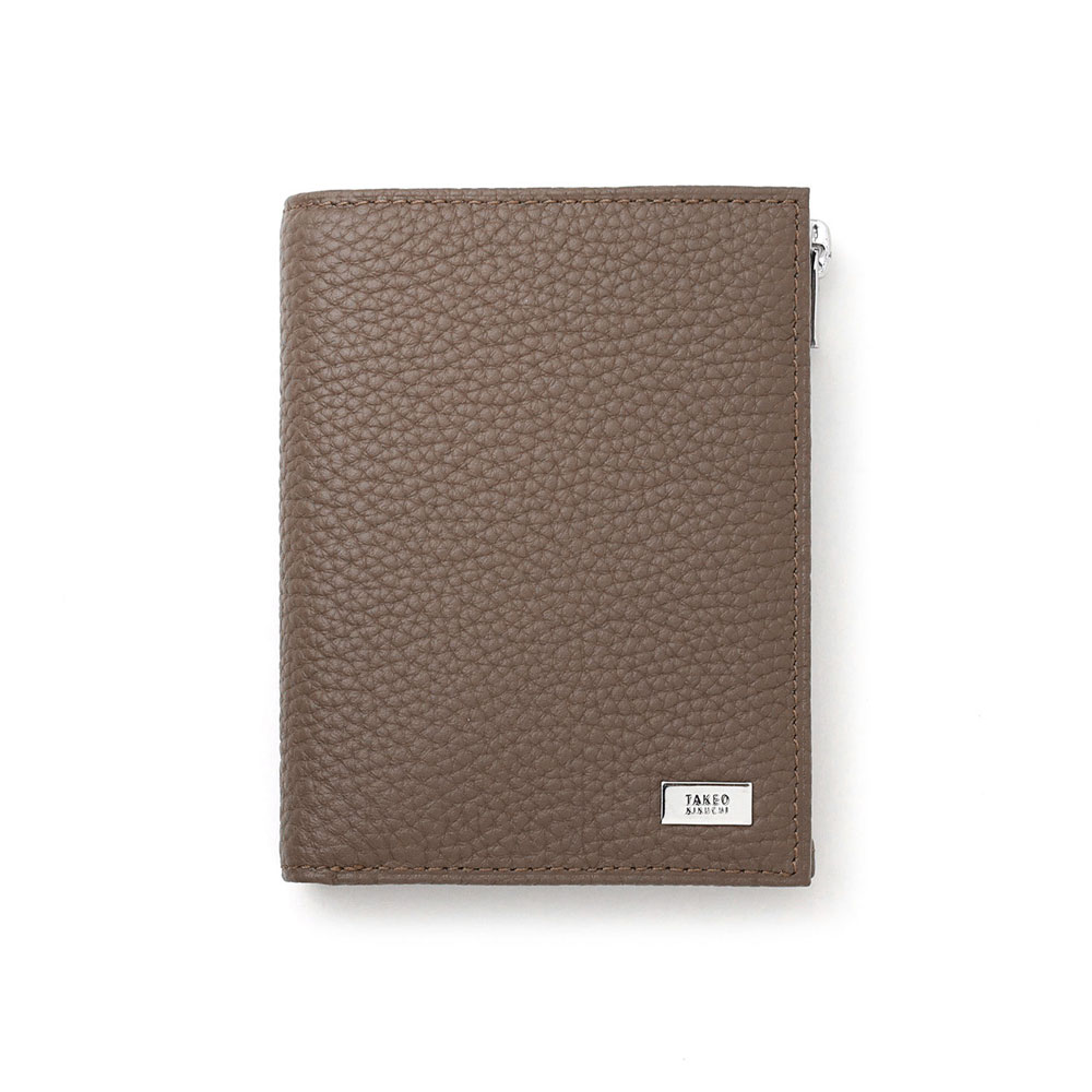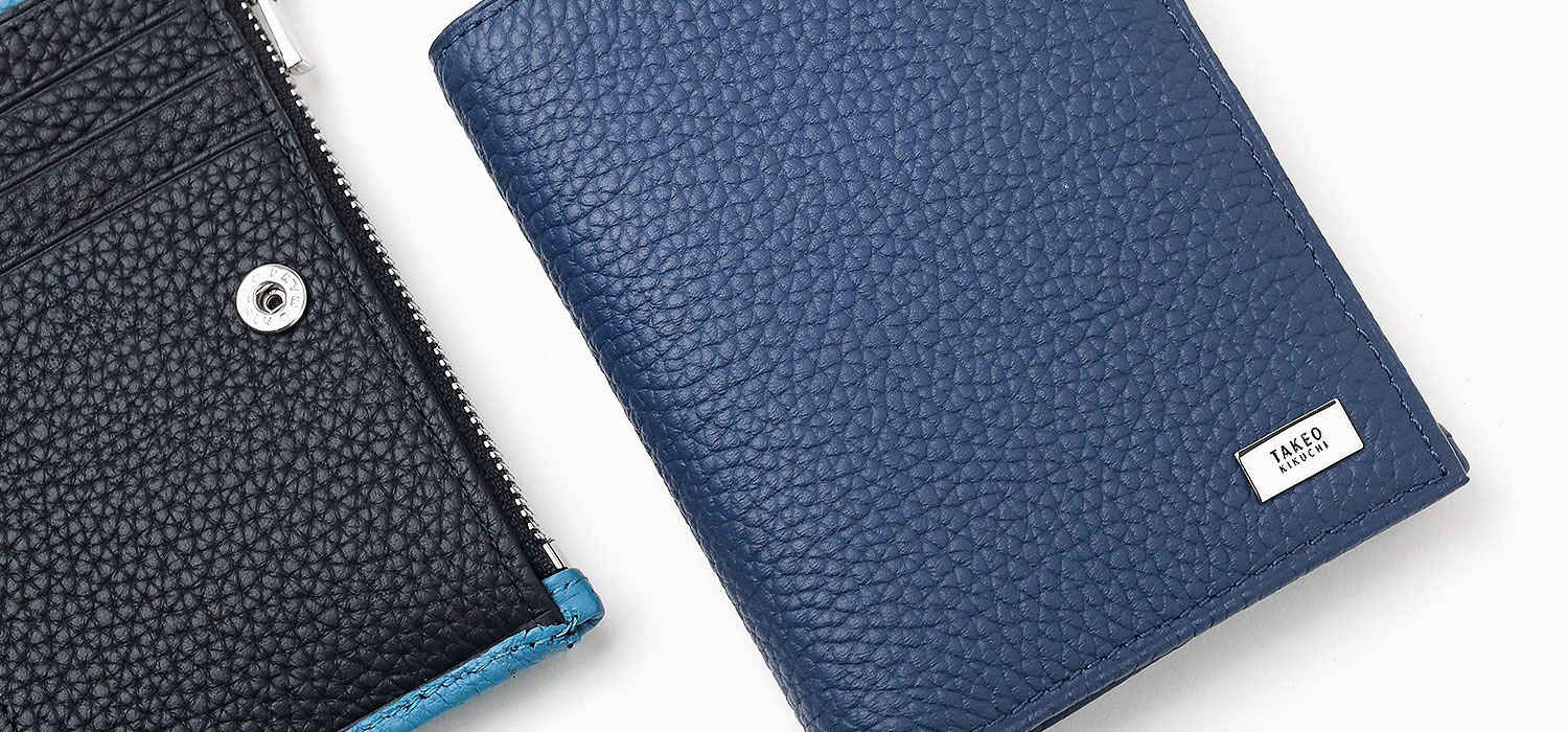 オールシュリンクレザーでソフトに仕上げた、タケオキクチのスリムな二つ折り財布。使いやすいよう設計したサイズ感で、キャッシュレス決済を快適にします。