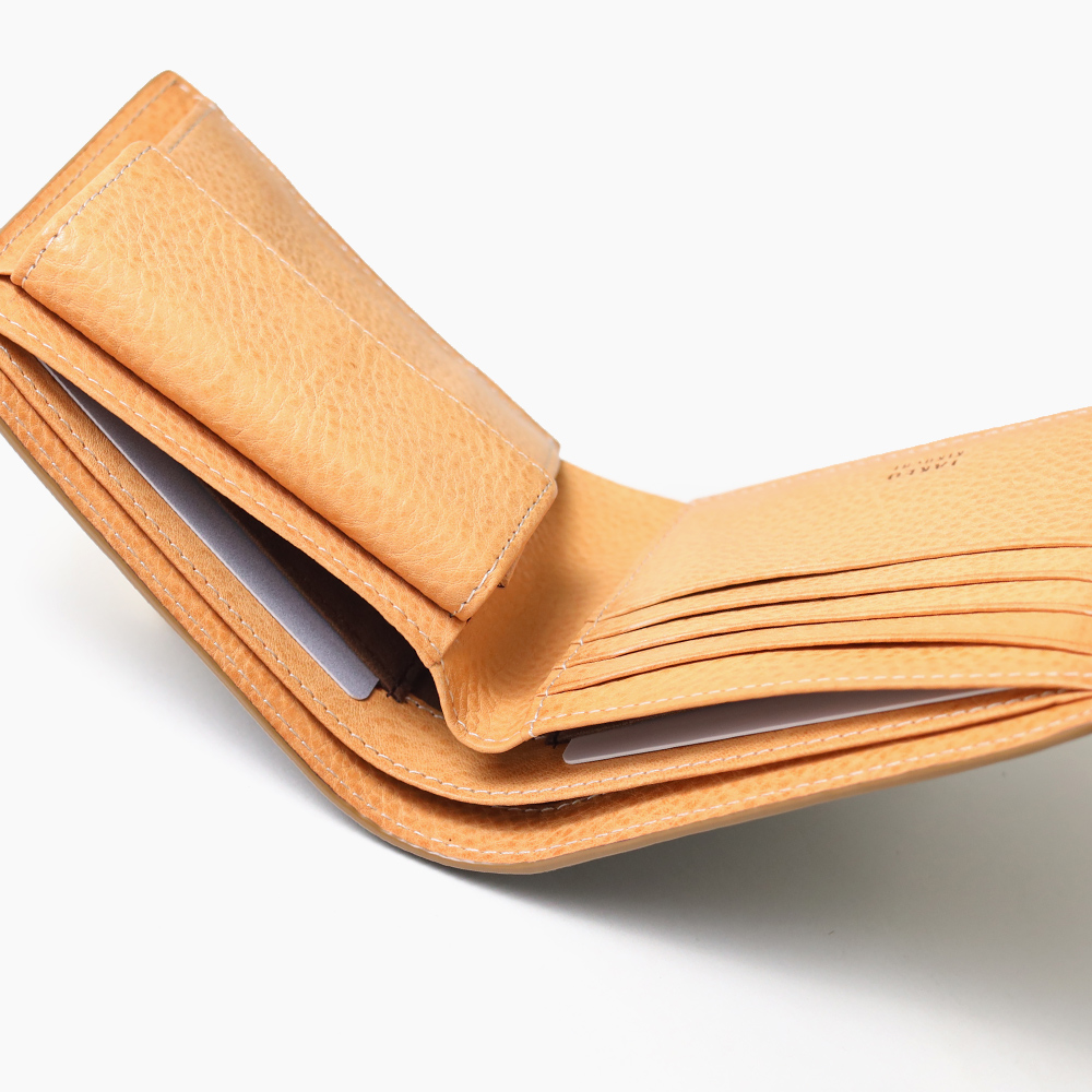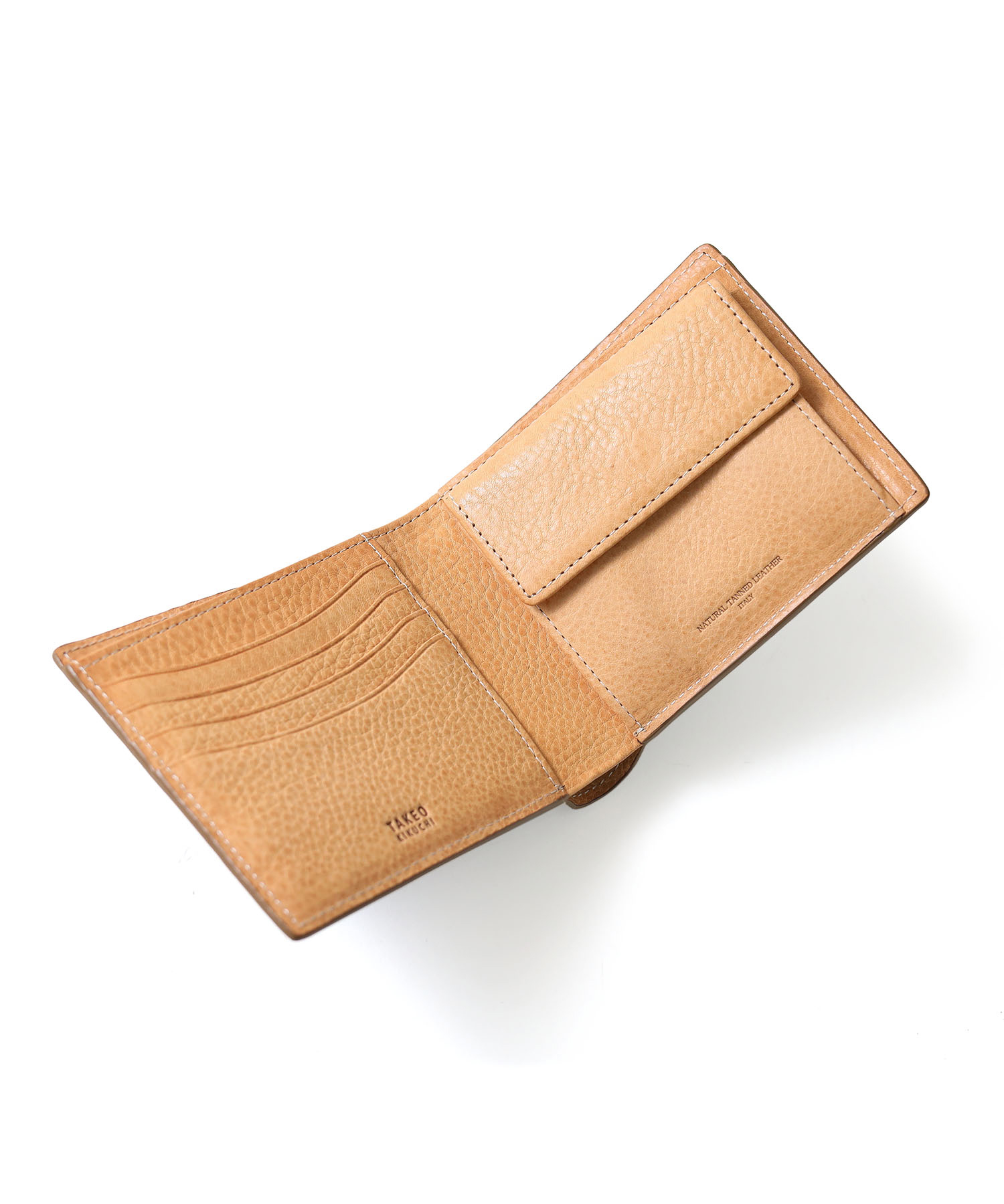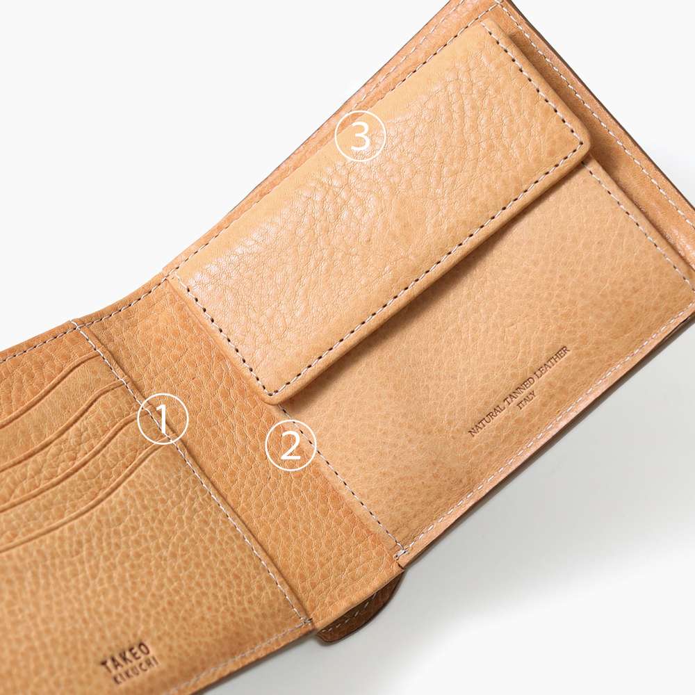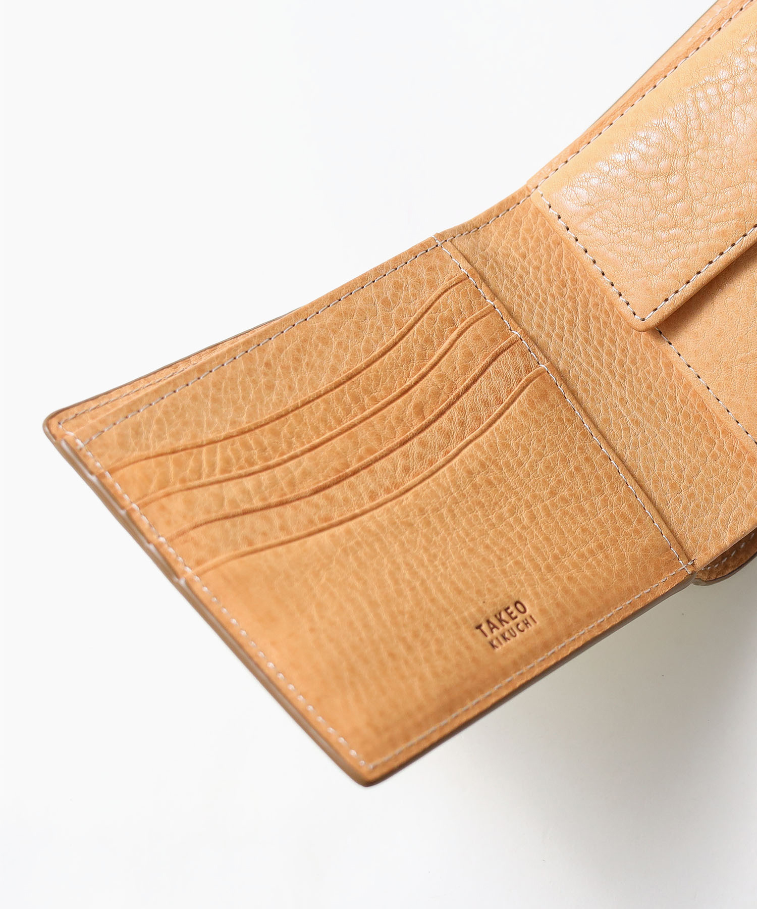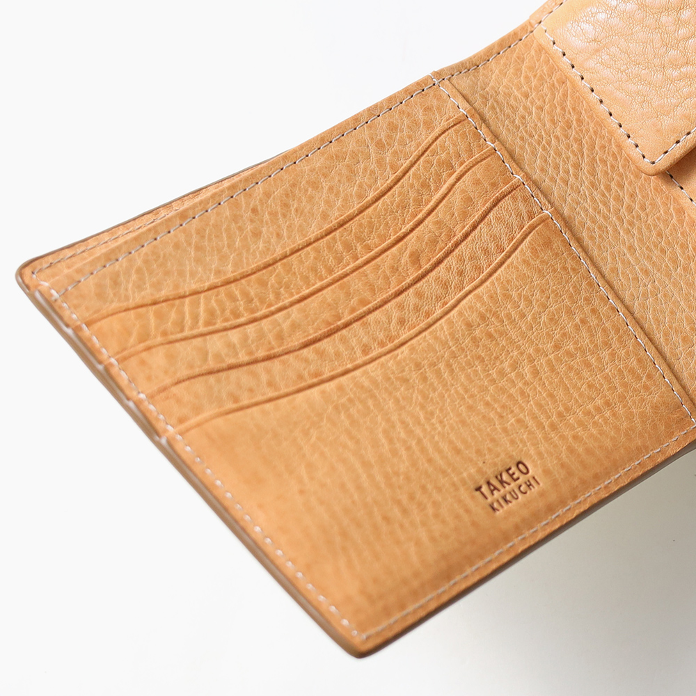 素材・デザインにこだわり、TAKEO KIKUCHIならではの男らしい二つ折り財布。札入れ・小勢入れが仕切り仕様になっていたり、札入れ内にカード段があるなど、プラスアルファで収納が可能です。