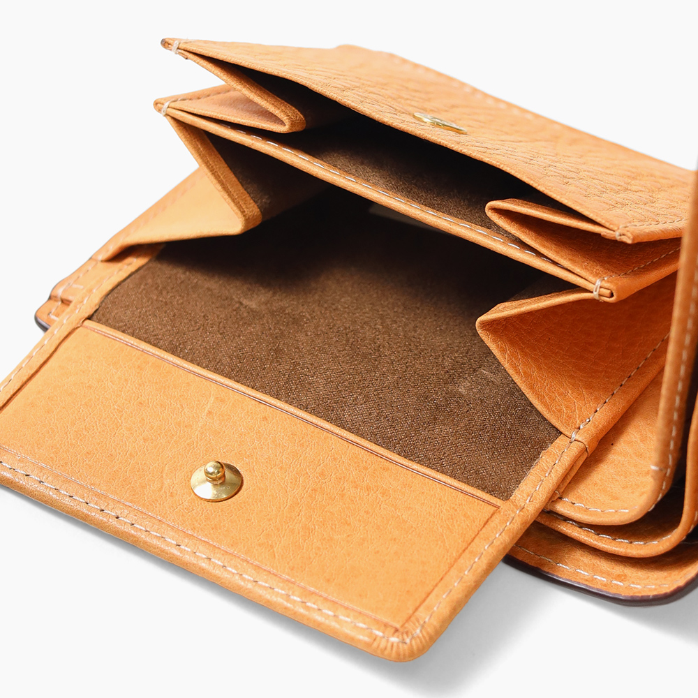 イタリア植物タンニン協会に加盟しているタンナー"ITLPEL<イタルペル社>"で鞣されたショルダーにベビーバッファロー調のエンボス加工を施しています。エンボス加工ながらも革らしい味わいと経年変化が楽しめる素材になっています。