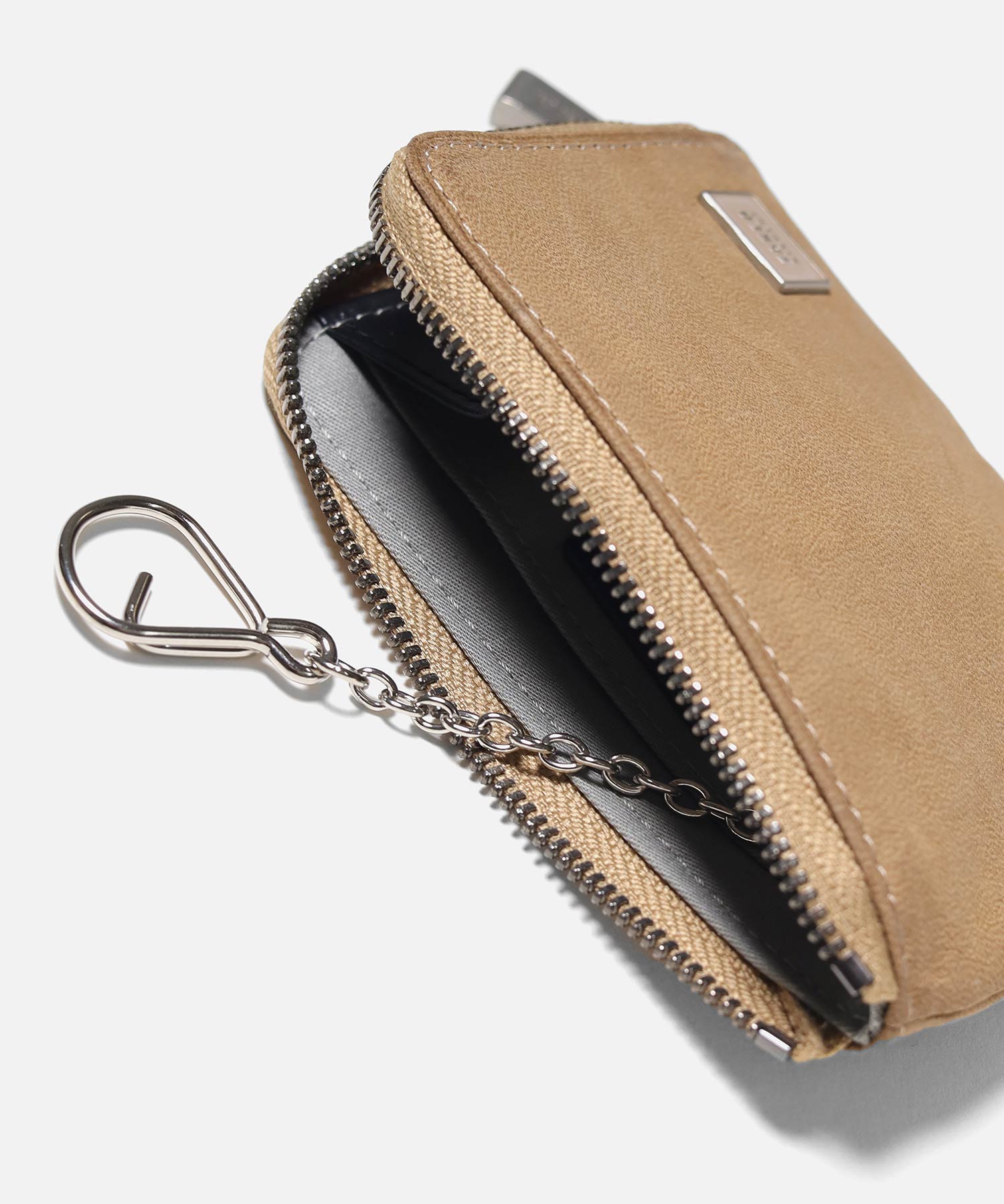 L字ファスナータイプの小銭入れで、片マチがついているため開きやすく、硬貨の出し入れがしやすいつくりです。メインコンパートメント内にはキーチェーンが1つと、カード収納が可能なポケットが1つあります。